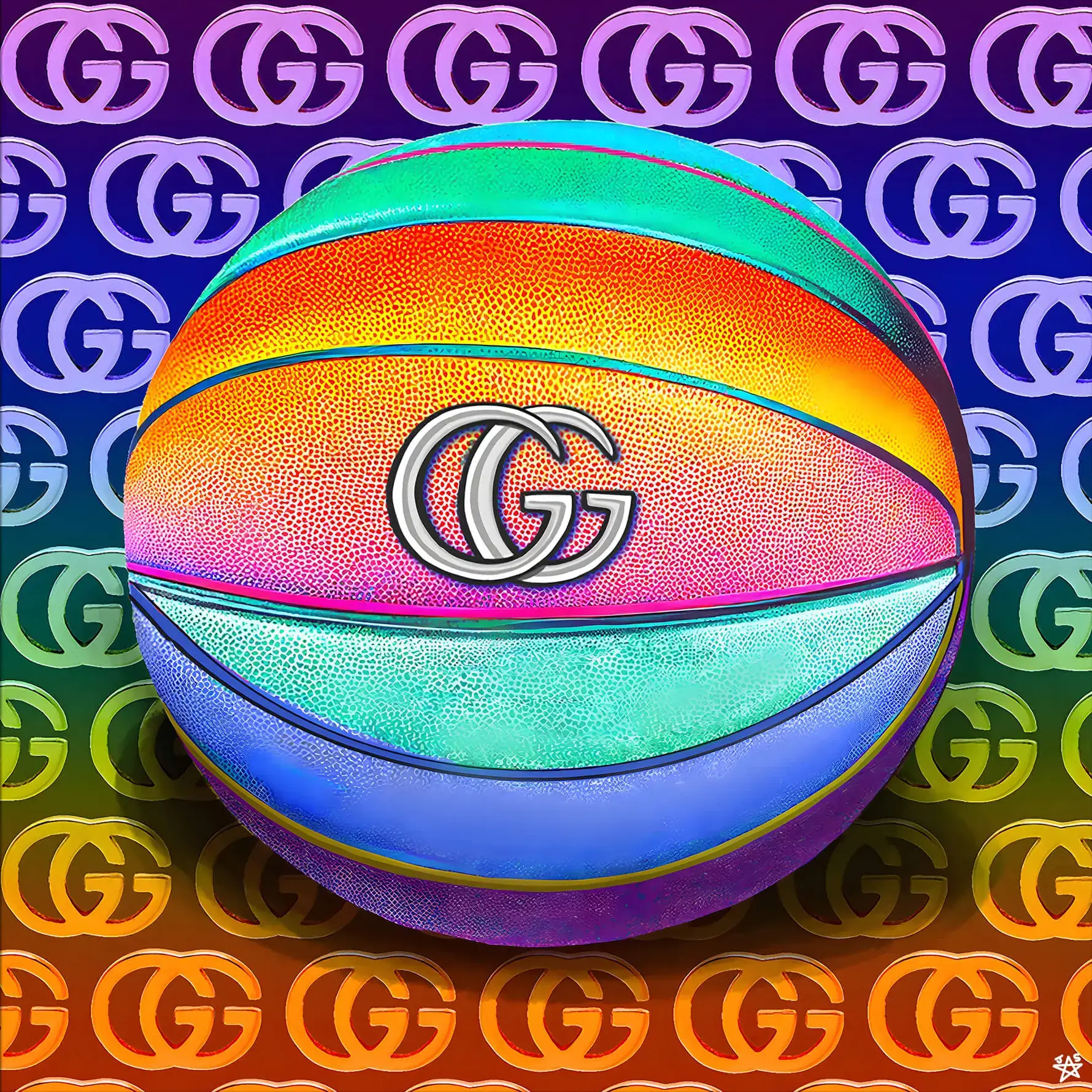 A basketball with a gradient of rainbow colors and a prominent Gucci logo in the center is set against a background patterned with the same logo. The ball’s texture is detailed, suggesting a tactile surface. The repeating logo in the background varies in shades of purple and gold, creating a luxurious feel. The image represents a fusion of sports with high fashion design.