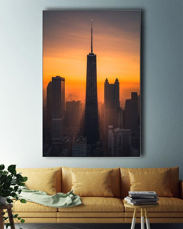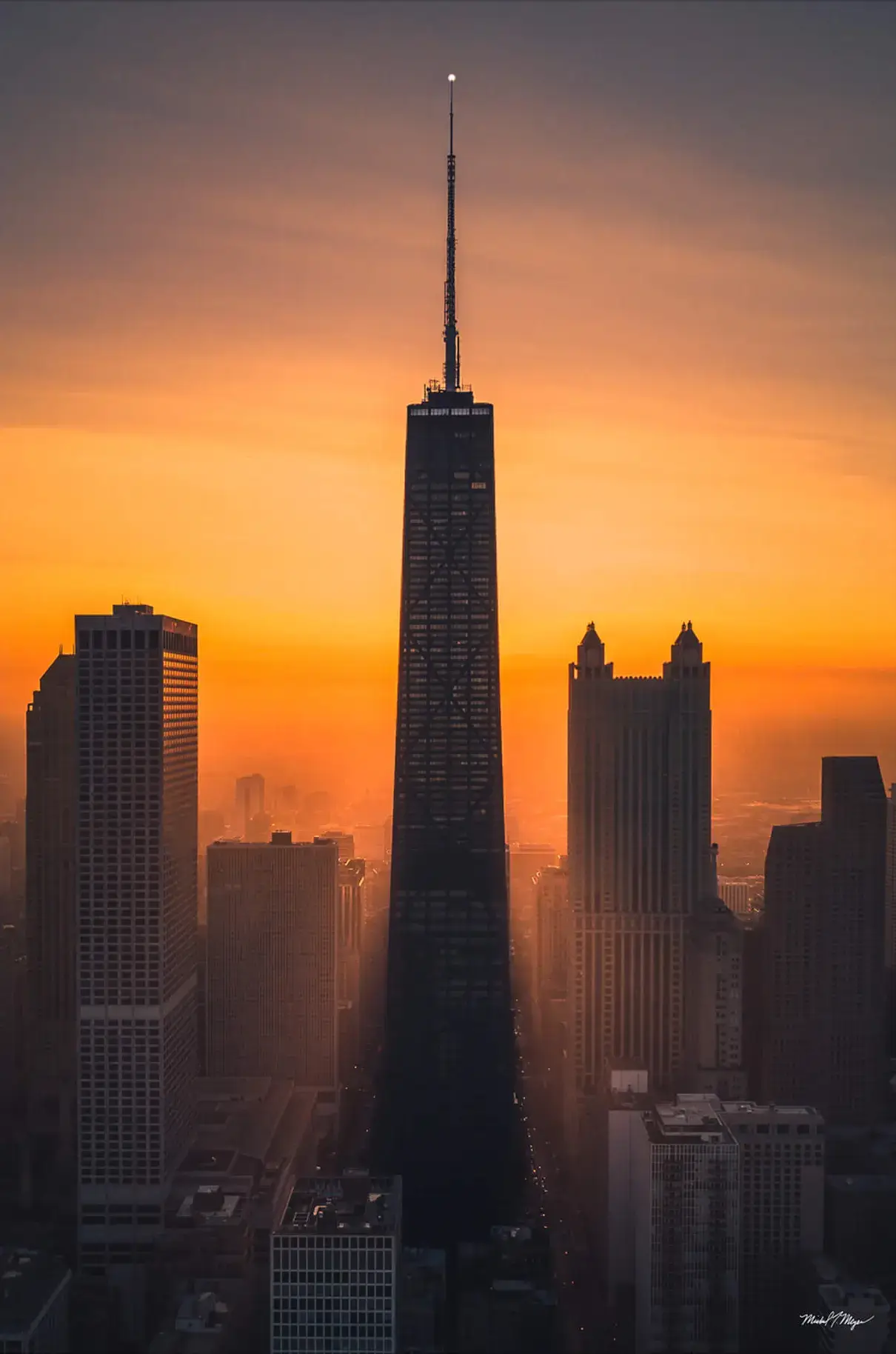 The John Hancock Center stands as a beacon against the dawn sky, its silhouette defined by the warm glow of the rising sun. The building’s distinctive antennae reach towards the heavens, piercing the orange gradient of the morning light.