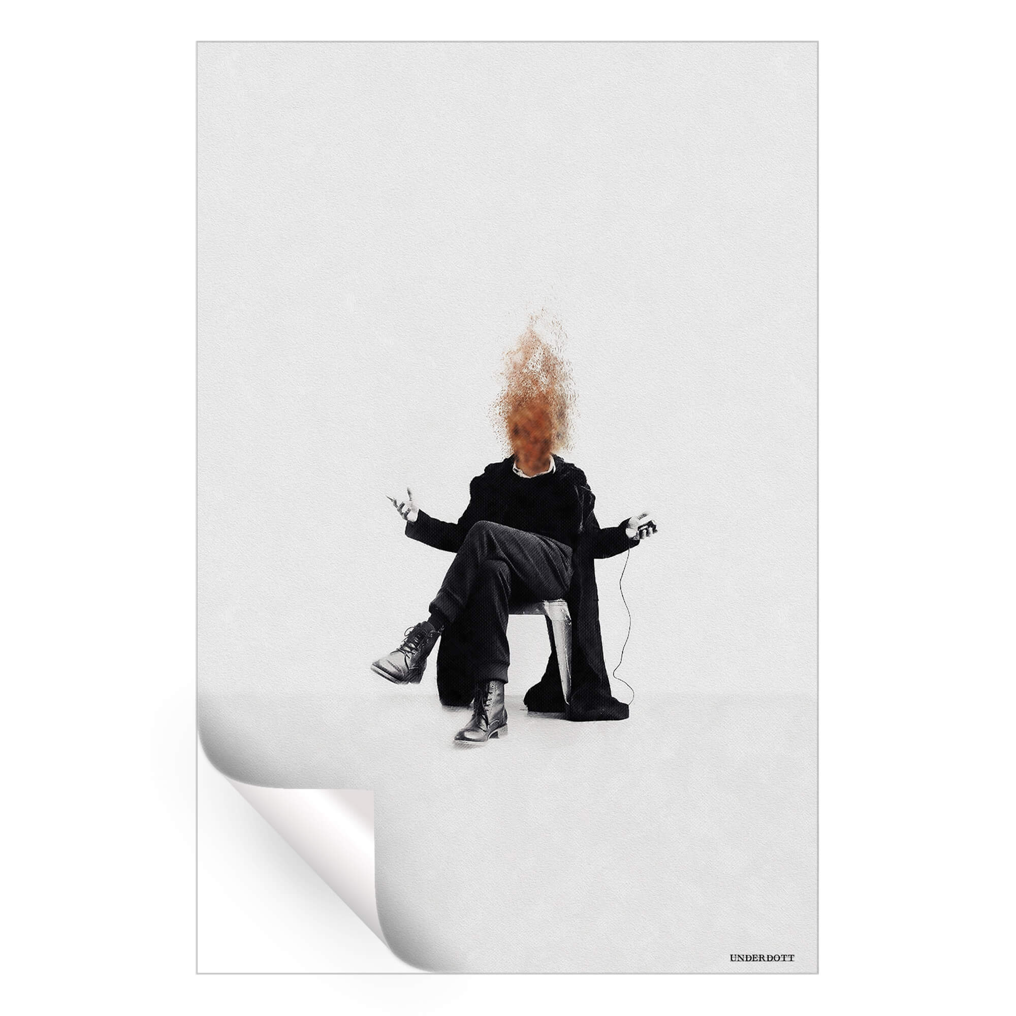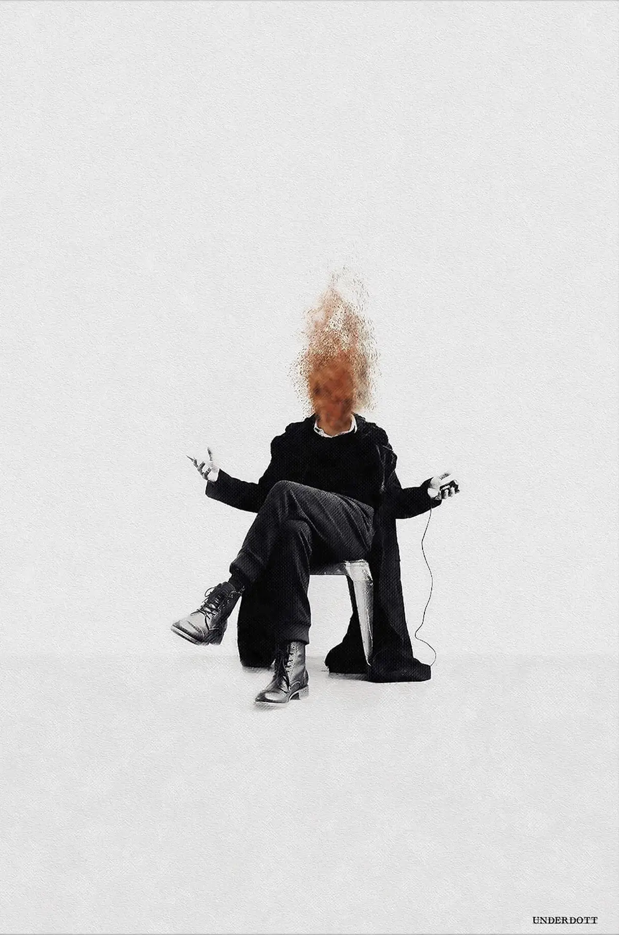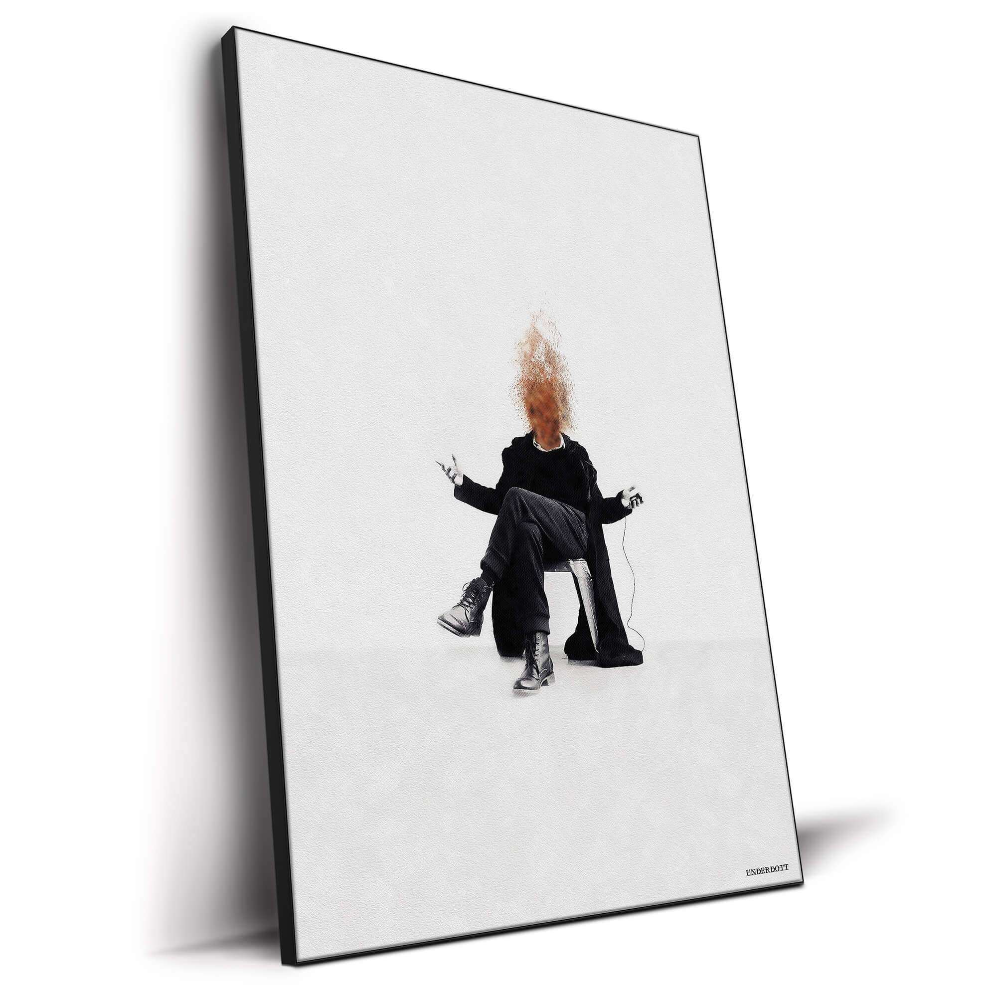 Born from the restless mind of Underdott, the painting balances minimalist composition with rebellious symbolism. Underdott blends punk-era DIY texture with digital precision, often erasing or distorting human features to challenge identity and conformity. The frayed head in this artwork mirrors the artist’s recurring theme of internal chaos made visible, while the near-clinical background echoes his fascination with emptiness around loud ideas. Collectors who enjoy his other print designs will recognize the same wit and controlled anarchy here.