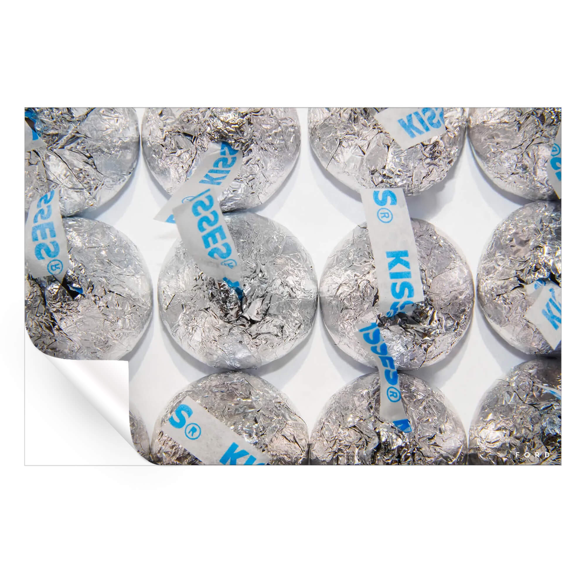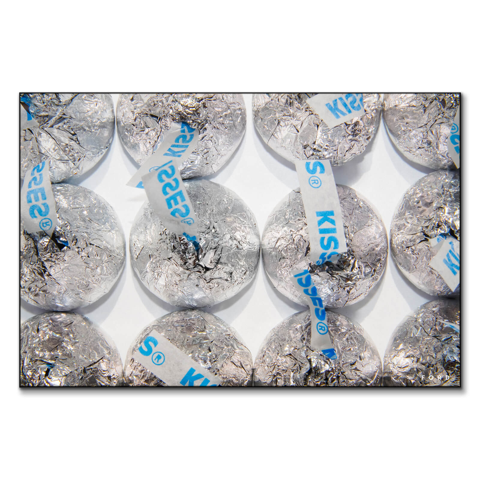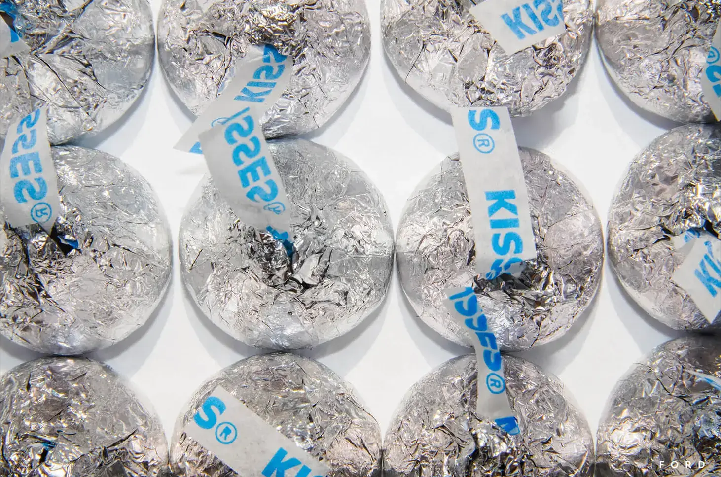 Silver foil-wrapped Hershey kisses are clustered together, their flat bases forming a neat pattern against a white background. Each piece is marked with the iconic paper plume bearing the “Kisses” logo, which peeks out from the top, adding a hint of light blue to the metallic scene. The crinkled texture of the foil catches the light, emphasizing the shape and form of the confections.