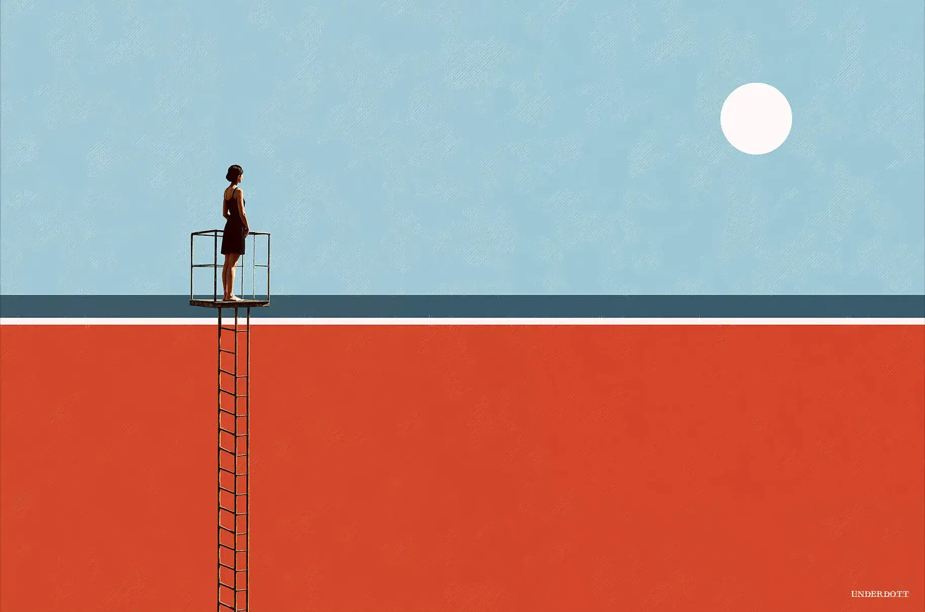 A minimalist exploration of height, space, and solitude, this artwork features a single figure standing atop a narrow diving platform above a vast expanse of red and blue. The clean lines and flat planes of color create a striking sense of contrast and scale. It’s both architectural and emotional—quiet yet powerful.