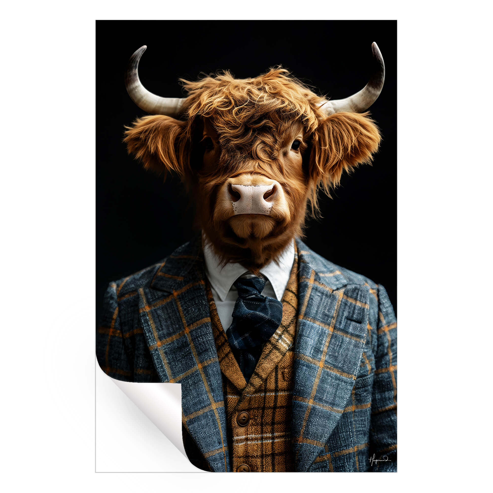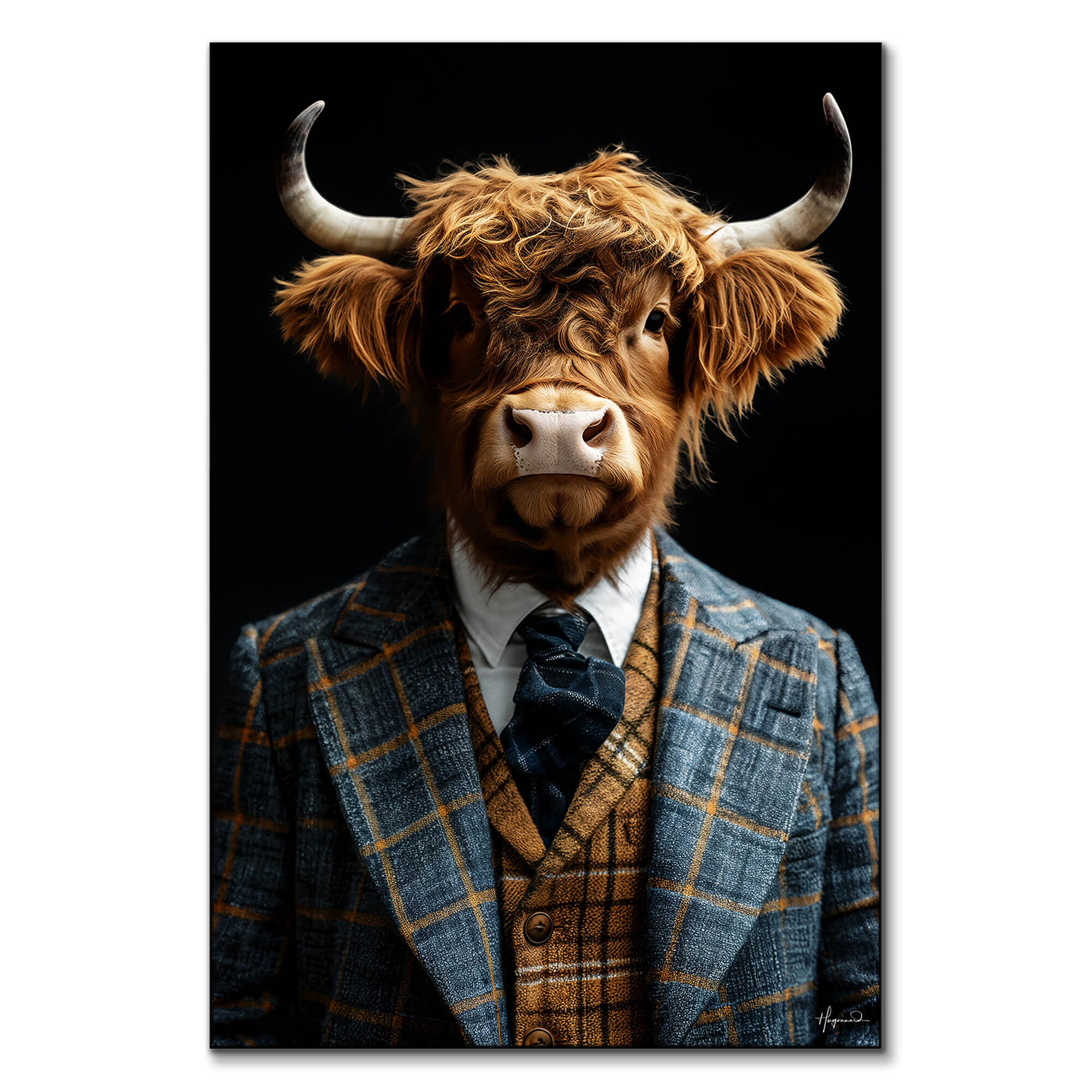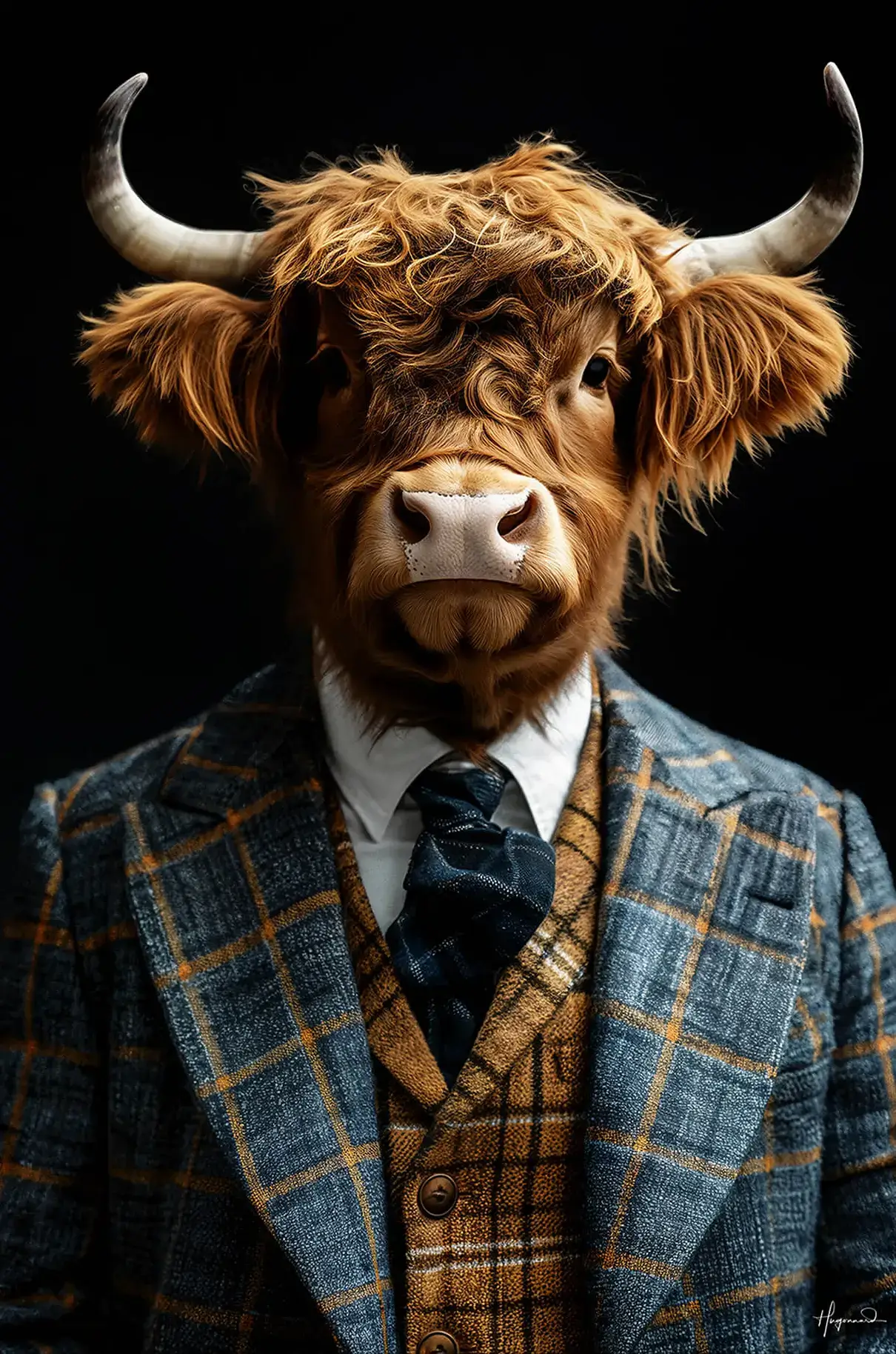 A Highland cow dressed in a sophisticated plaid suit combines rustic charm with elegant style. The textured features of the cow and the intricate details of the outfit create a striking and memorable visual.