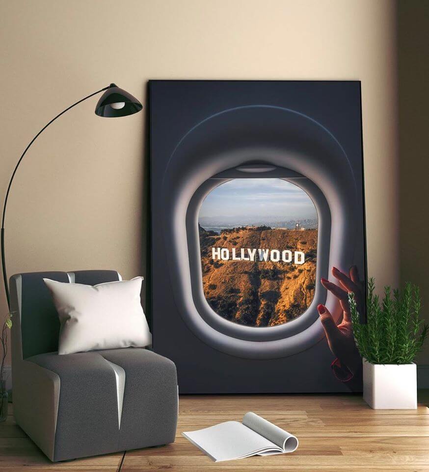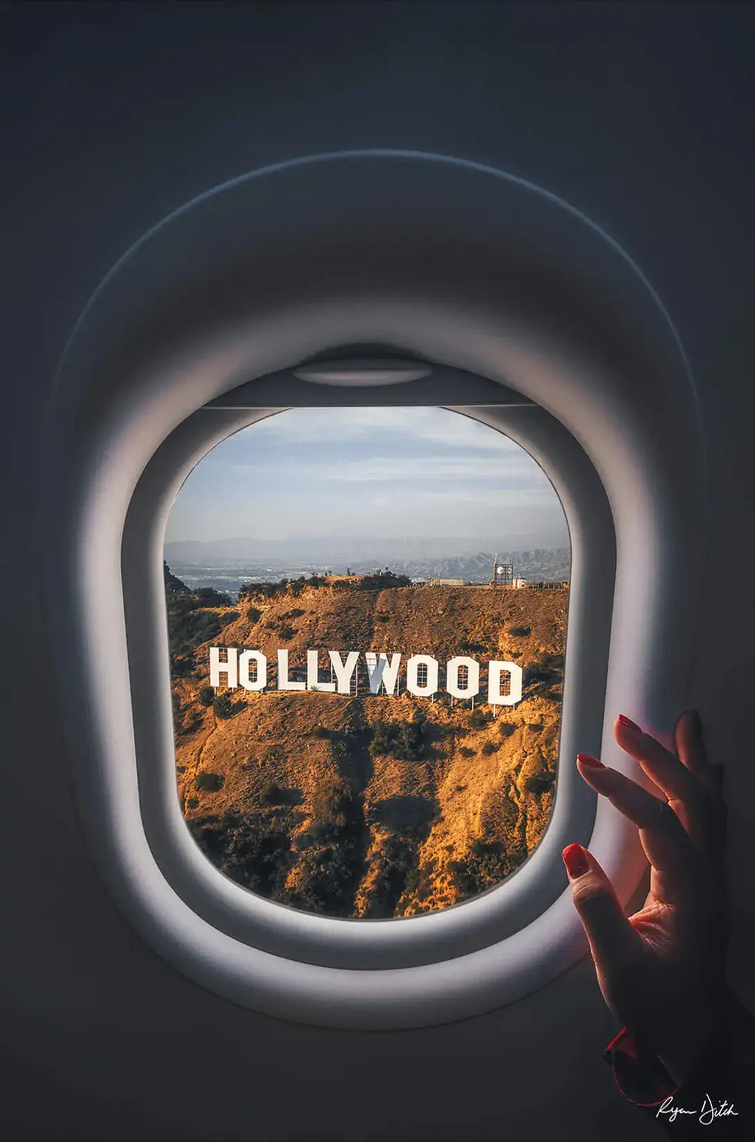 Glimpsed from the window of a plane, the iconic Hollywood sign stands proudly on the sun-drenched hills of California. This unique perspective offers a moment of anticipation and excitement, the sign serving as a beacon to dreamers and creators alike. The outstretched hand in the foreground adds a personal touch, capturing the longing of those drawn to the allure of Tinseltown.