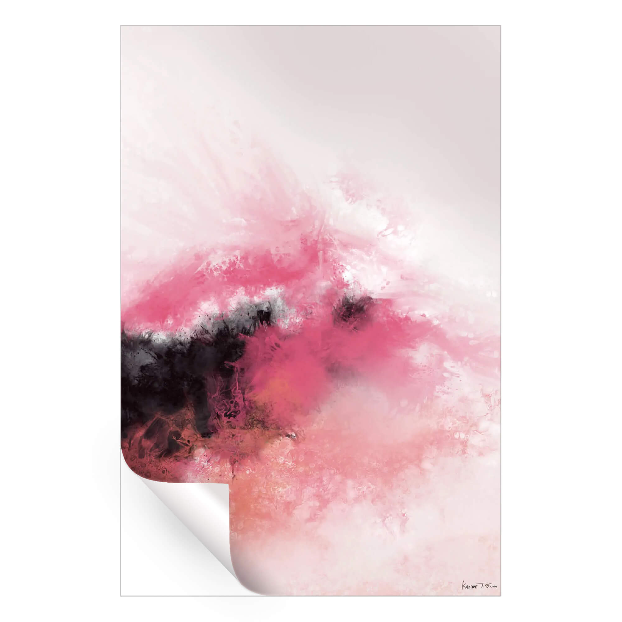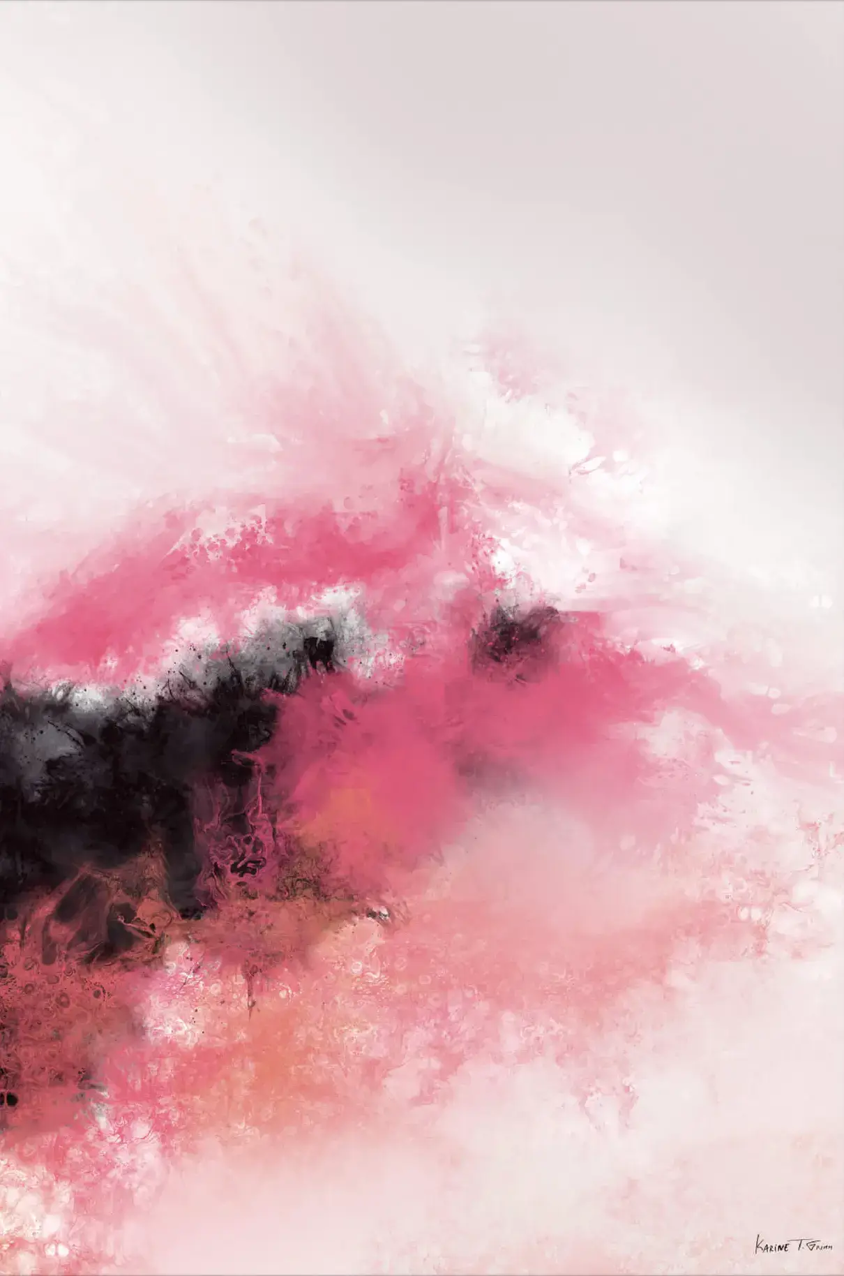 Embrace the vibrancy of Karine Tonial Grimm’s abstract expression, where hot pink brushstrokes dance fervently across the canvas, mingling with whispers of white and accents of deep black. This piece captures the dynamism of color, evoking a sense of passion and movement.