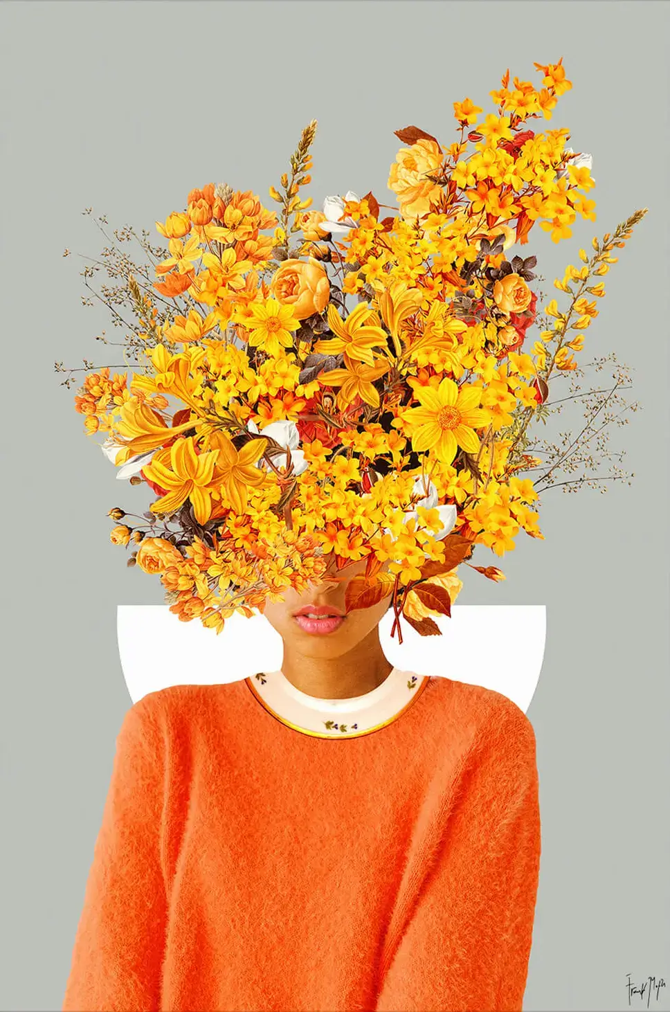 A subject is adorned with a vibrant bouquet that obscures their head, a riot of yellow and orange blooms that radiate with energy. The colors of the flowers are echoed in the subject’s orange top, creating a visual harmony that’s both bold and serene.