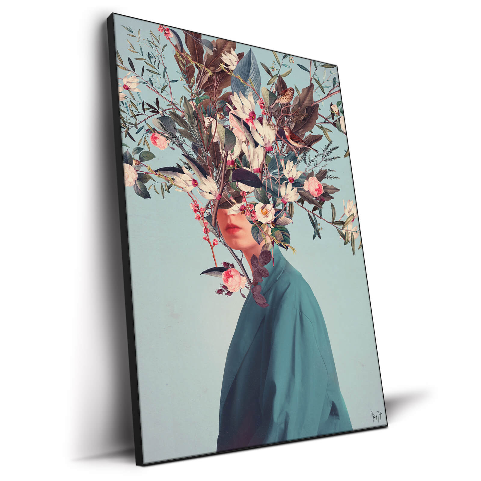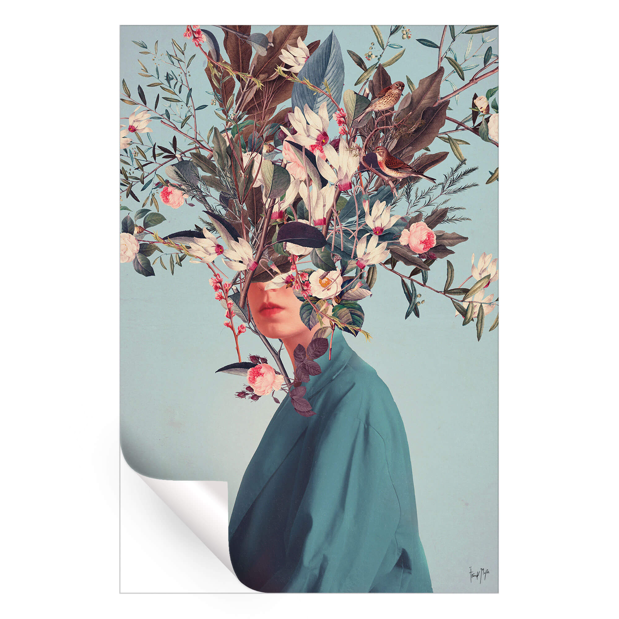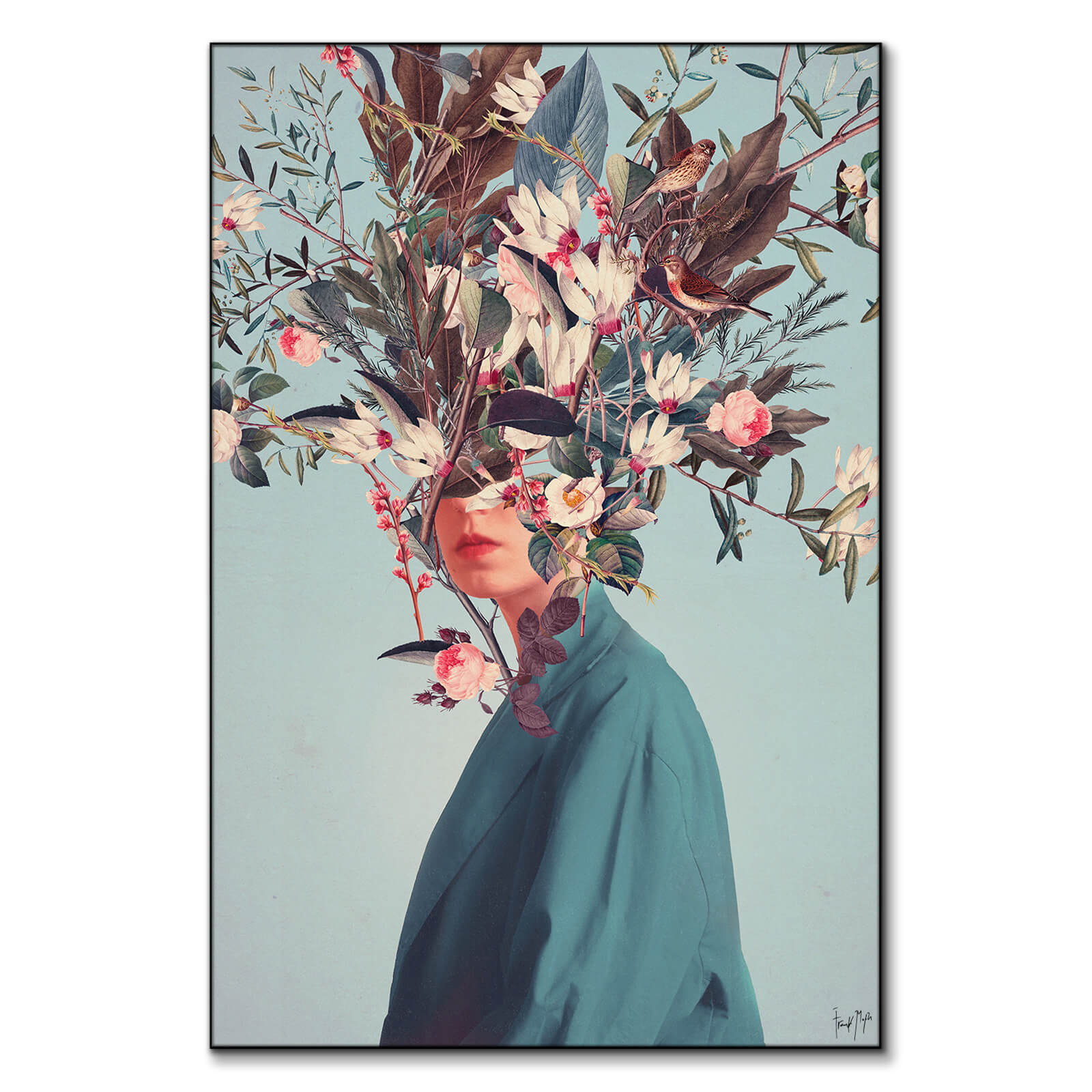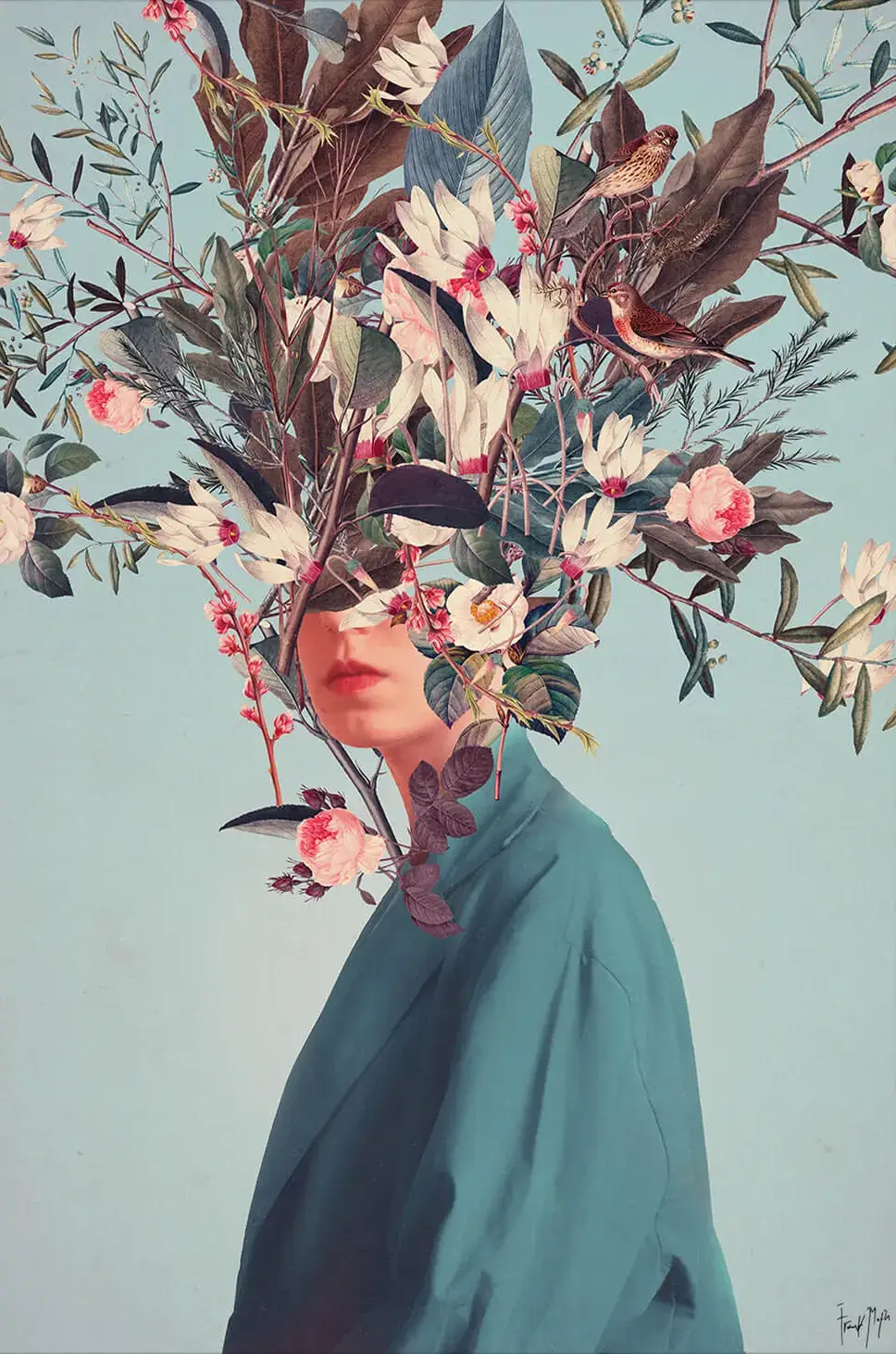 A figure draped in a draped teal garment is adorned with a lavish assortment of botanicals. Pink and white blossoms, alongside rich green leaves and delicate birds, replace the figure’s head, creating an artwork where human and flora are intertwined. The image exudes a serene and natural beauty, drawing the eye to a harmonious blend of the organic and the human form.