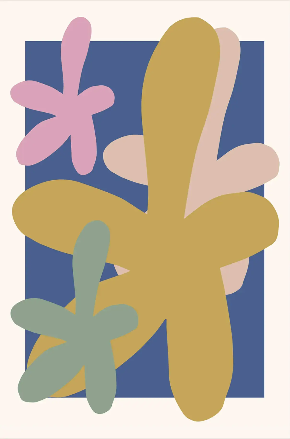 Abstract forms that are reminiscent of a starfish, are set against a serene navy blue backdrop. The playful shapes in soft pink, gentle beige, and muted green create a soothing yet cheerful display.