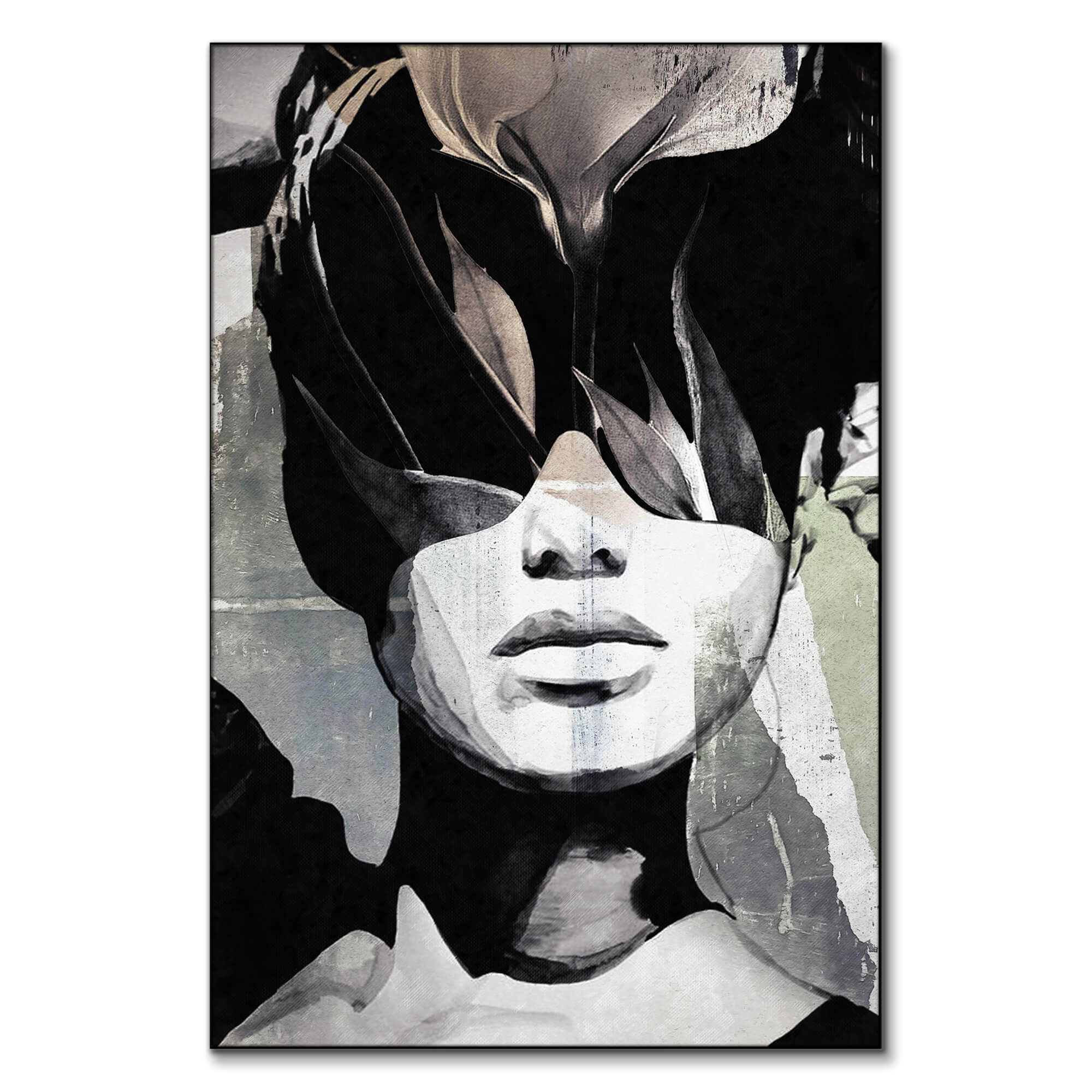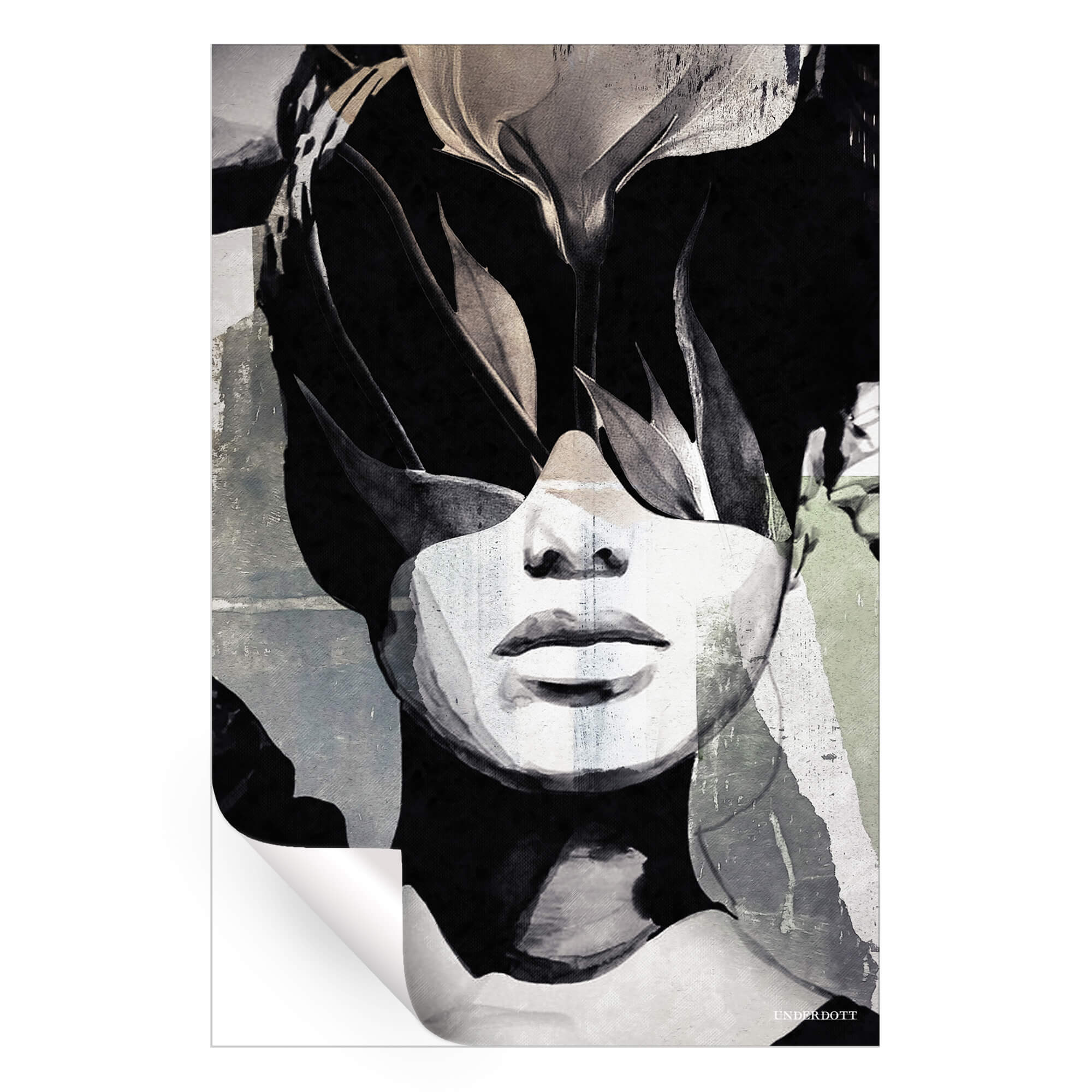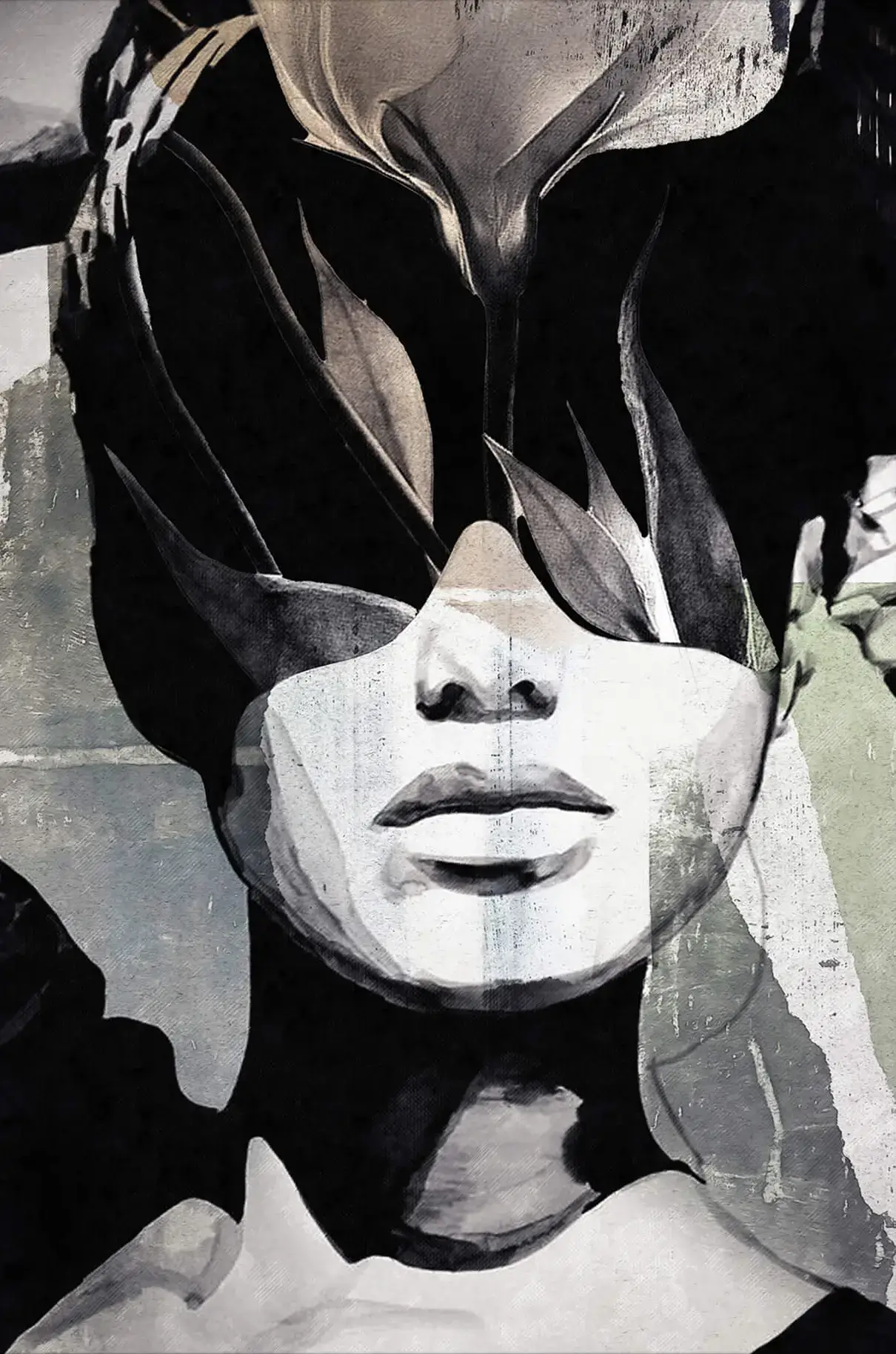 The subject’s eyes are concealed by dark, petal-like shapes that fan outwards, while their lips are accentuated, imparting a serene quality to the face. Multiple textures are overlaid on top of the subject, further obscuring their visage.
