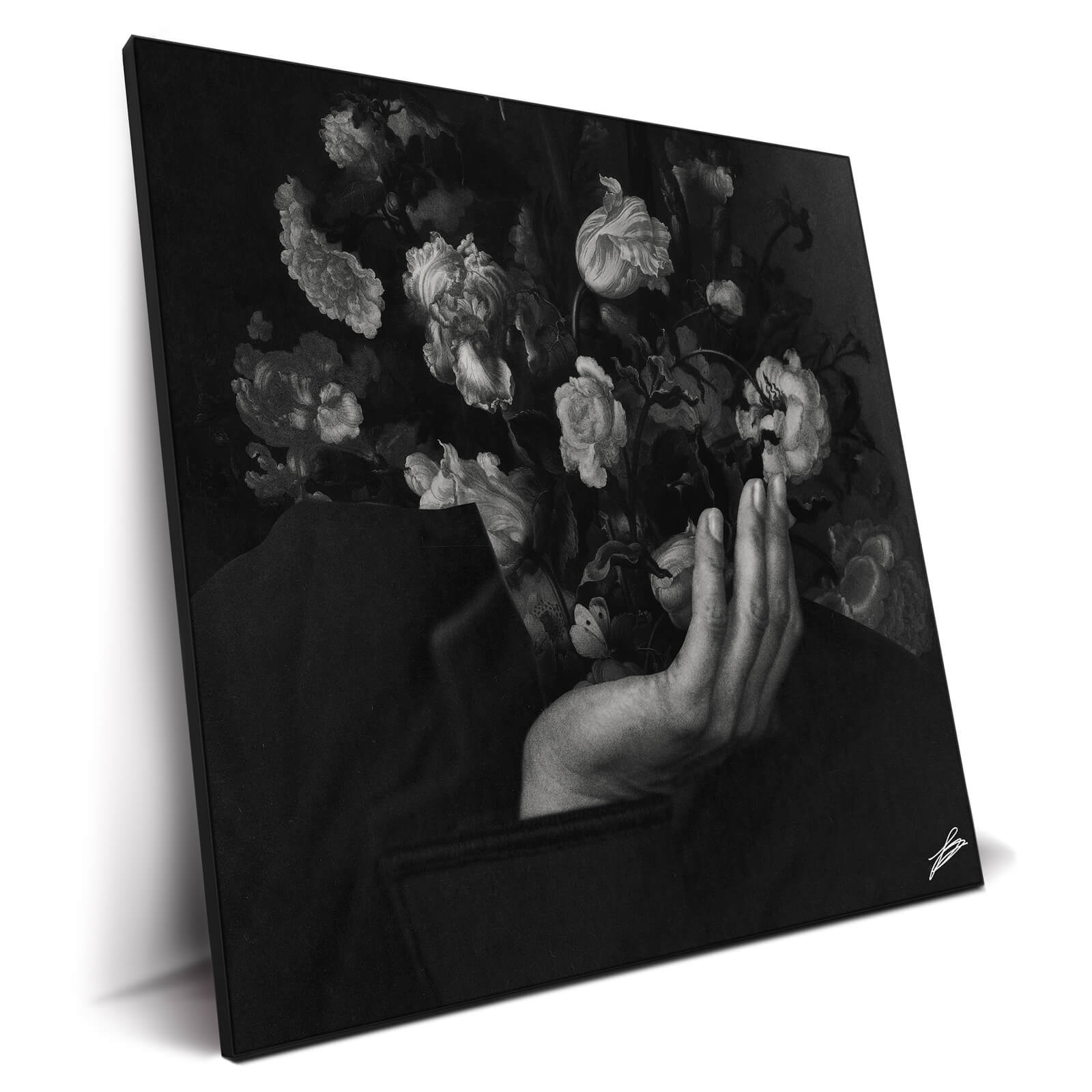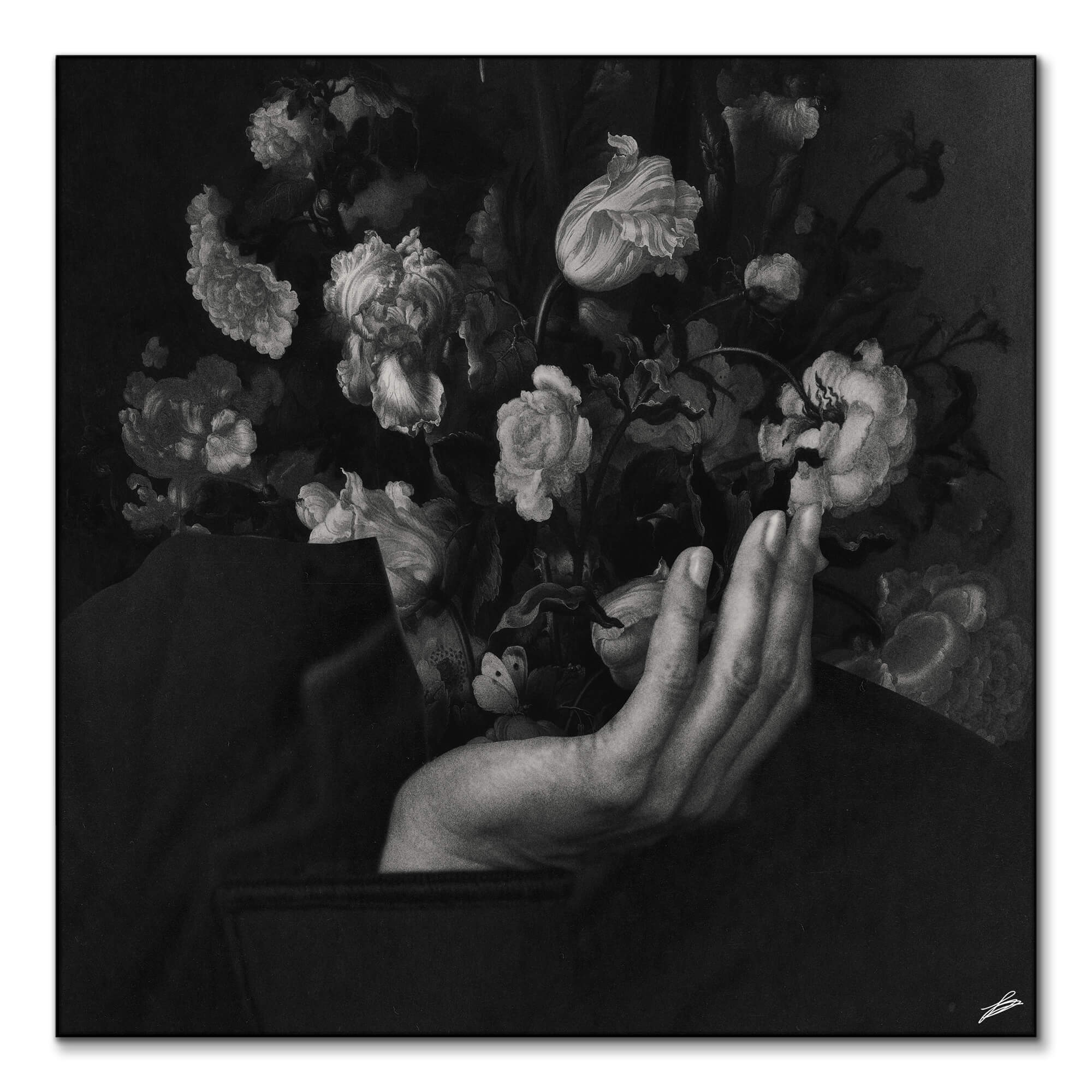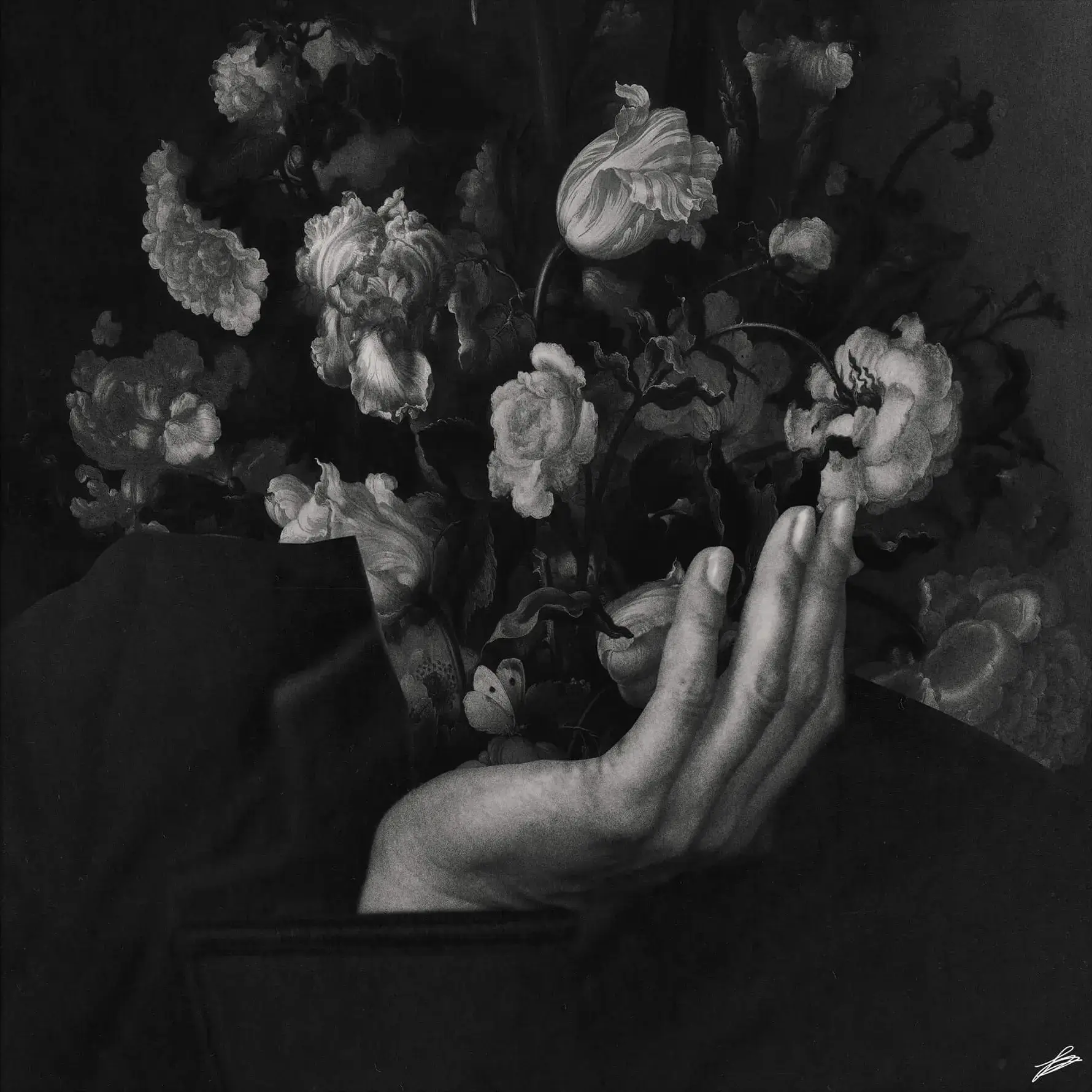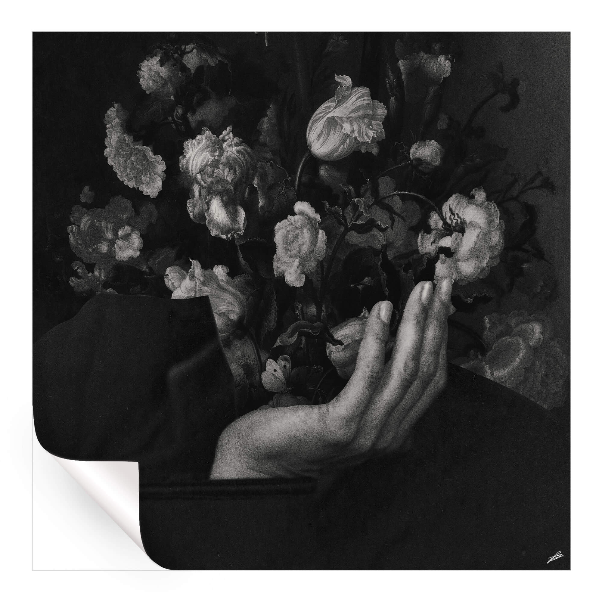 A poetic fusion of the human and the floral, depicting a graceful hand parting a curtain of blooming flowers to reveal a contemplative face. Rendered in a monochromatic palette, the shades of black and white enhance the delicate textures of the petals and the subtle contours of the hand and face.