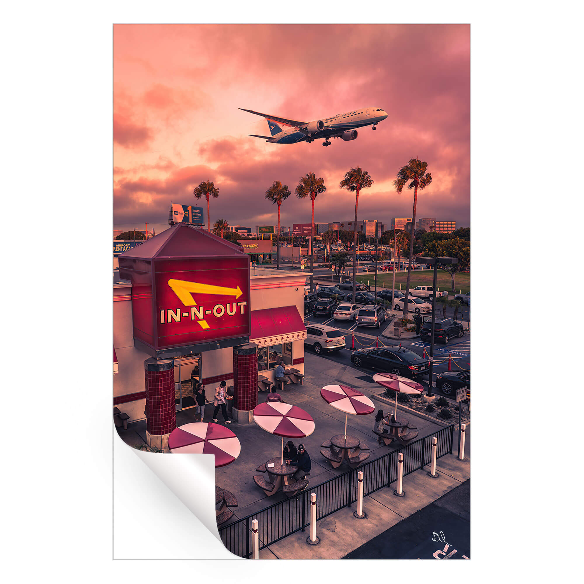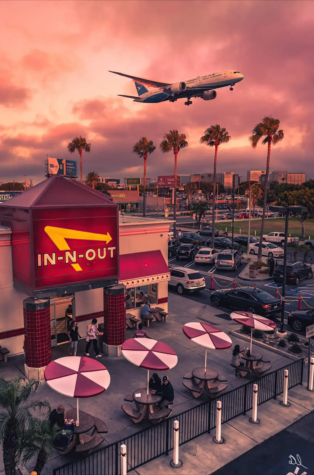Beneath a cotton-candy sky, the day’s last light casts a warm glow over a bustling In-N-Out, where patrons savor a classic Californian feast. Above, an airplane glides towards its next destination.