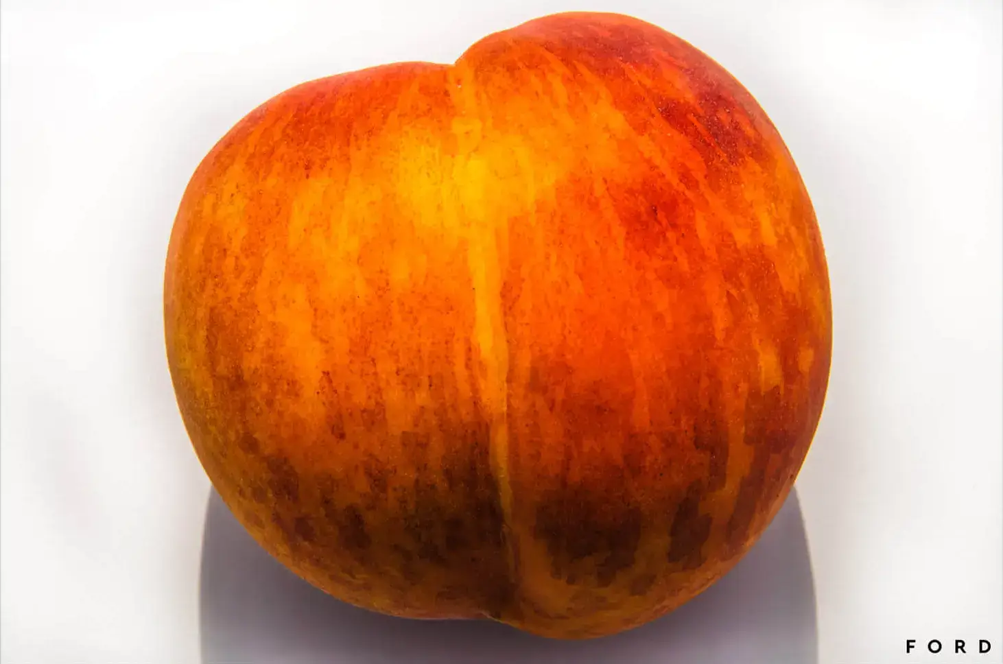 Rich, warm hues of red and orange blend across the surface of a ripe peach, with soft gradations highlighting its round, plump form. The fruit’s velvety texture is visible, accentuated by the gentle play of light that creates a subtle sheen. Against the stark white backdrop, the peach’s colors are particularly vibrant, conveying a sense of freshness and ripeness.