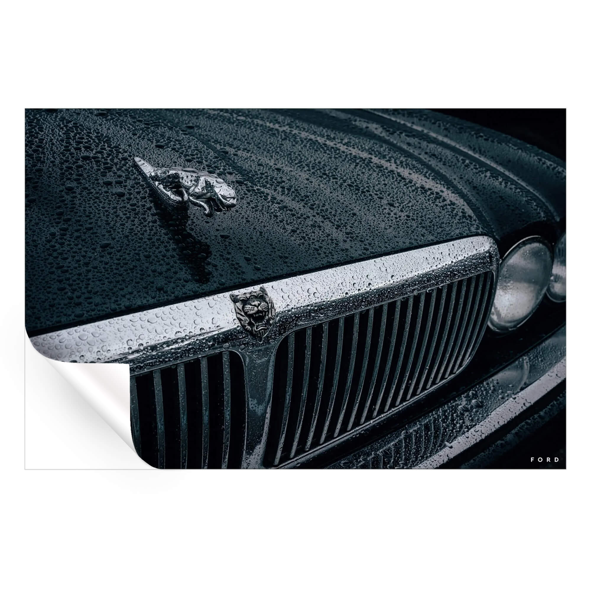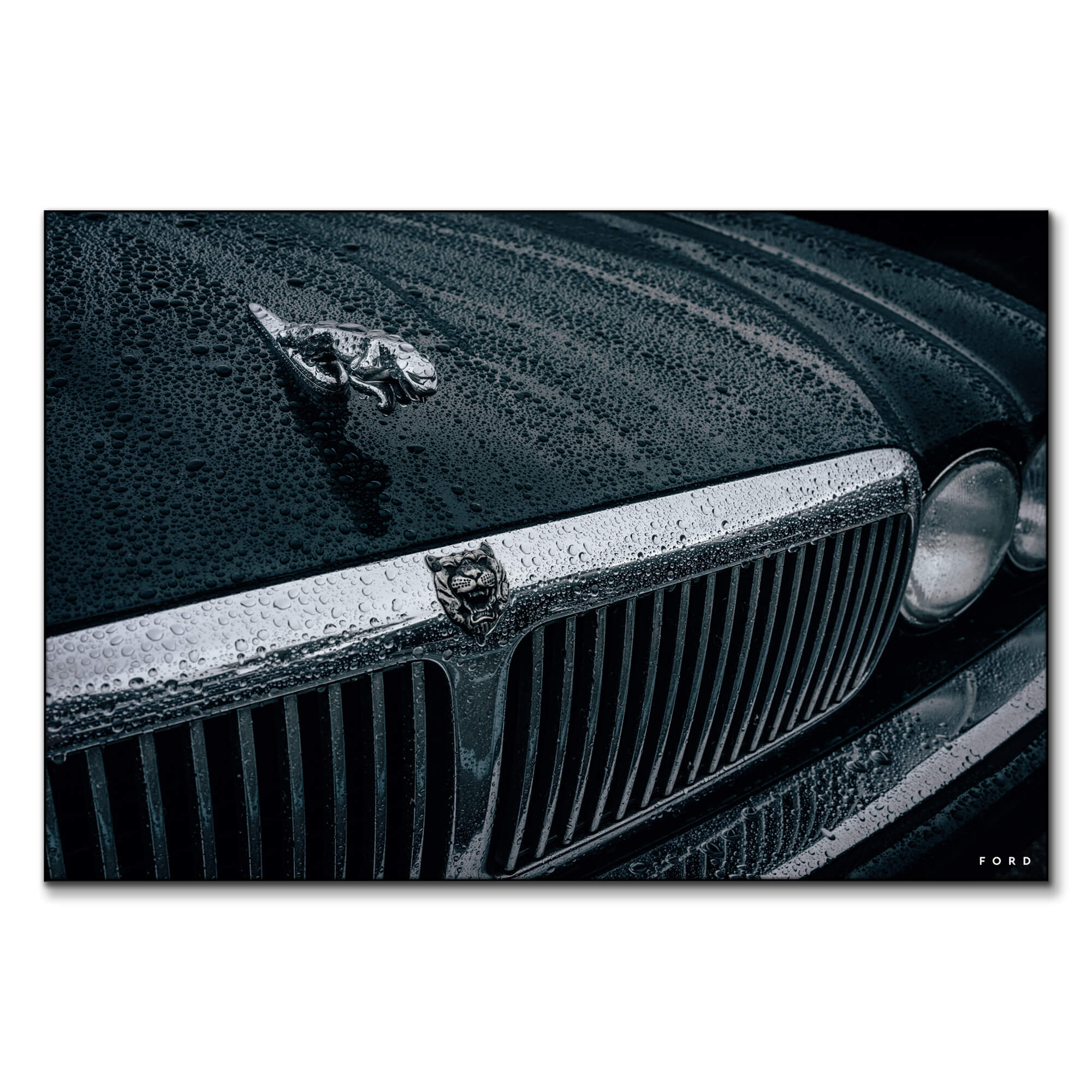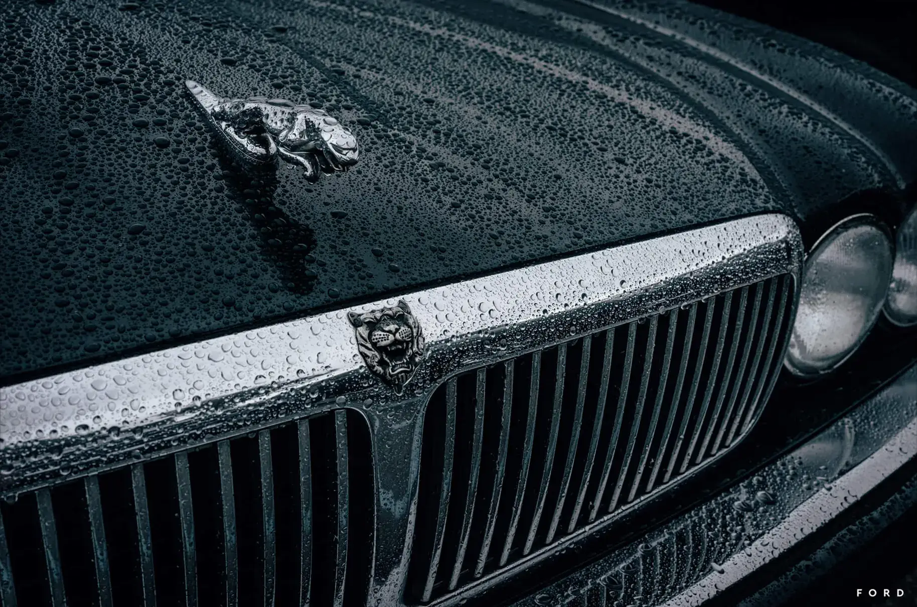 Raindrops bead on the sleek, dark surface of a Jaguar’s hood, with the iconic leaping jaguar emblem and chrome grille glistening in subtle light. The vehicle’s design details, like the emblem and the headlamps’ curves, are accentuated by the moisture, adding to the atmosphere of refined power. This close-up captures the essence of the car’s elegance and the weather’s effect on its polished exterior.