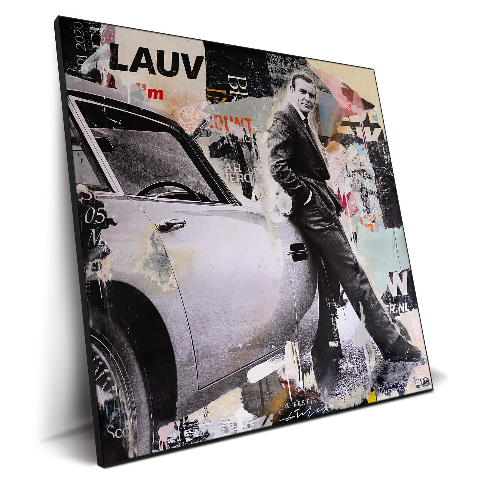 The iconic figure, reminiscent of the legendary Sean Connery’s portrayal, leans confidently against a classic car, exuding the timeless charm and cool demeanor of the beloved secret agent. Splattered with a dynamic array of abstract elements and urban graffiti, the piece captures the essence of Bond’s allure against the backdrop of a fast-paced and ever-changing world.