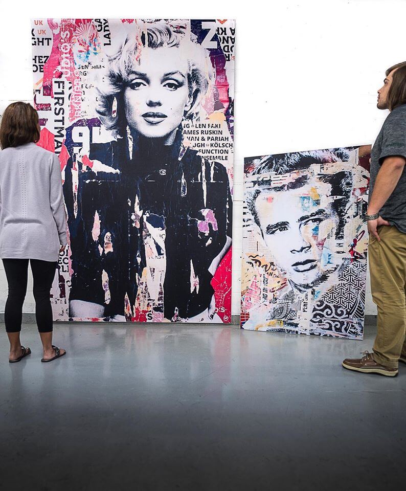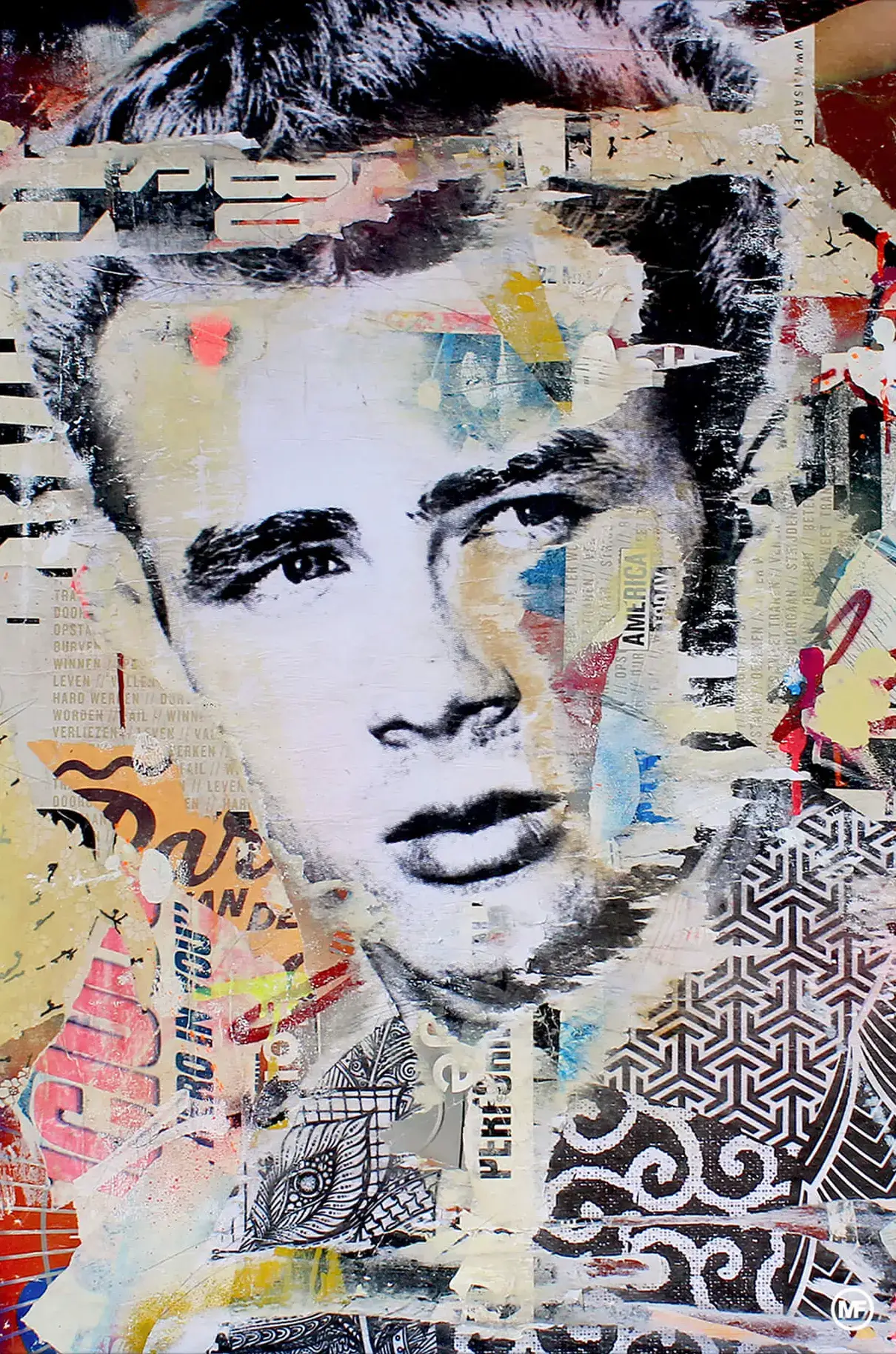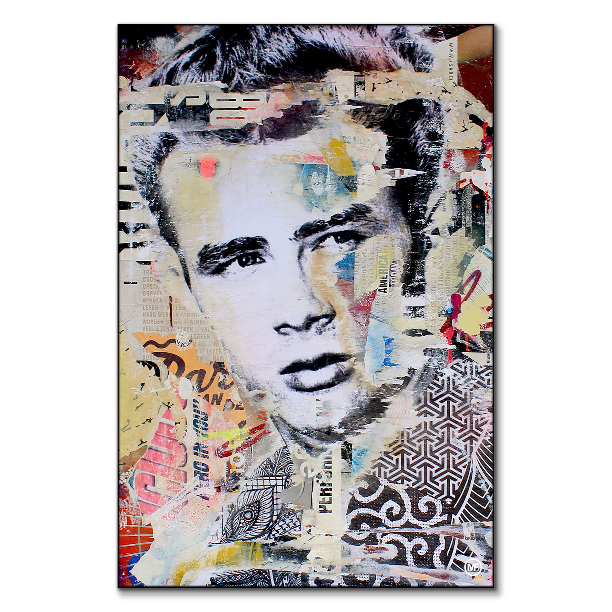 James Dean’s iconic visage takes center stage in this compelling pop art collage, a piece that truly captures the essence of the Hollywood legend’s enduring legacy. The artwork is an intricate assembly of color, with Dean’s intense gaze rendered in stark black and white, contrasting against the chaotic bursts of color and fragmented patterns. It’s a visual representation of Dean’s complex persona, both as the eternally cool rebel and a timeless symbol of youth and defiance.