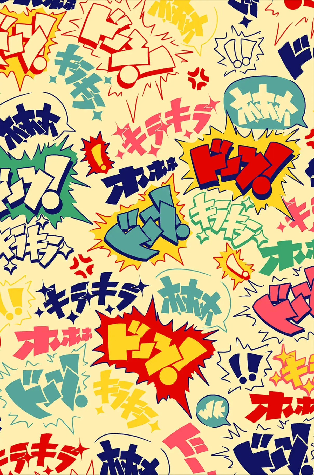 A collage of colorful manga style sound effects and symbols are scattered across a light background. The vibrant comic book words and exclamations are rendered in bold primary colors like red, blue, yellow, and green. Each exclamation is designed with dynamic typography, eliciting emotion and movment.