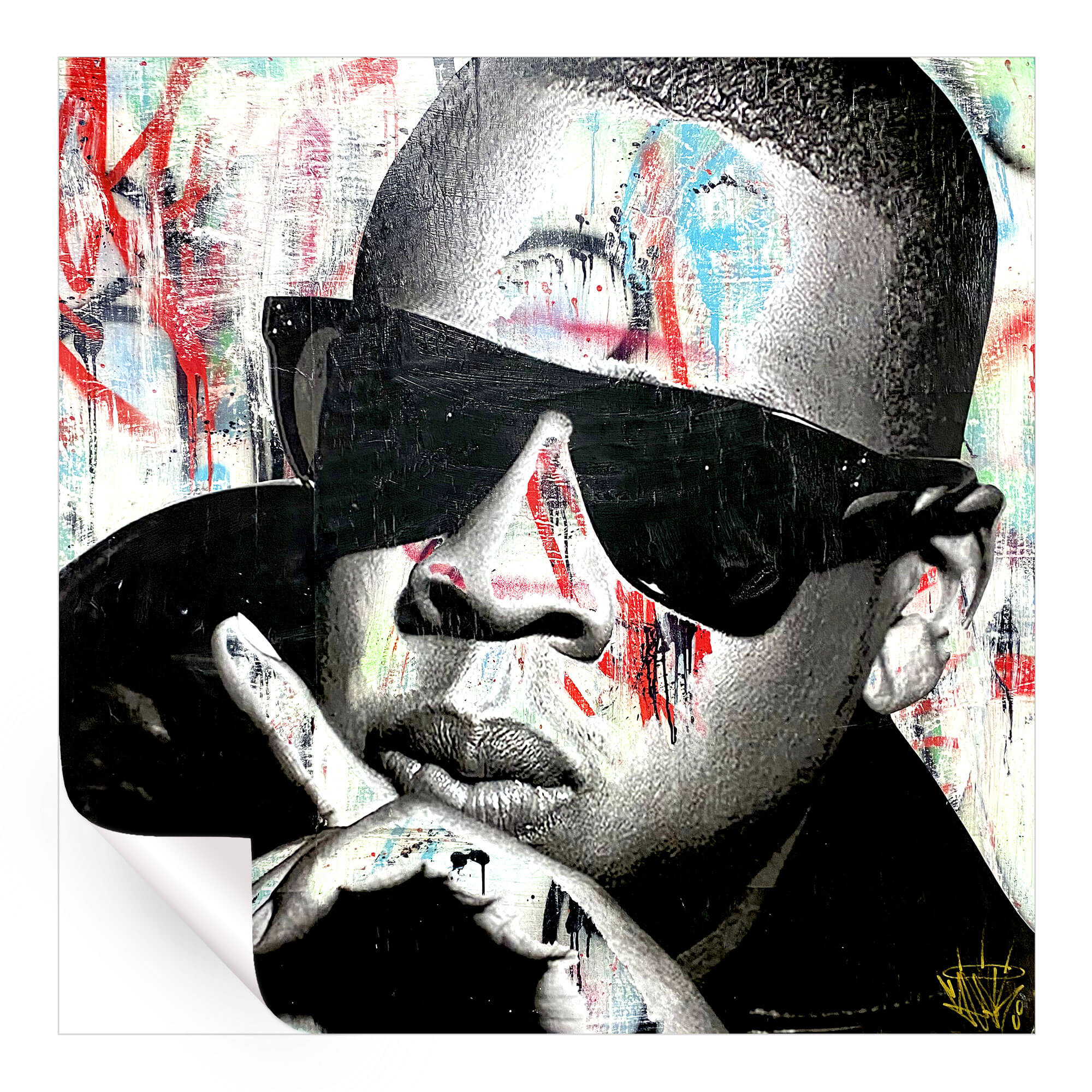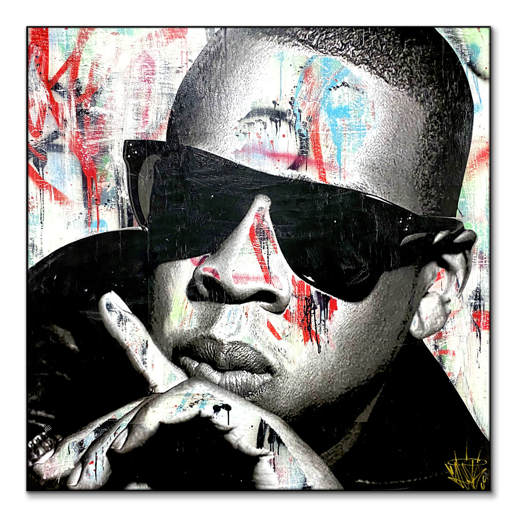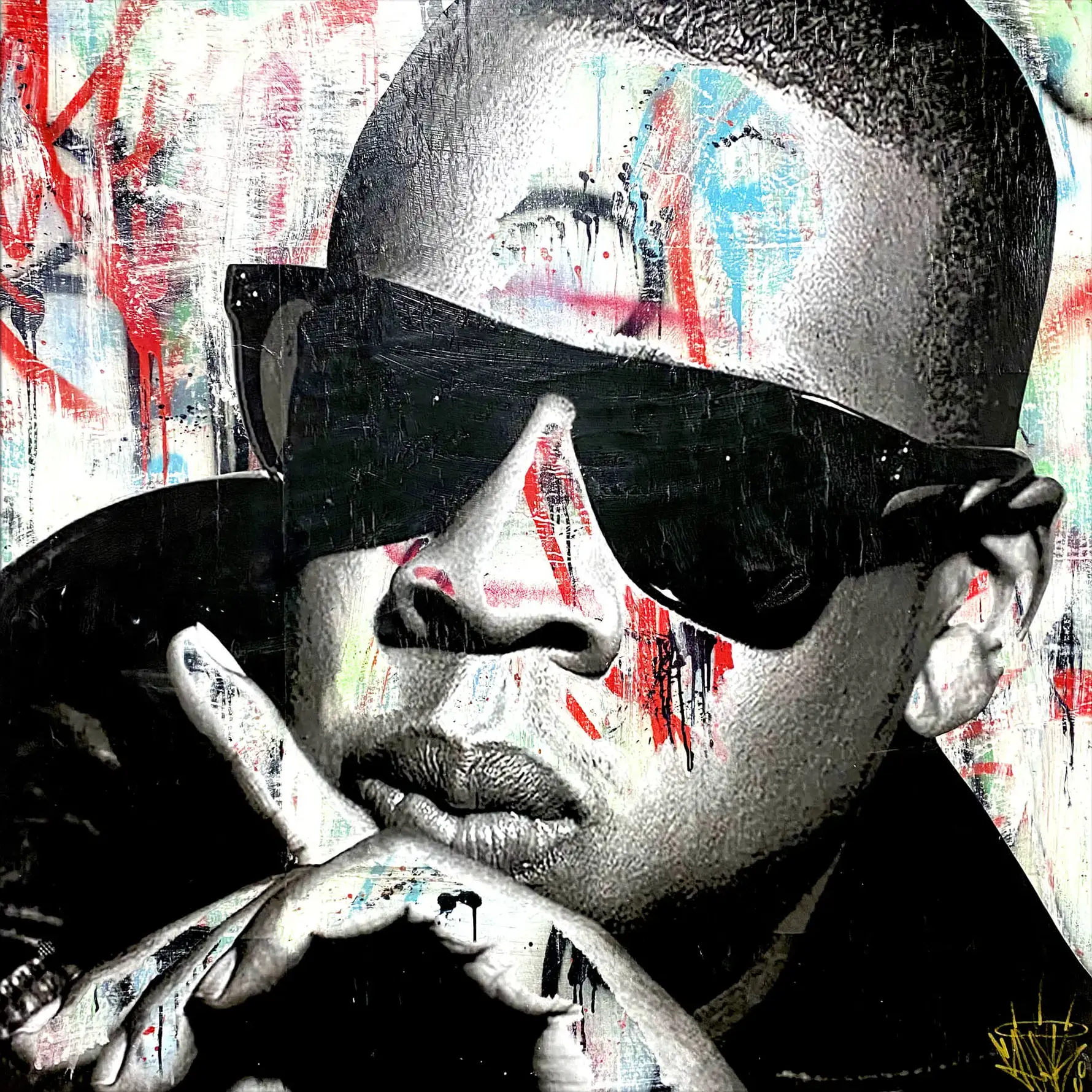 In a grayscale image of Jay Z, he is shown with a pensive expression. He is wearing his classic sunglasses and a hat, set against a backdrop with streaks of red and blue paint. His hands are thoughtfully placed near his face, adding to his contemplative look. The background’s abstract paintwork adds a contrasting splash of color to the sharpness of his portrait.