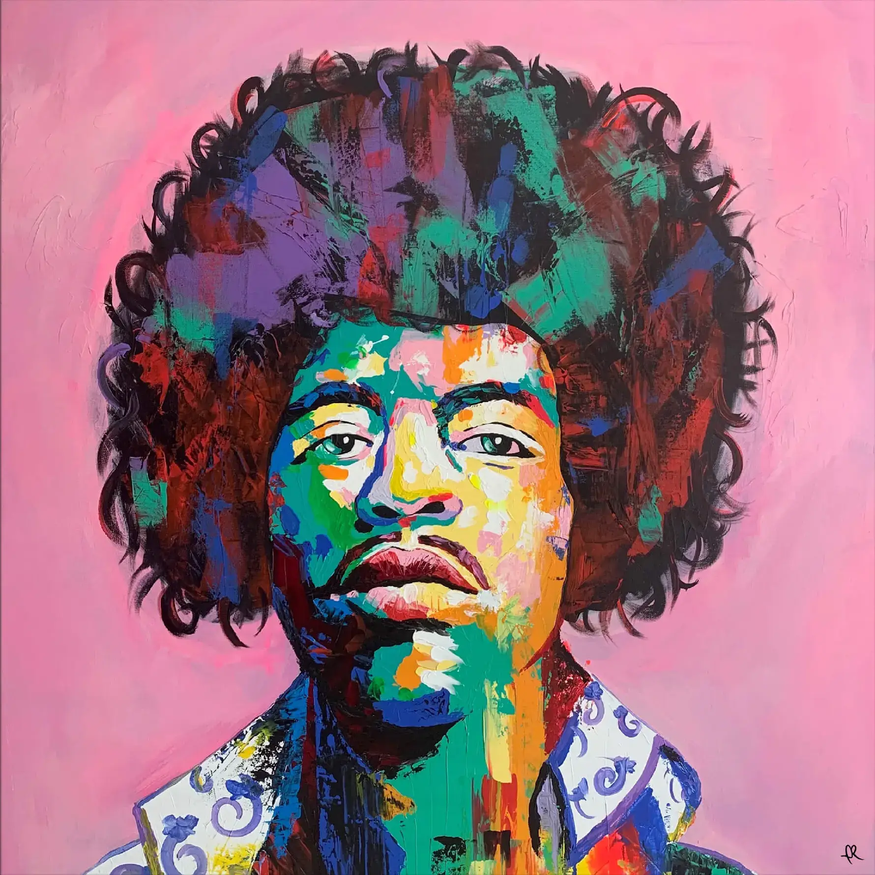 This Jimi Hendrix colorful painting features a colorful pop art portrait set against a pink background.