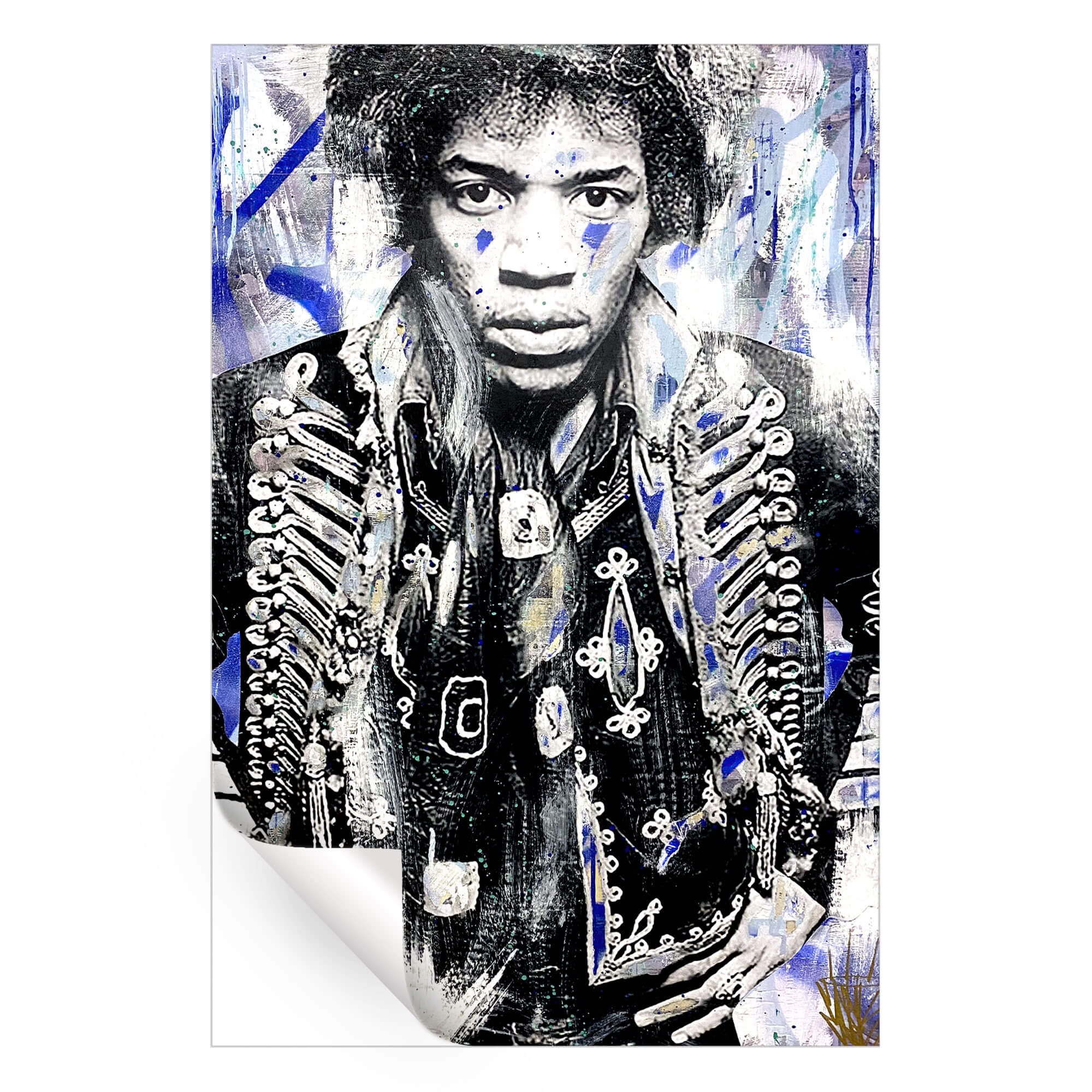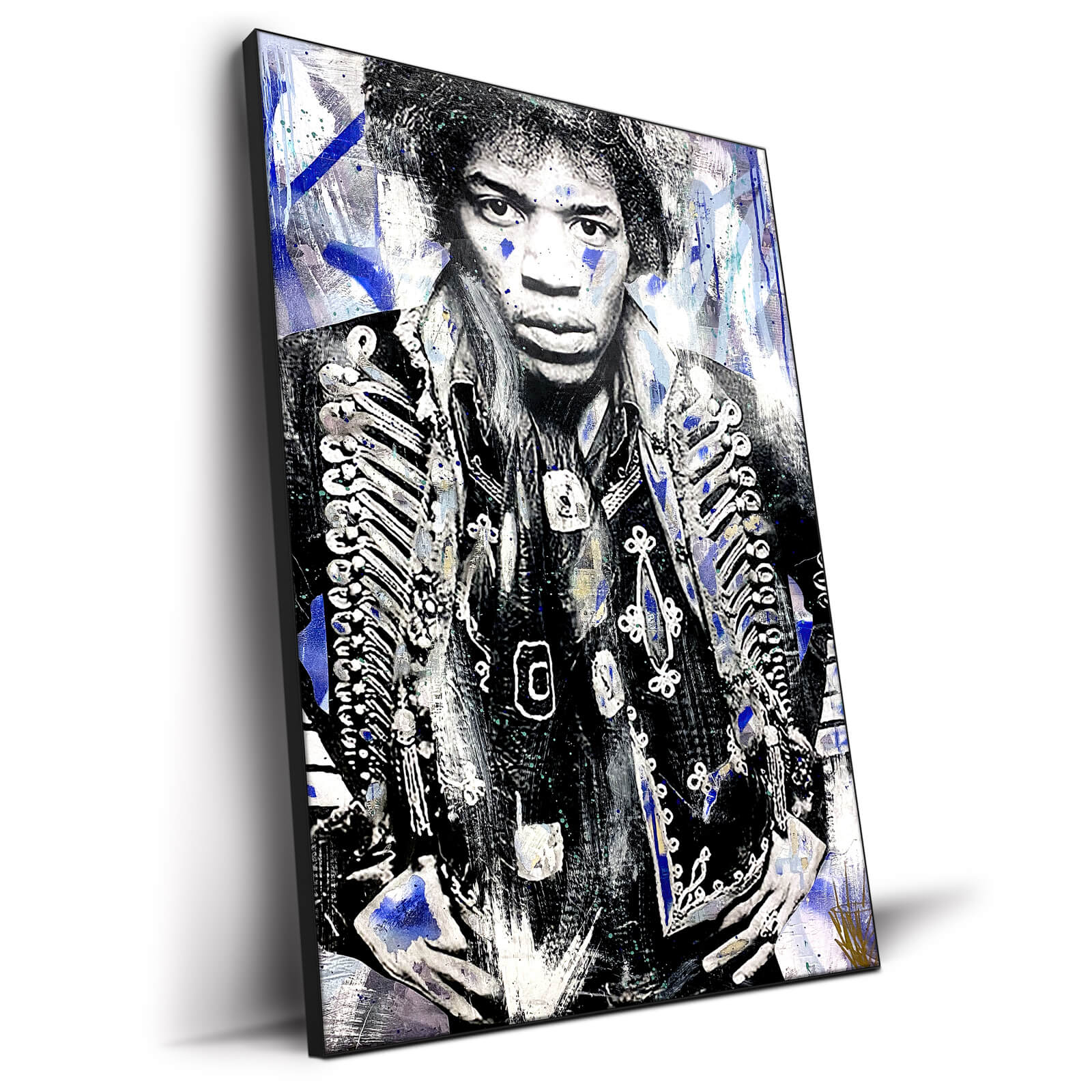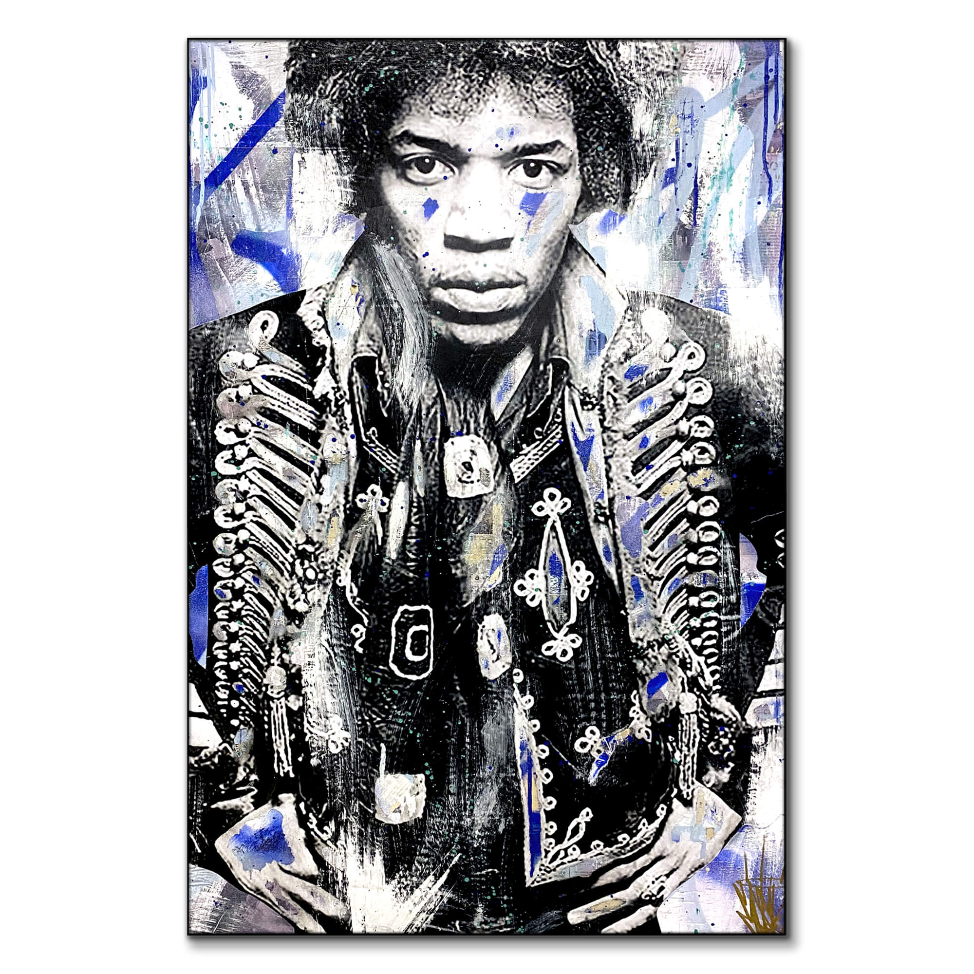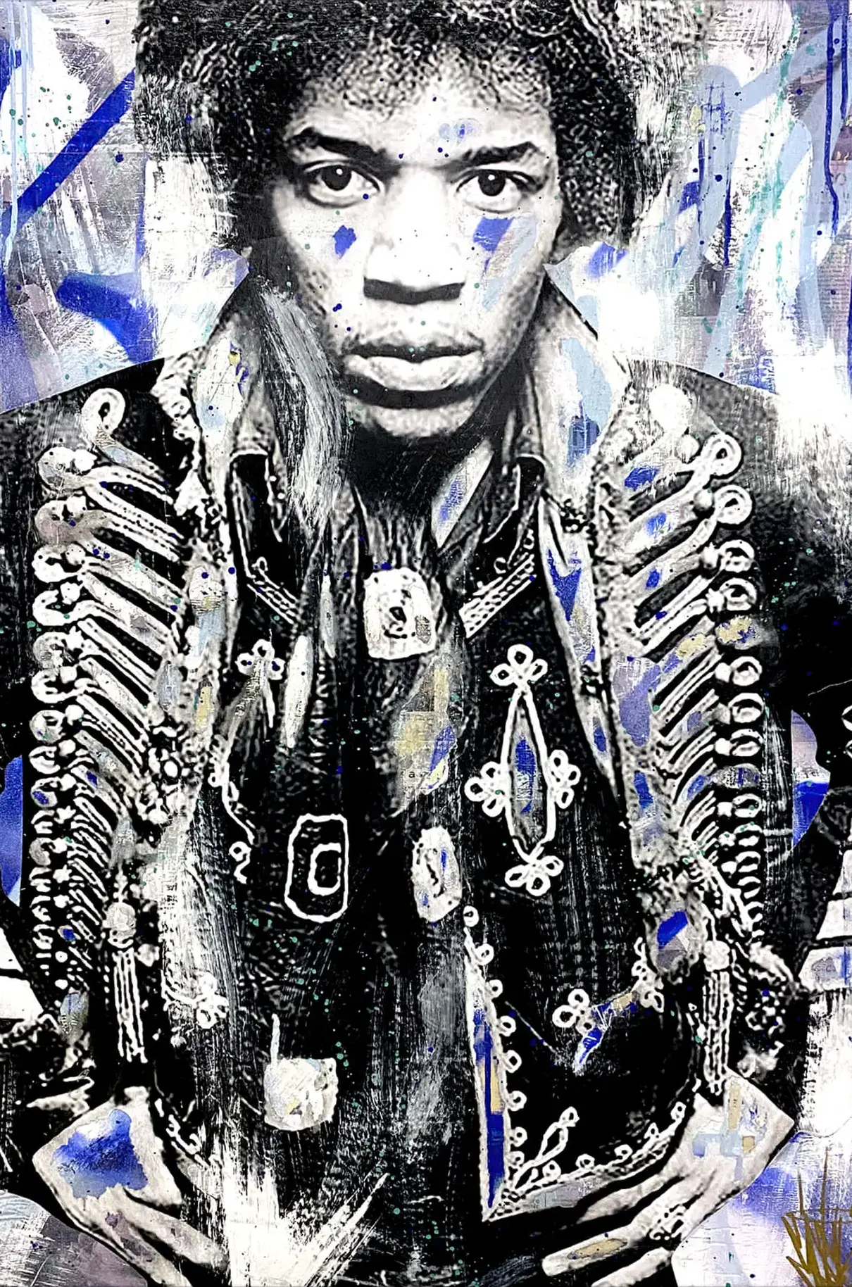 Jimi Hendrix appears as a vision in black and white, his intense gaze and iconic bandana immortalized amidst a flurry of blue and white strokes. The intricate details of his adorned jacket are captured with a striking clarity that stands out against the abstract, textured background. This portrayal of Hendrix captures the fusion of his fiery musical spirit with a visual artistry that’s as bold and innovative as the man himself.