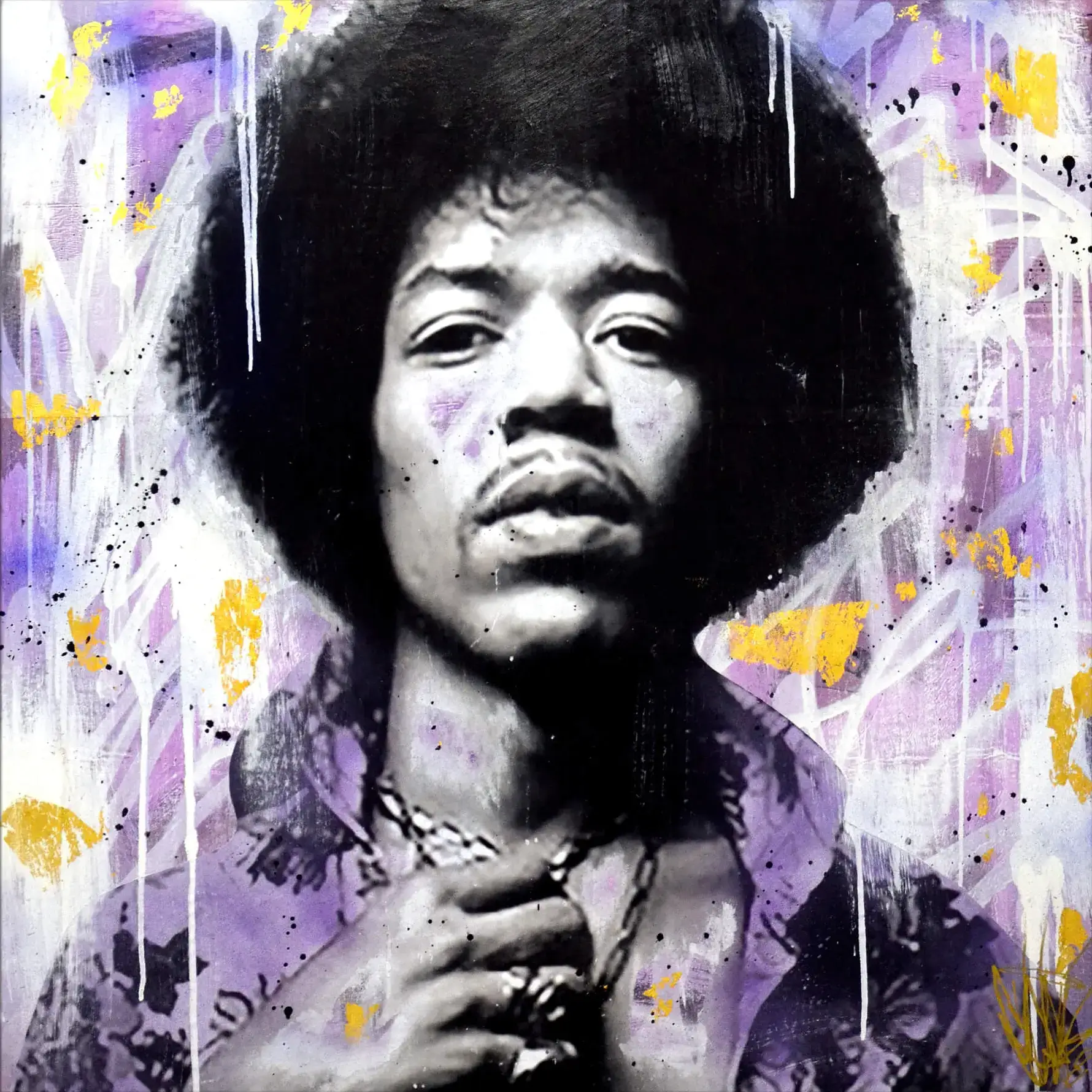 Captured in monochromatic tones, Jimi Hendrix’s portrait exudes a raw, emotive presence, emphasized by the stark contrast of black and white. The backdrop, splattered with purple and yellow, hints at his psychedelic influence and the era he defined. His thoughtful expression, paired with the iconic afro and patterned shirt, encapsulates the spirit of the ’60s and the enduring legacy of a guitar legend.