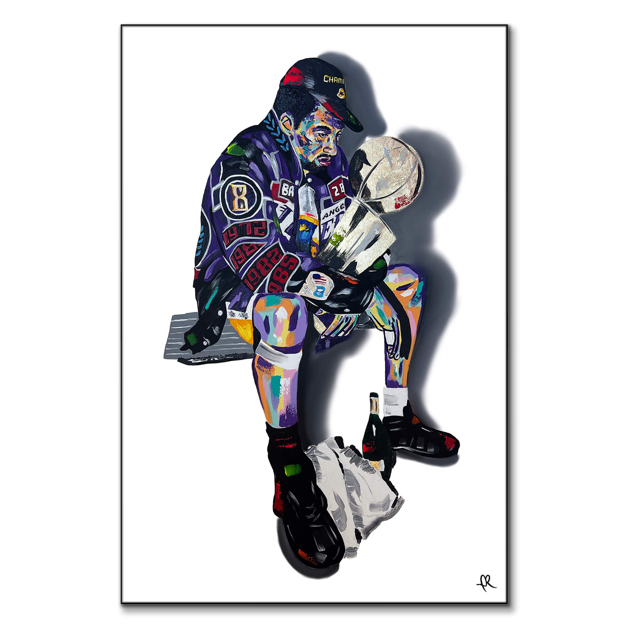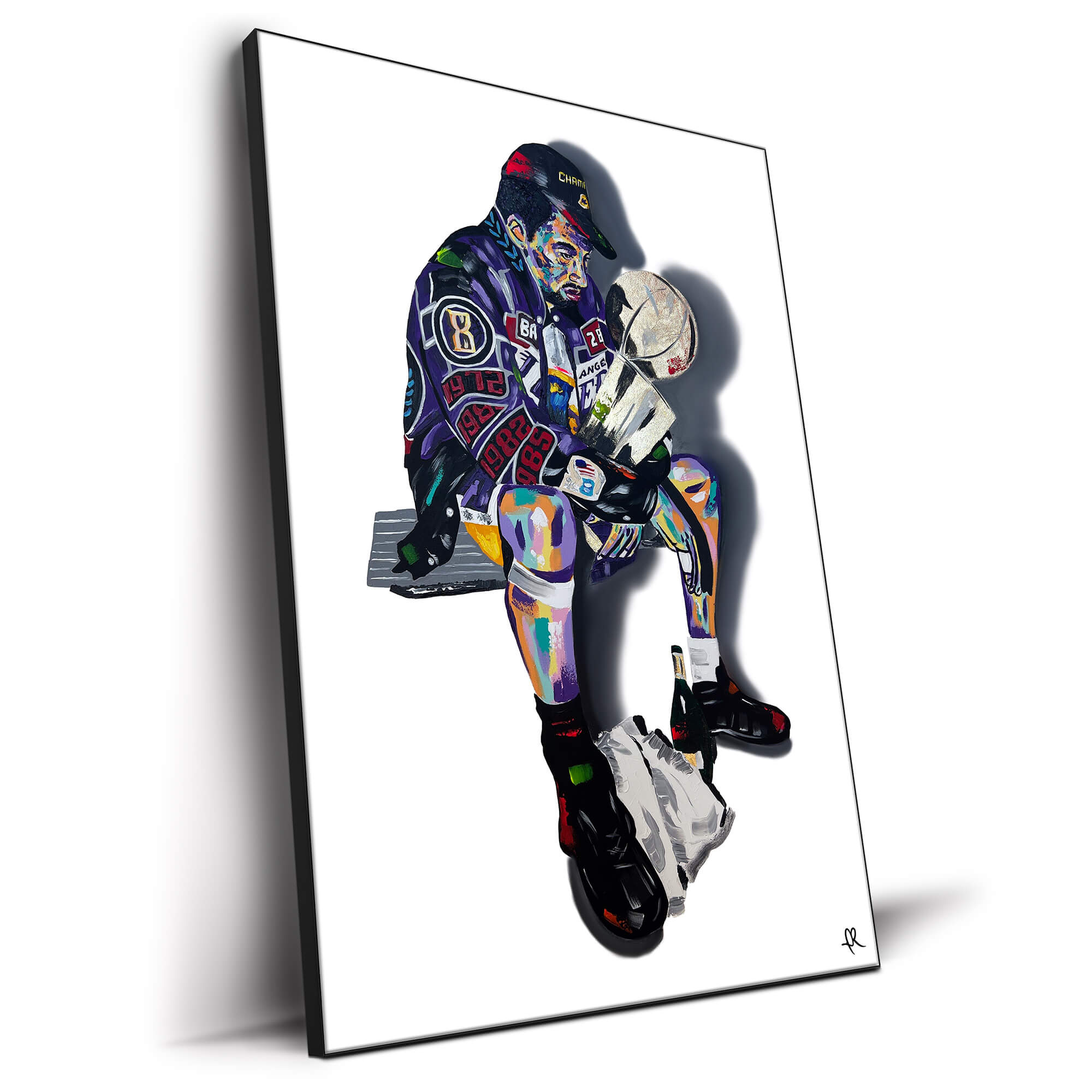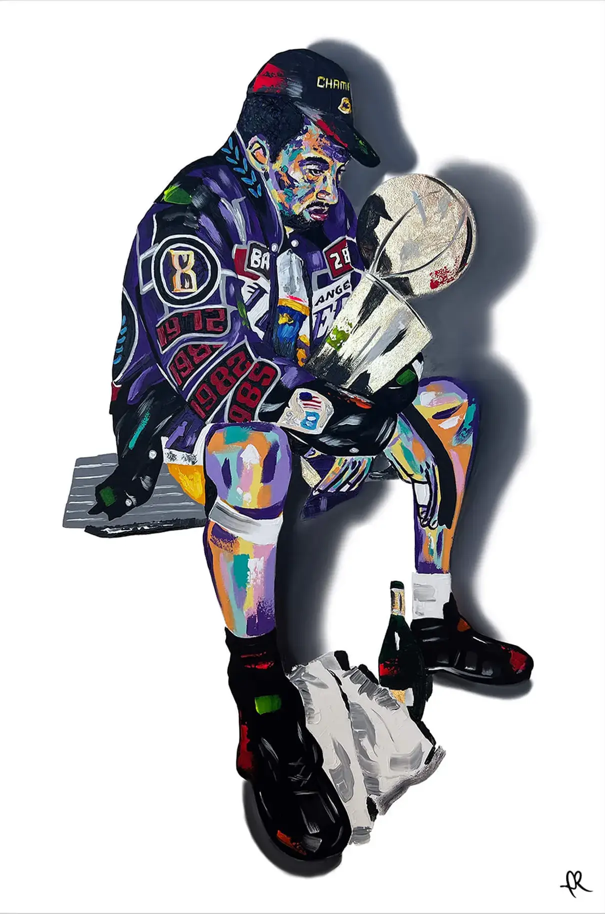 This vibrant pop art piece captures the electrifying energy of a Lakers Championship celebration, reimagined through bold colors and dynamic geometric shapes. The artwork breaks down the iconic image of a player mid-celebration, using fragmented strokes to symbolize the exhilaration and intensity of the moment. The juxtaposition of bright, energetic hues and sharp, abstract shapes not only reflects the triumph of victory but also reinterprets the iconic imagery in a fresh, contemporary style. It’s a powerful blend of sports, art, and culture, making it a bold tribute to the Lakers’ legacy.