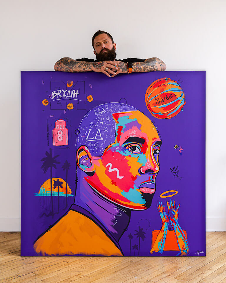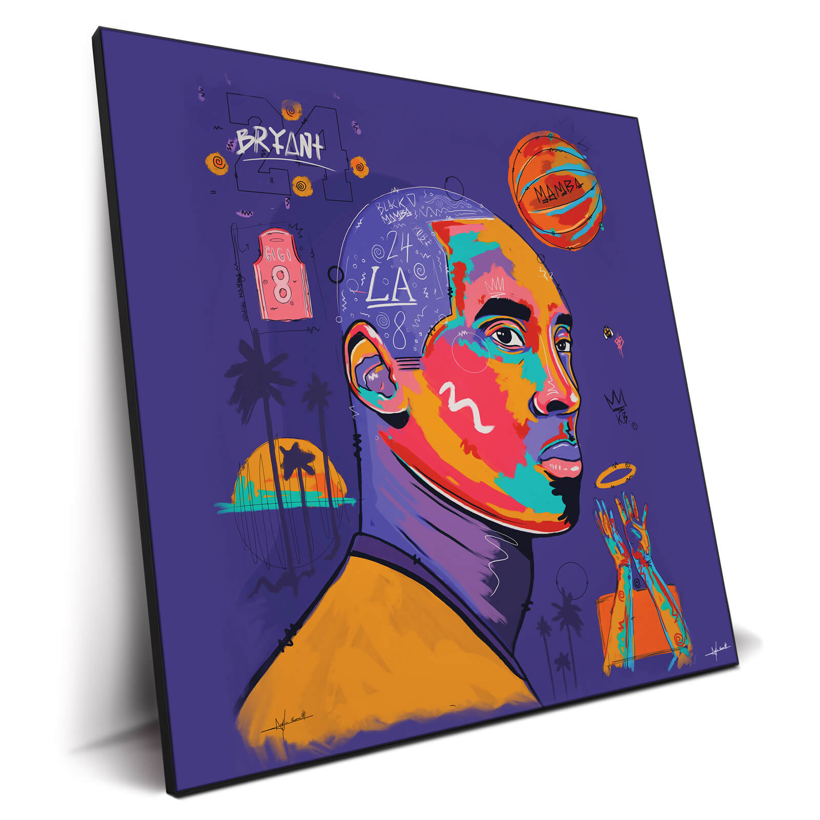 Kobe Bryant in a stylized profile against a deep purple backdrop. The portrait is vibrant, with Kobe’s features highlighted in a mix of warm hues. Surrounding him are symbols of his legacy—the “Mamba” basketball, jersey numbers “24” and “8”, and Los Angeles motifs like palm trees. The piece radiates the energy and passion Kobe was known for, making it a striking tribute.