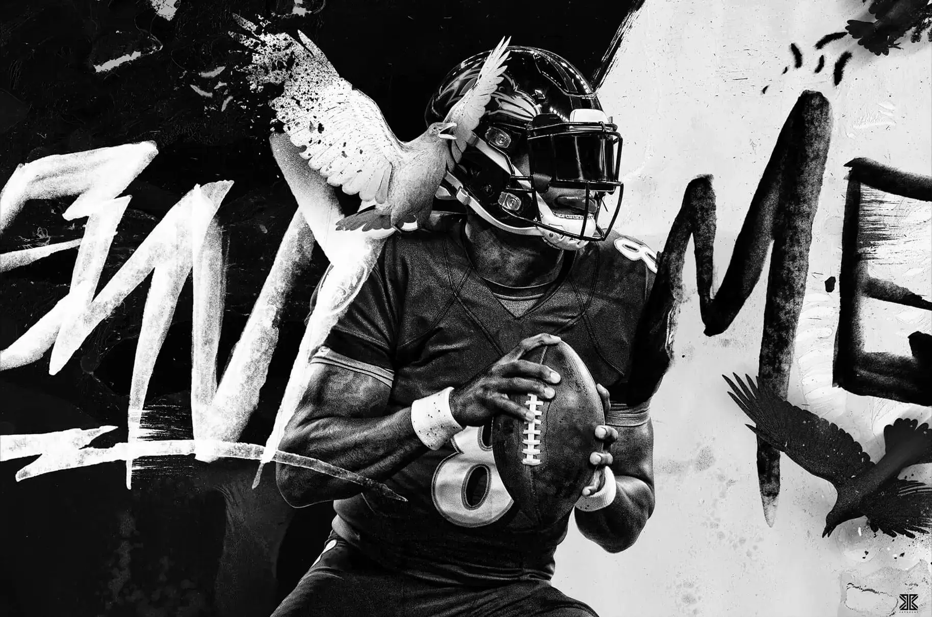 Set against a contrasting backdrop of stark whites and deep blacks, Lamar Jackson is captured. A ball in hand, he’s ready to unleash the full force of his skill. Birds in flight add a touch of symbolism to the composition, revealing freedom and the soaring heights to which the player reaches.