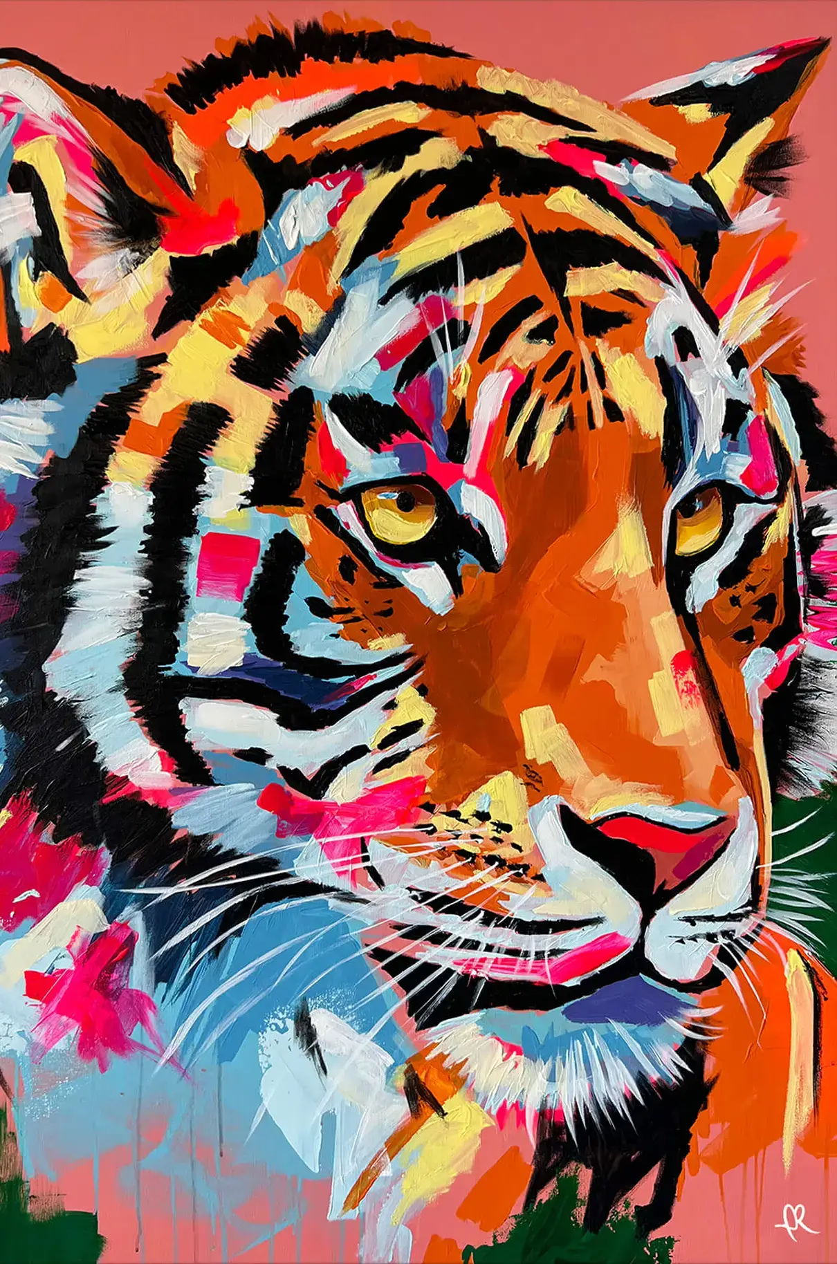 A tiger with piercing golden eyes focuses intently, its face rendered in a vibrant blend of colors. Bold hues of orange, red, and pink create a contrast against cooler tones of blue. Traditional black stripes are reimagined with splashes of abstract color, giving the tiger a dynamic, almost otherworldly presence.