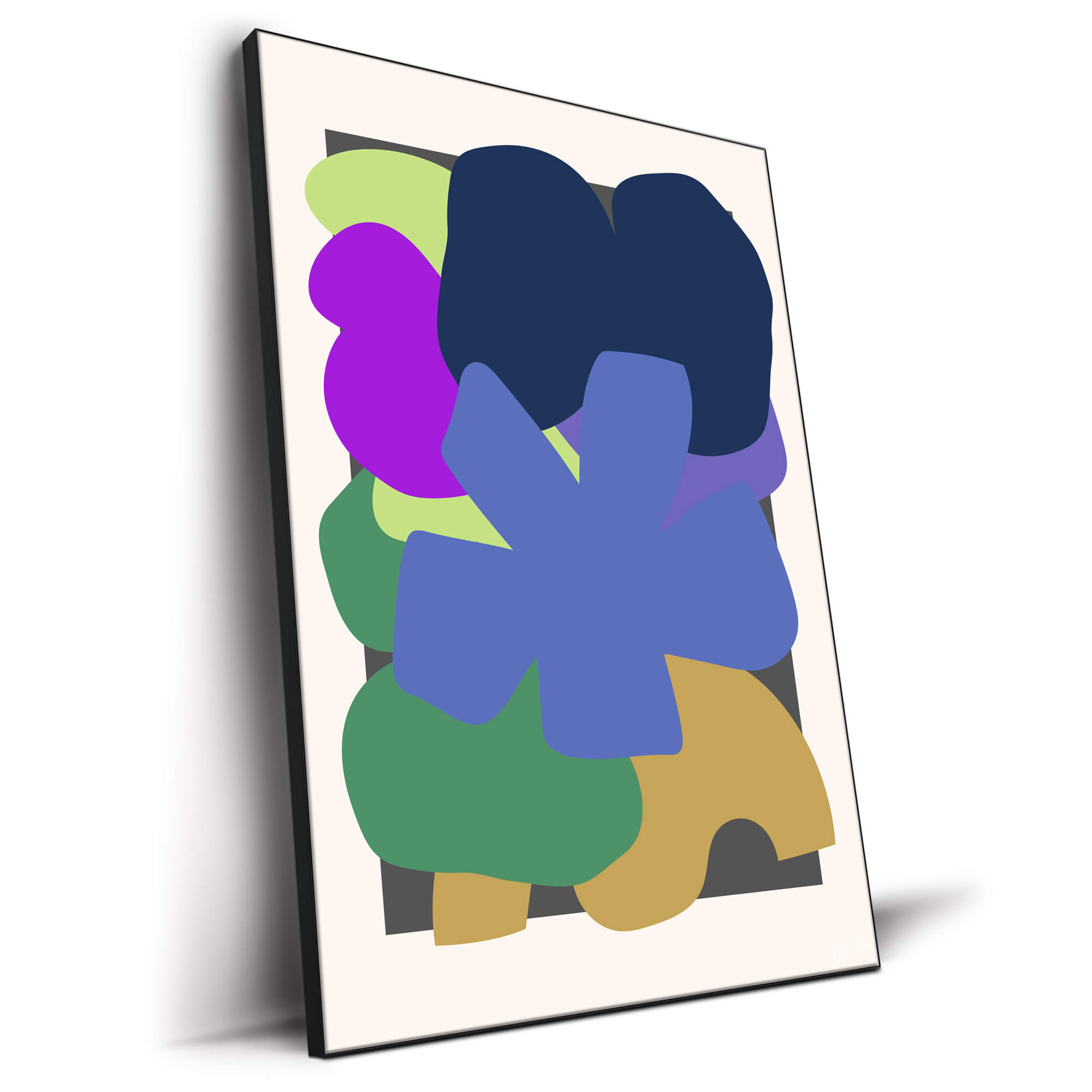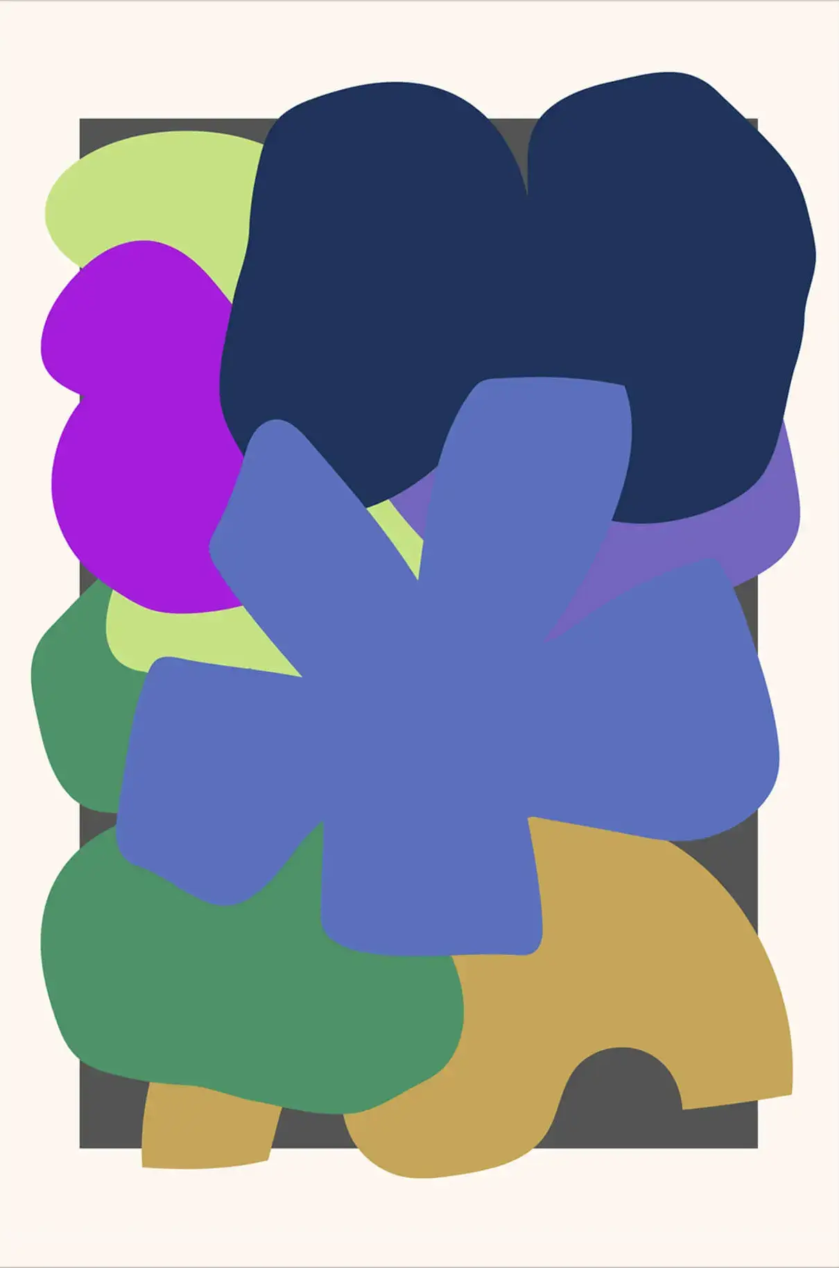 Celebrate form and color with a composition of illustrated shapes in a playful and harmonious arrangement. The overlapping forms in shades of green, purple, blue, and mustard create a dynamic visual experience, evoking a sense of movement and rhythm.