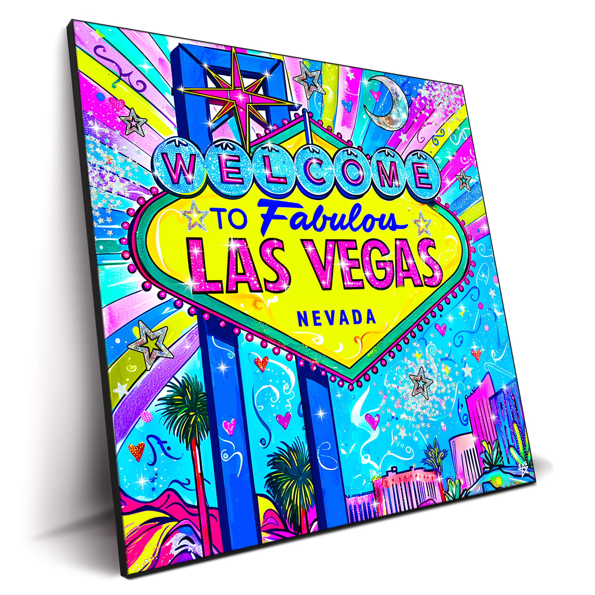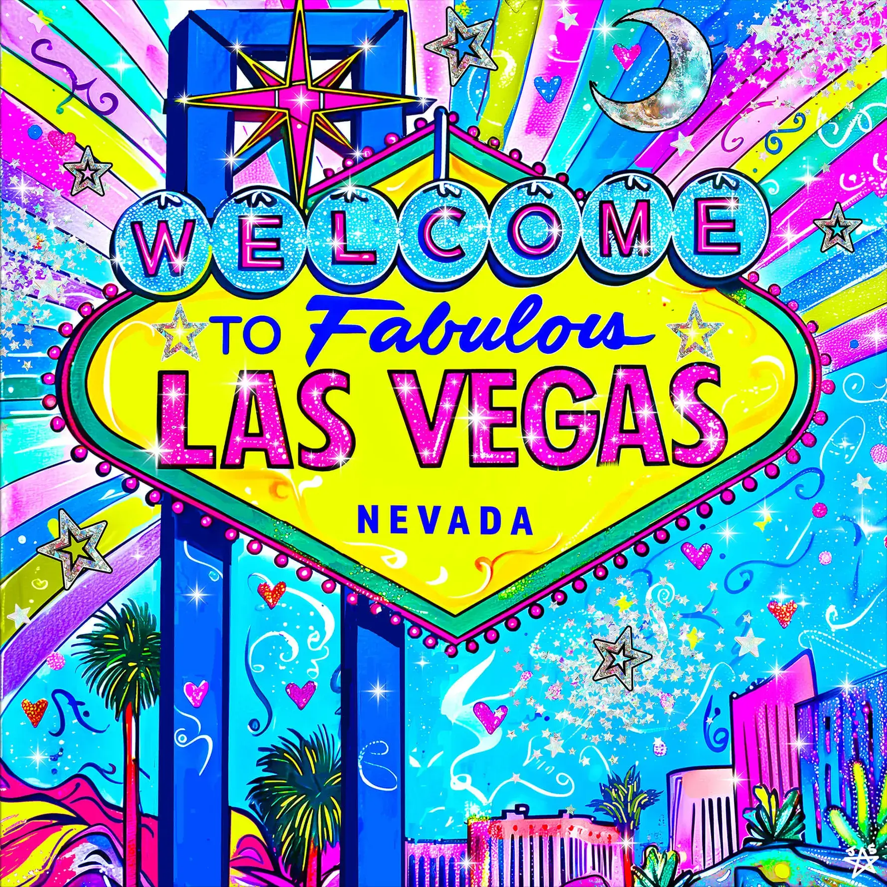 A vibrant, colorful rendition of the iconic “Welcome to Fabulous Las Vegas” sign takes center stage. The sign is surrounded by an explosion of bright, dazzling colors including pink, blue, and yellow. Sparkling stars, hearts, and swirls embellish the background, adding to the festive atmosphere. Palm trees and stylized buildings are visible below, capturing the lively and energetic spirit of Las Vegas.