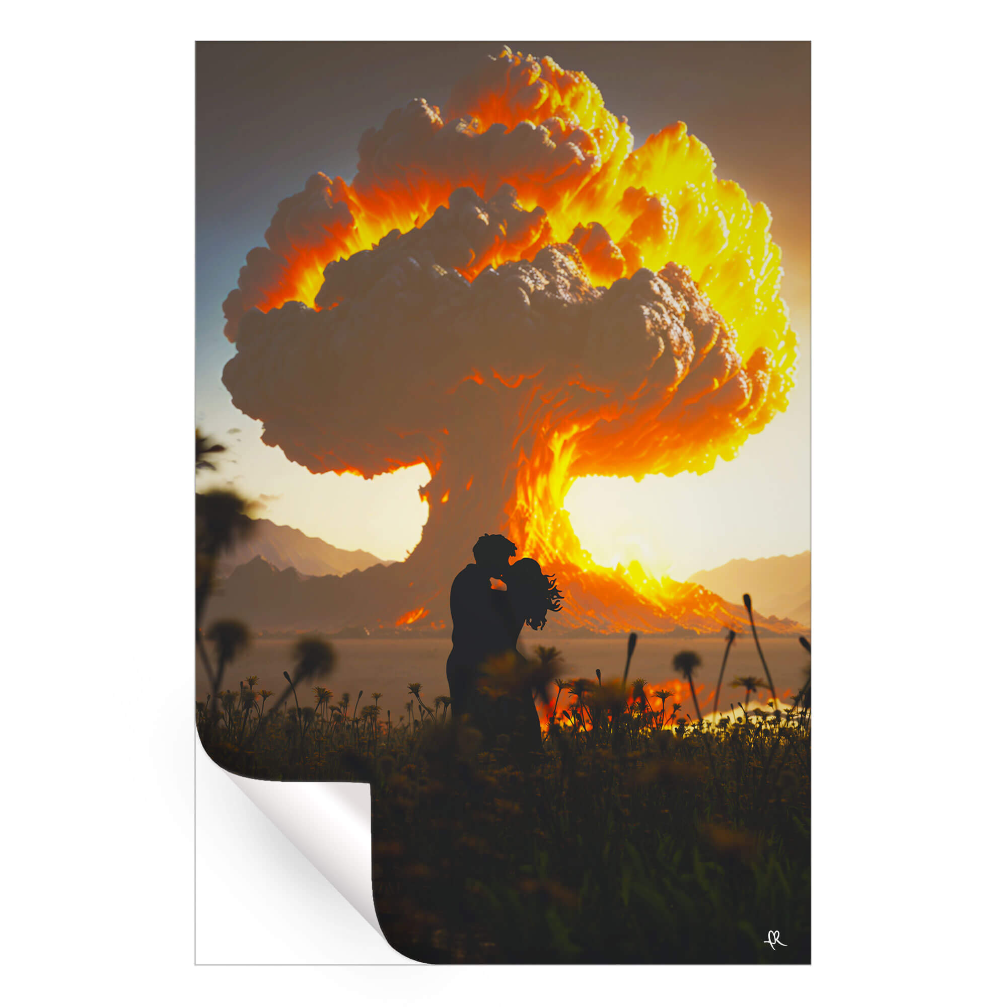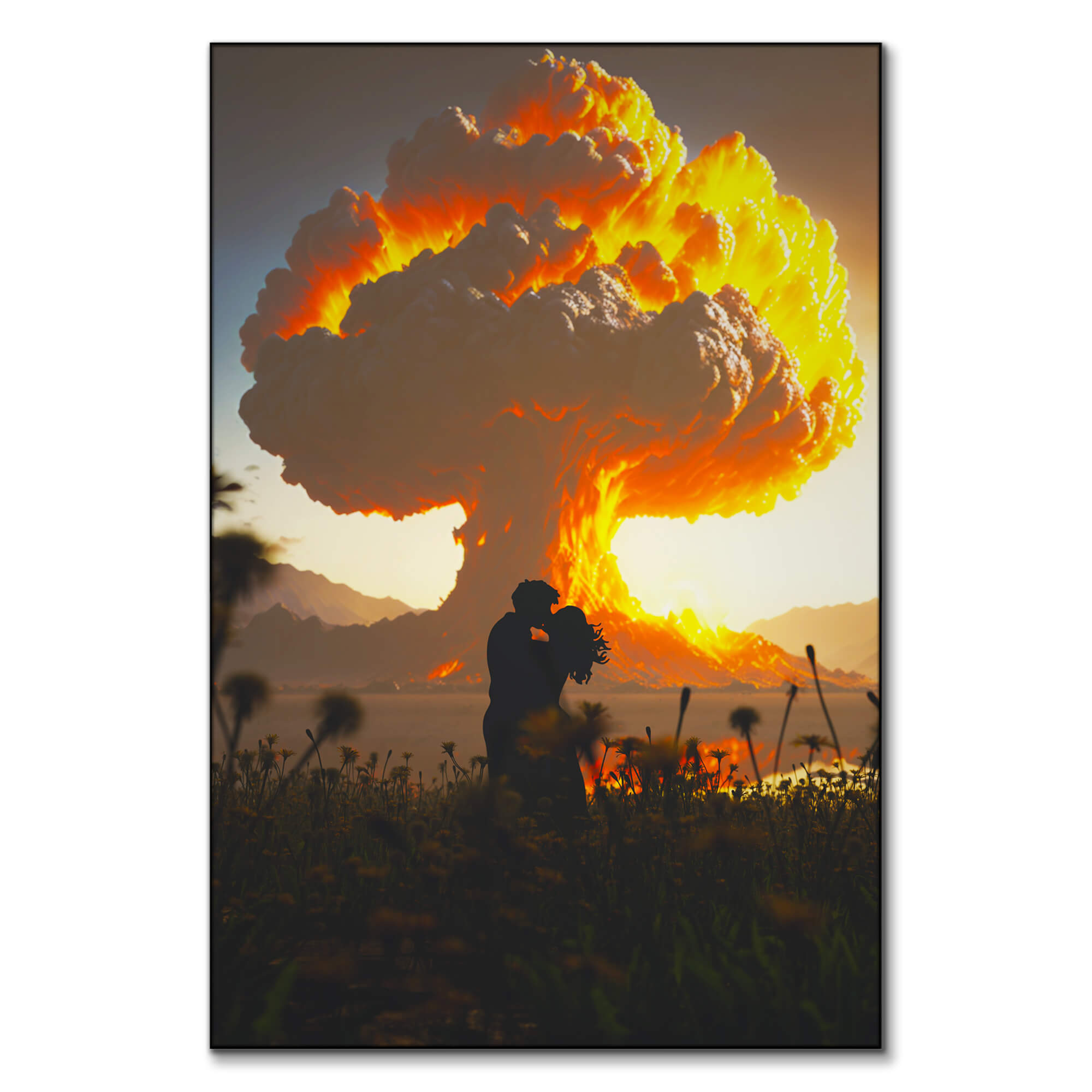 The image depicts a silhouette of two people embracing in front of a massive explosion that resembles a mushroom cloud. The explosion is fiery orange and yellow, contrasting with the dark foreground. The setting appears to be a field with wildflowers, backed by a range of mountains under a clear sky.