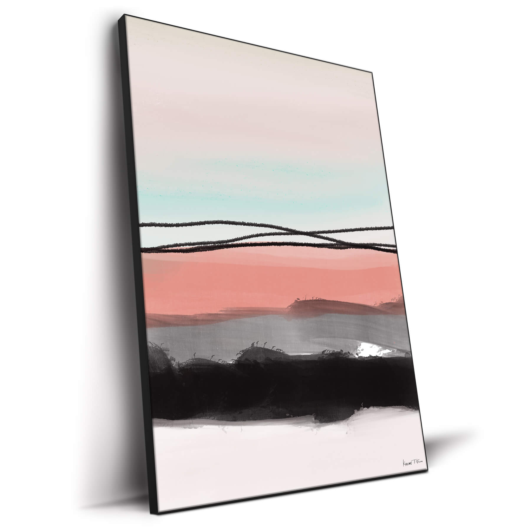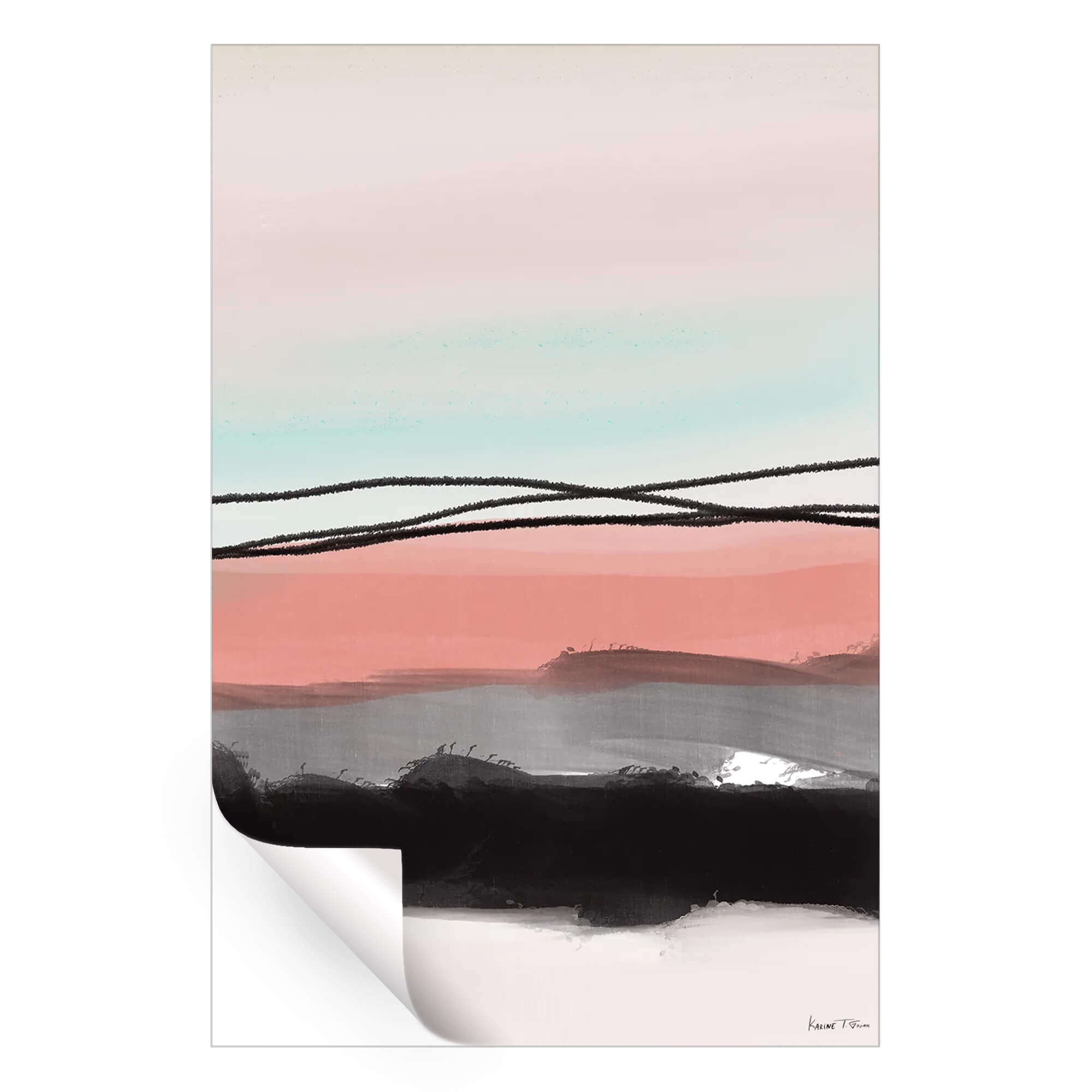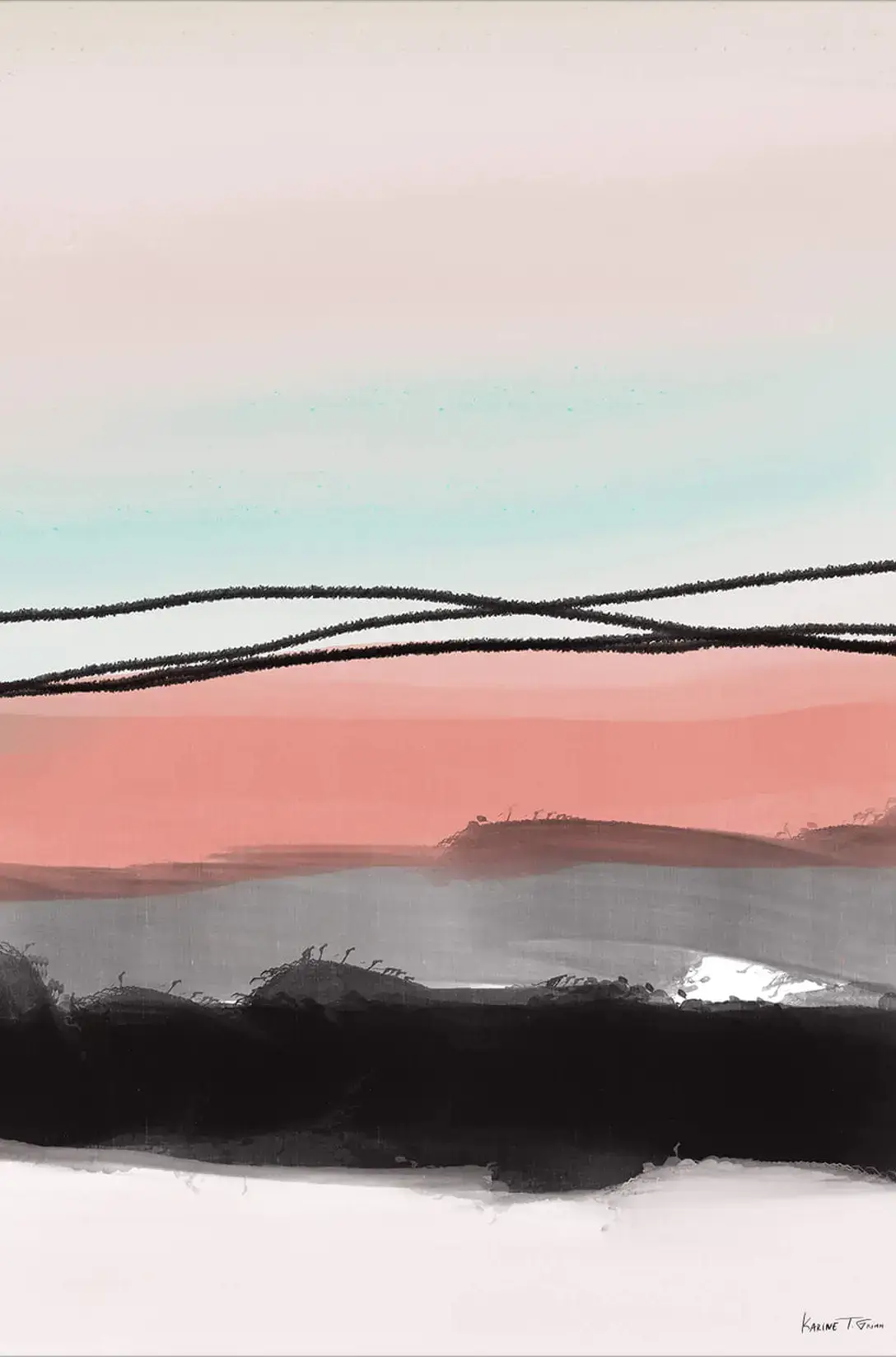 Horizontal bands of color create a serene landscape. Above, a soft pink transitions into a cool aqua, hinting at a tranquil dawn. Below, a bold black line defines the horizon, under which a deeper shade of the evening blush lies like a warm sea. The lower section is dominated by a rich, dark sweep, textured and rough, evoking the untamed beauty of a natural terrain. The contrasting textures and colors draw the viewer into a moment of stillness.