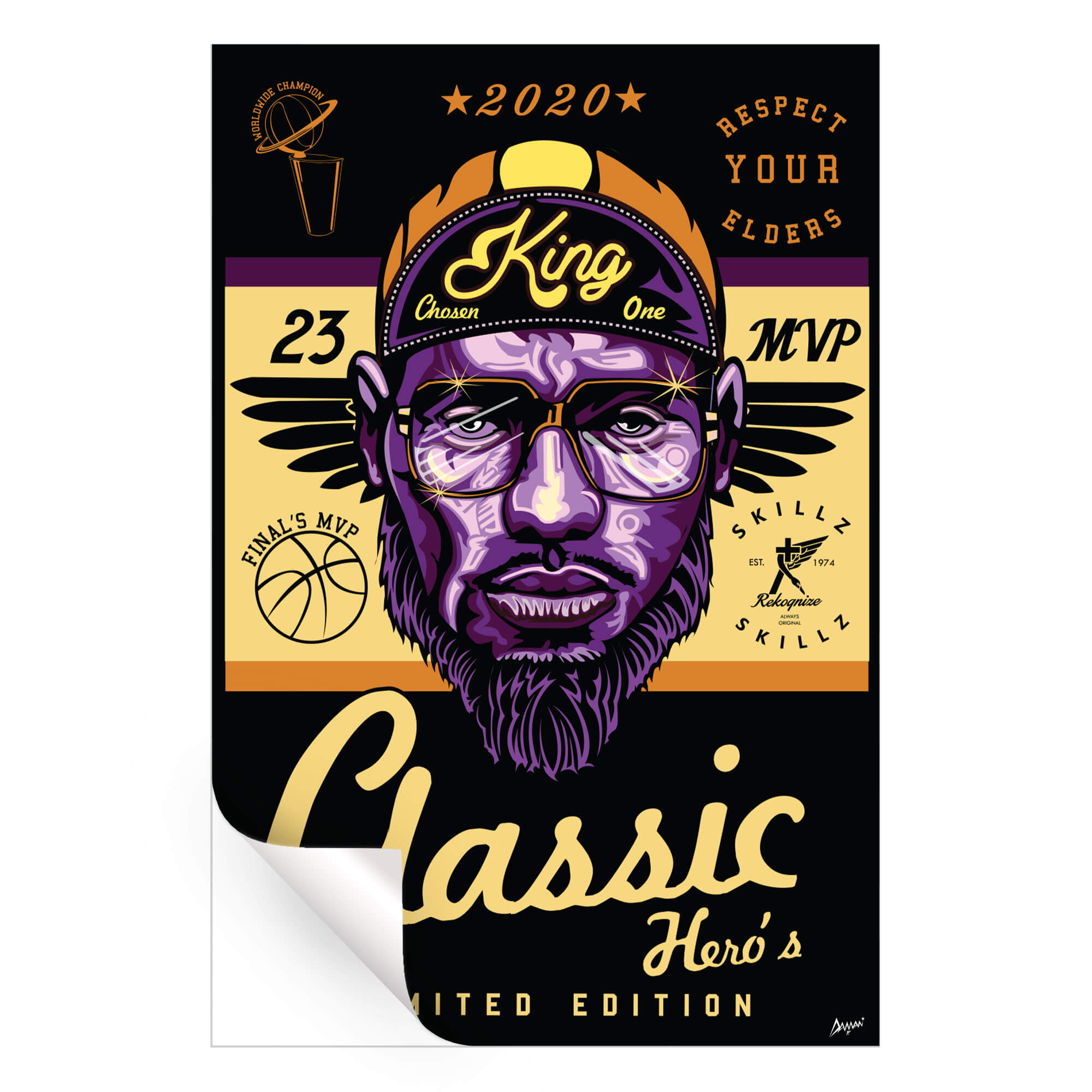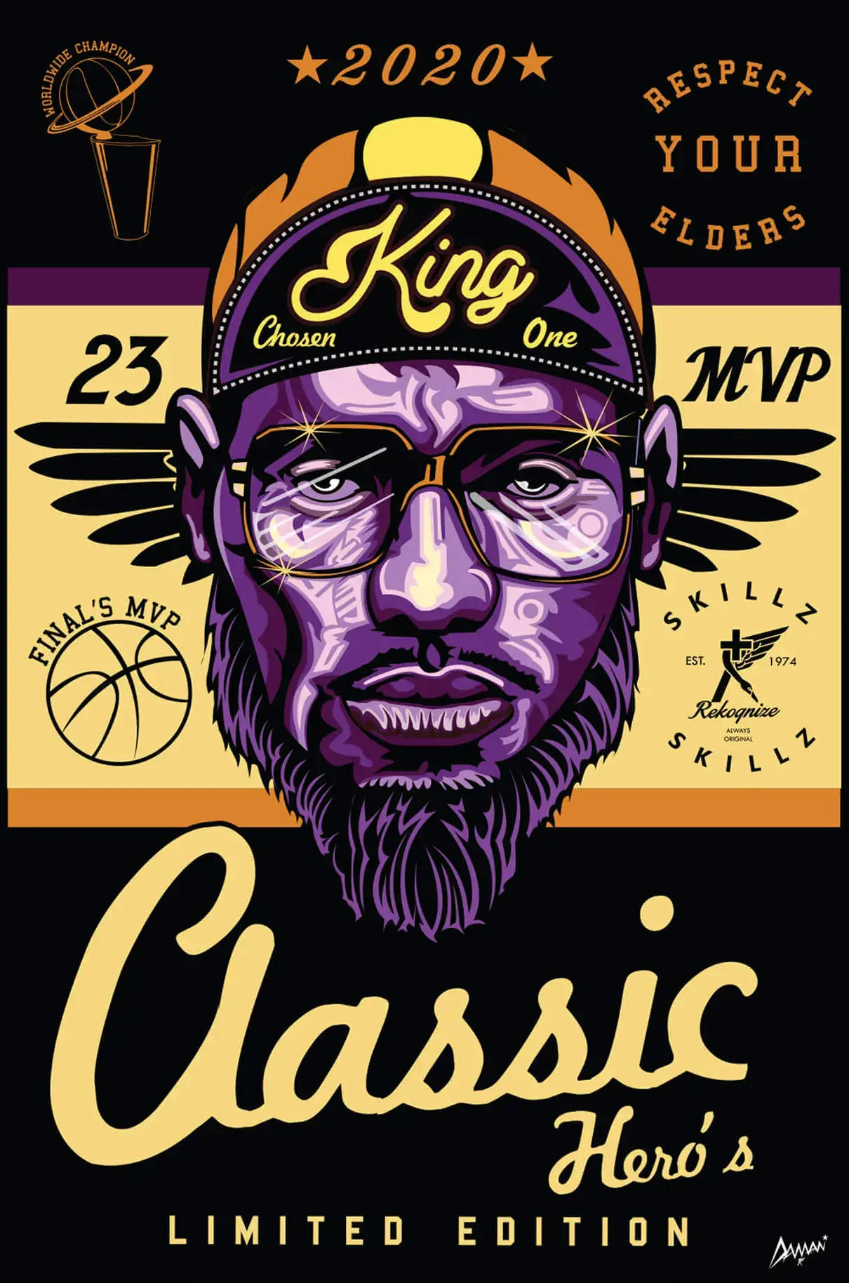 Captured in a bold, graphic style, this image showcases a basketball legend adorned with symbols of his numerous accolades. The crown and the title “King” sit prominently, alluding to his dominance on the court, while the design pays homage to his status as a revered figure in the sport.
