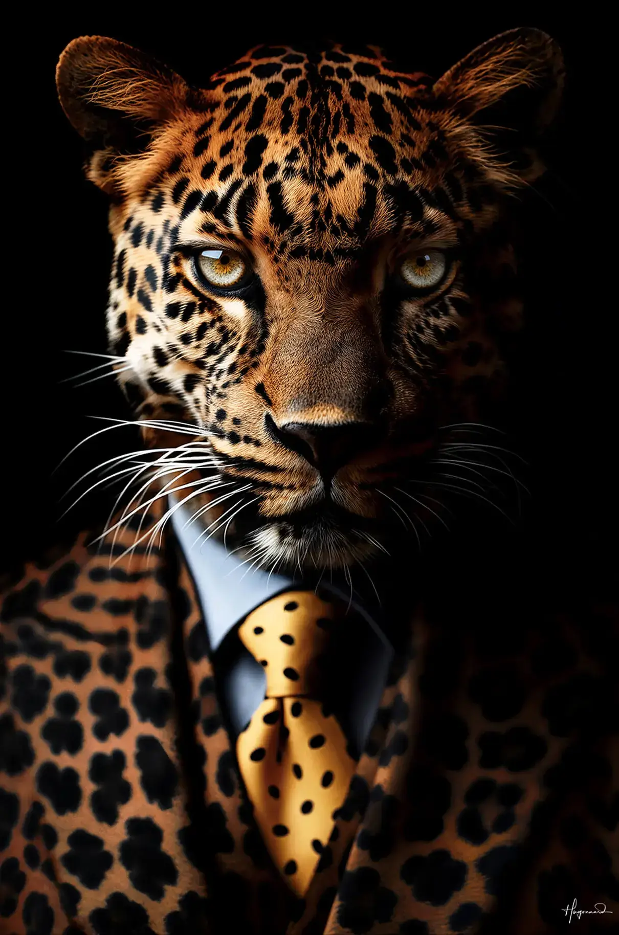 A leopard dressed in a stylish suit adorned with a bold pattern combines the wild beauty of nature with sophisticated fashion. The striking details of the leopard’s fur and intense gaze create a captivating focal point.