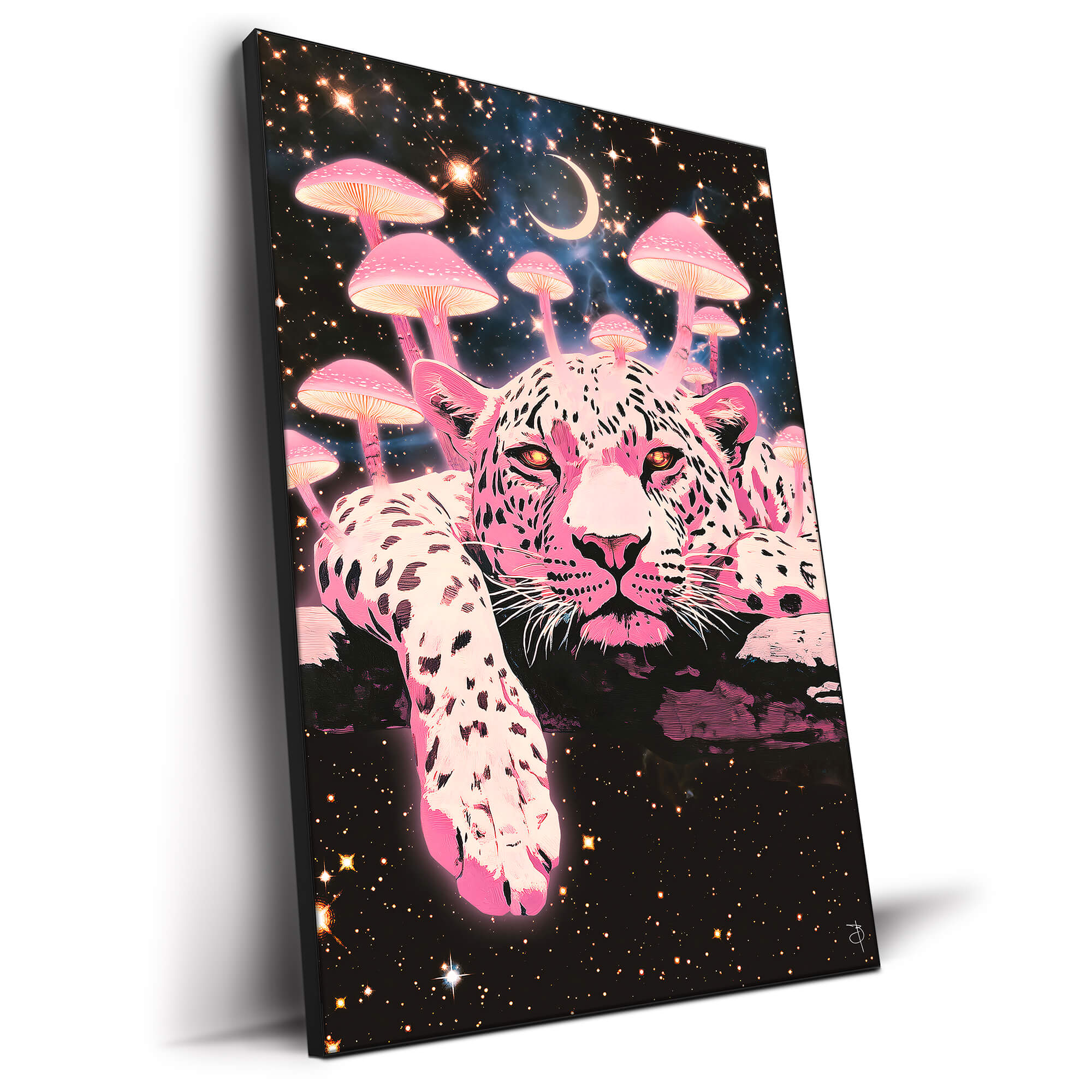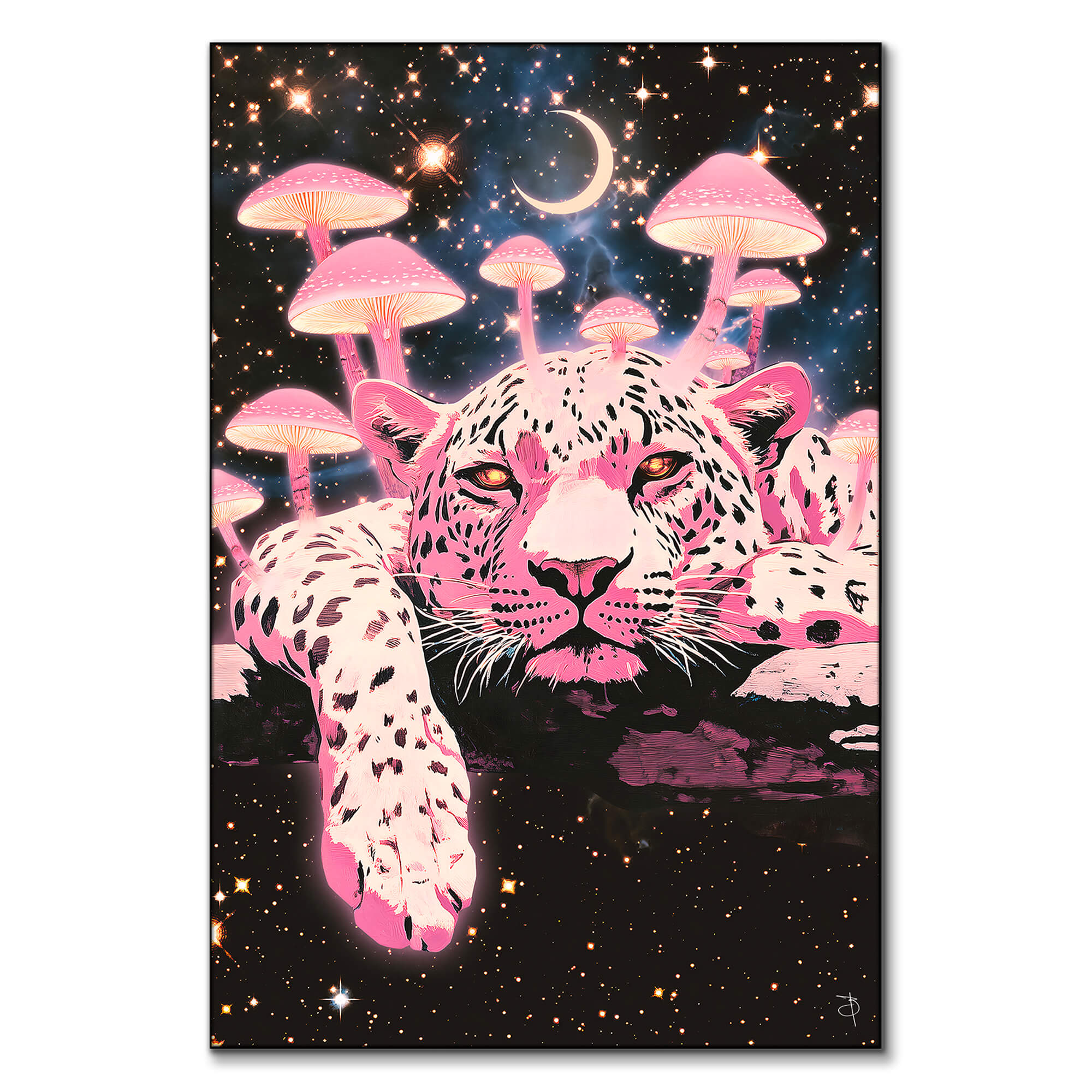 Step into a psychedelic universe with this captivating artwork that merges a pink leopard with surreal mushrooms and an expansive space backdrop. The face of the leopard is enveloped by neon-colored, trippy paint strokes, while floating mushrooms add a surreal, dreamlike touch to the composition.