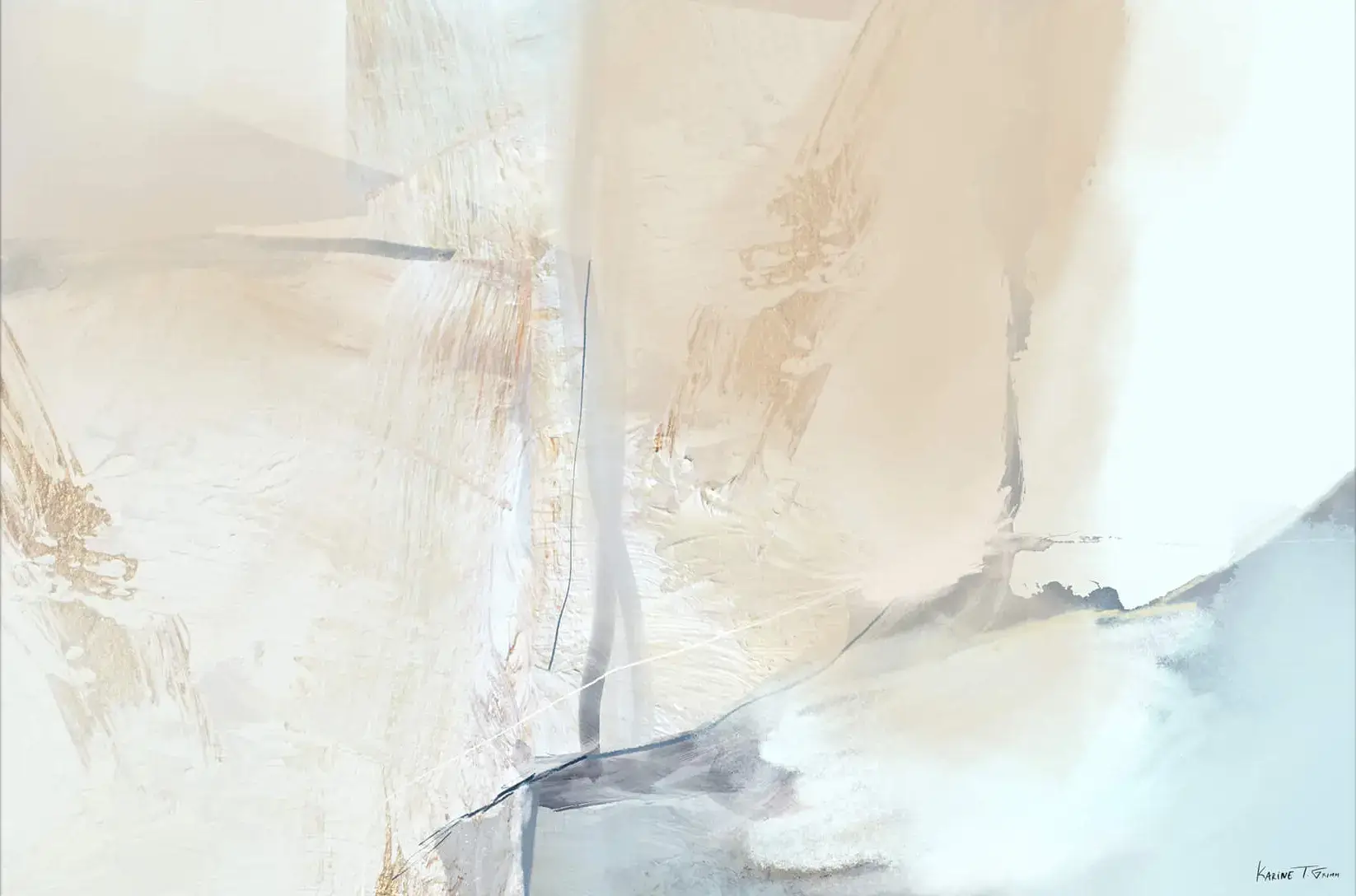 Swathes of creamy white and soft orangey-beige blend across the scene, their edges defined yet yielding, as if caught in a gentle breeze. Subtle textures within the light hues suggest depth. A bold streak of purplish grey cuts through, its path traced by an ethereal shadow, lending the piece a sense of motion.