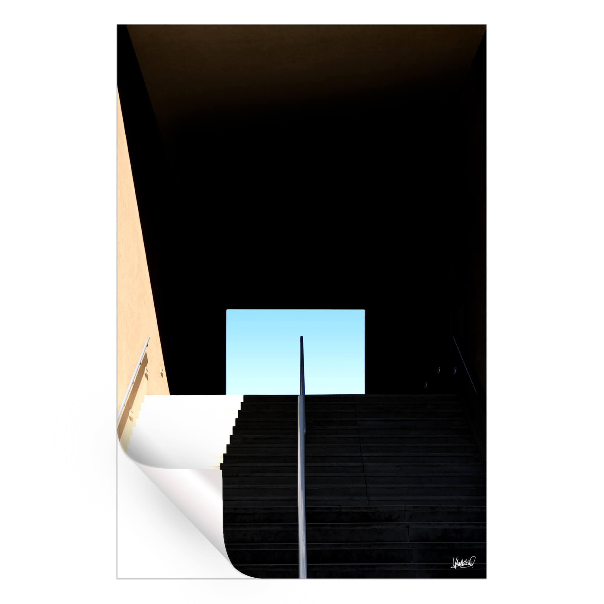 A grand staircase ascends into darkness, with a bright opening at the top framing a clear blue sky. The strong lines and sharp angles of the staircase create a striking composition, emphasizing the contrast between light and dark. The minimalist design and the interplay of shadows and light give the scene a powerful and contemplative feel.