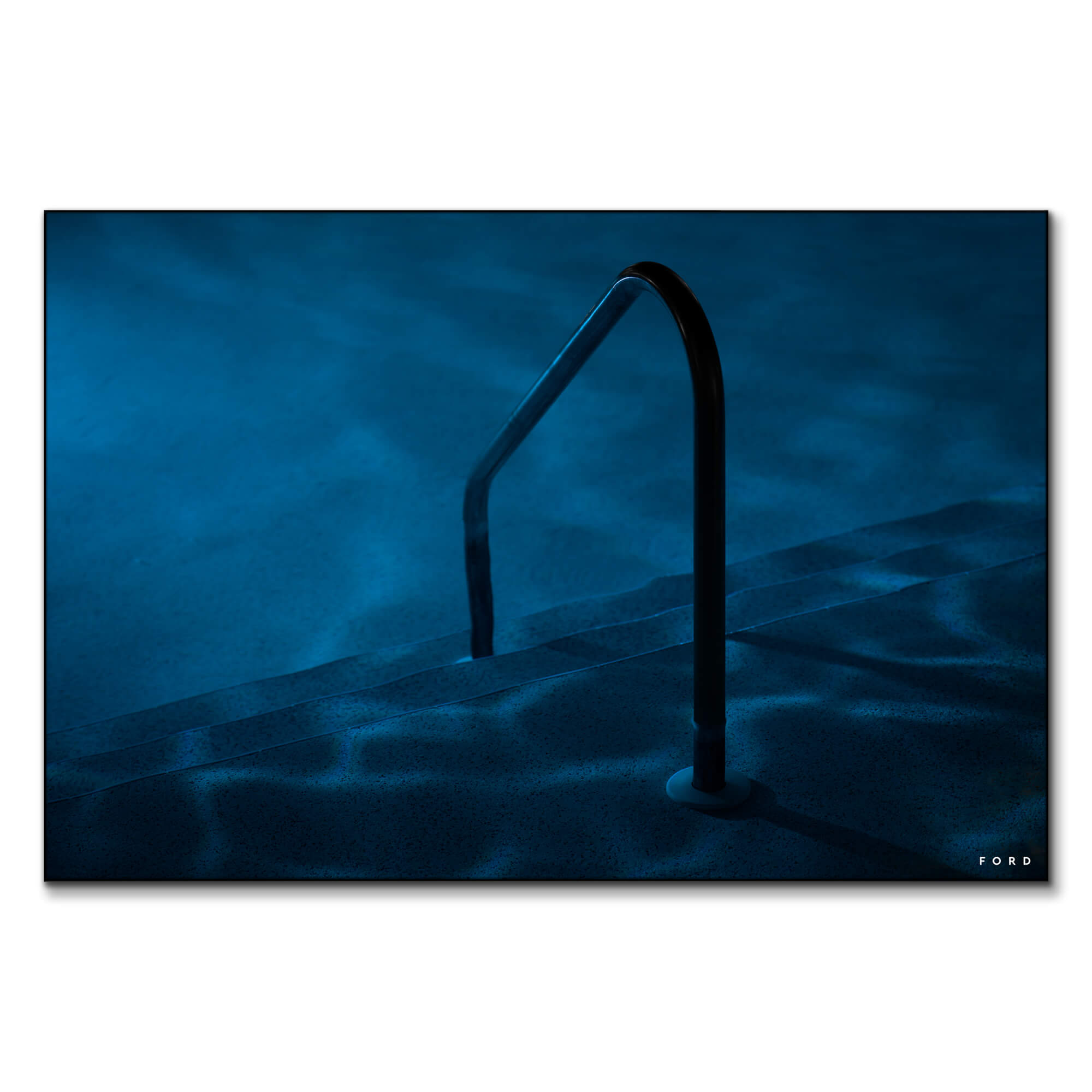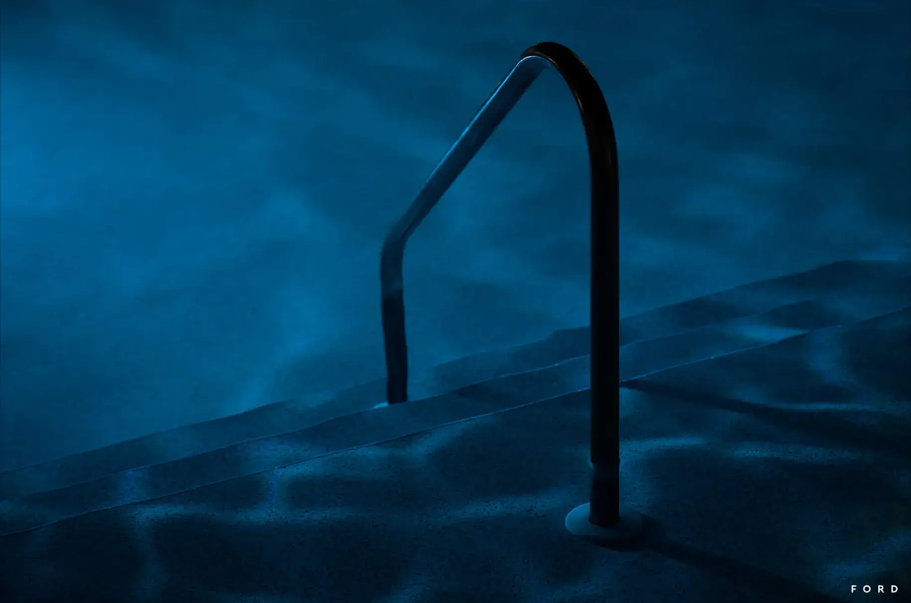 In this image, the simple elegance of a solitary pool ladder emerging from tranquil waters gives a moody, deep feeling. The lighting casts soft ripples and shadows across the pool’s bottom, creating a serene and almost otherworldly atmosphere. The deep blue hues suggest the coolness of the water and the quiet of a late evening swim. There’s a sense of stillness and calmness, with the ladder inviting one into the depth of the undisturbed water.