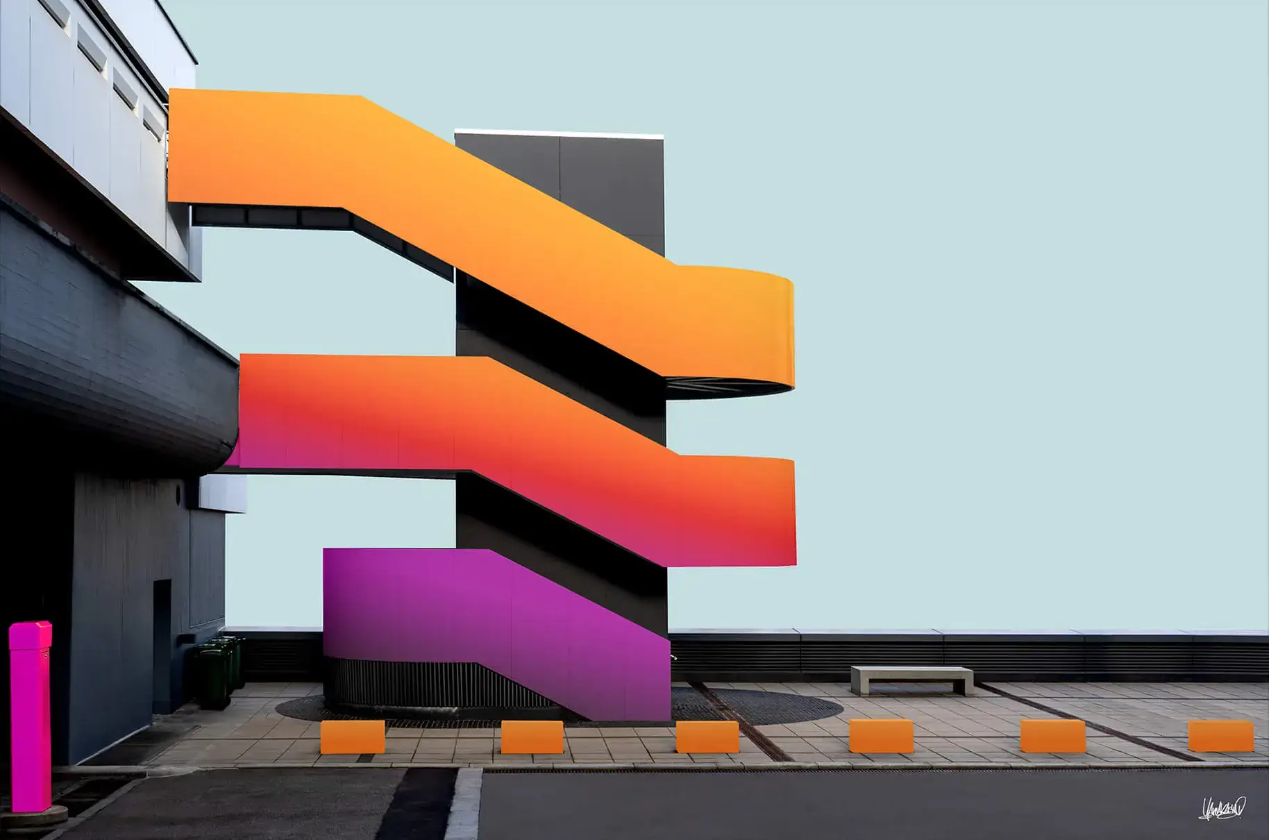 Vibrant orange and pink hues create a bold and eye-catching staircase. The angular lines of the staircase contrast sharply with the subdued background of the building, making the colors pop. The composition is both playful and structured, highlighting color and form in the contemporary architecture.