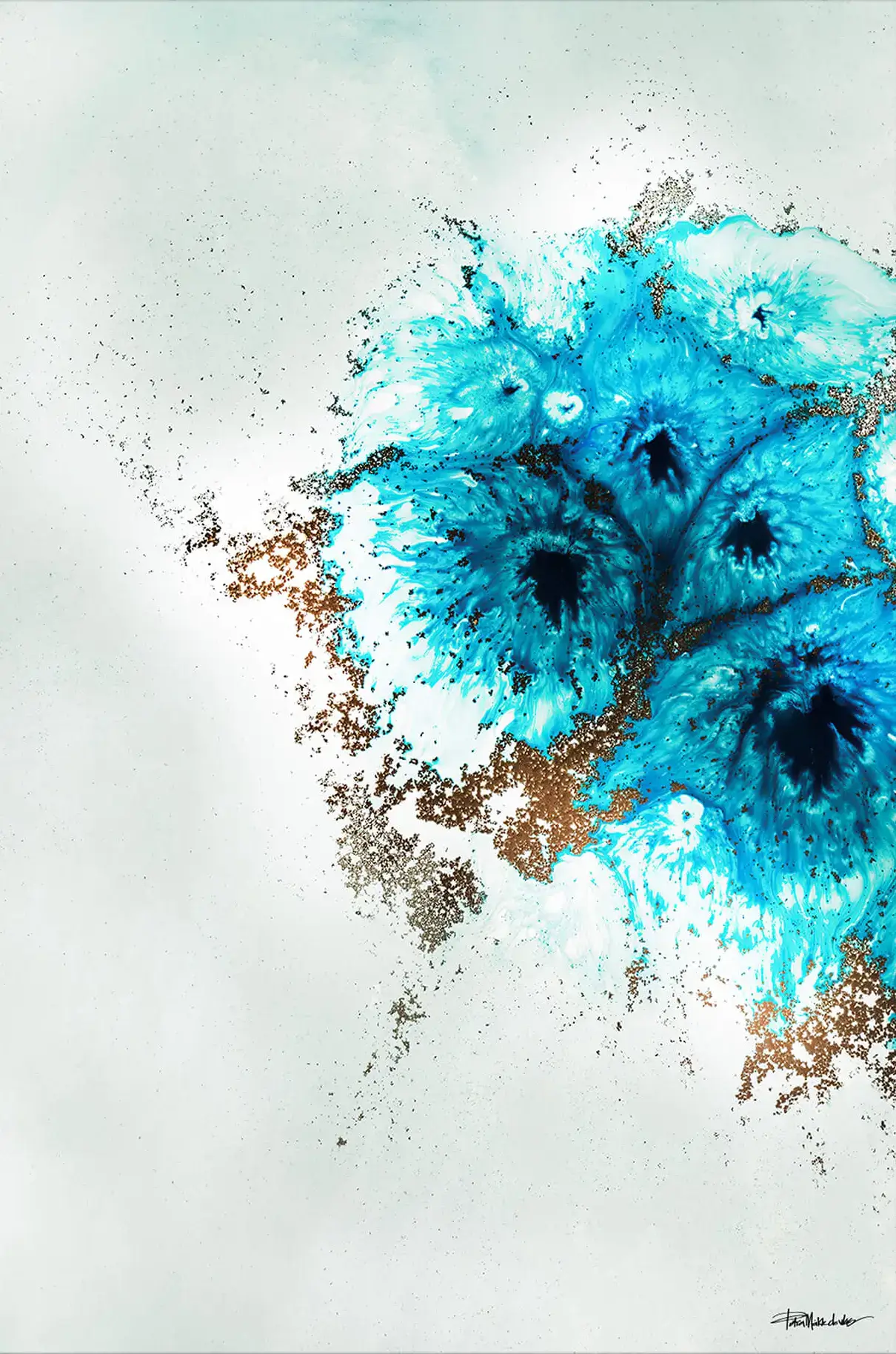 Bring a splash of vibrant energy to your space with this unique abstract ocean painting. The artwork showcases bursts of electric blue and delicate gold accents, reminiscent of the dynamic motion of ocean waves or abstract coral formations. The striking contrast of bright blues against the softer white background creates an eye-catching visual that adds a modern, artistic touch to any room. Ideal for coastal, contemporary, or minimalist interiors, this piece infuses your space with both sophistication and bold, organic movement.