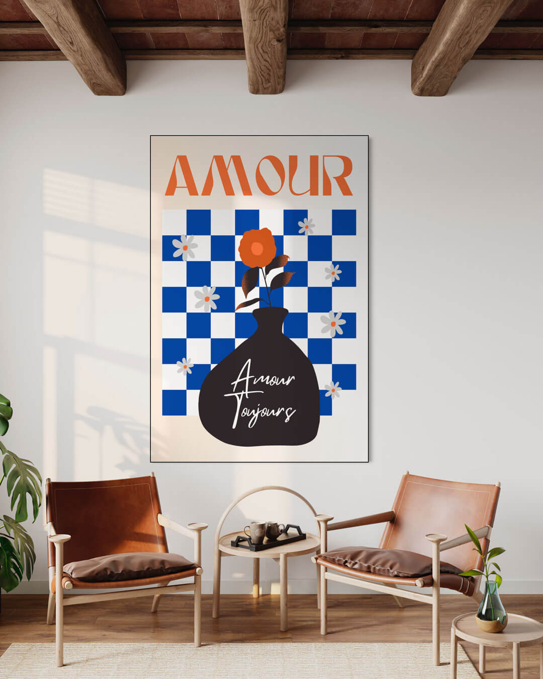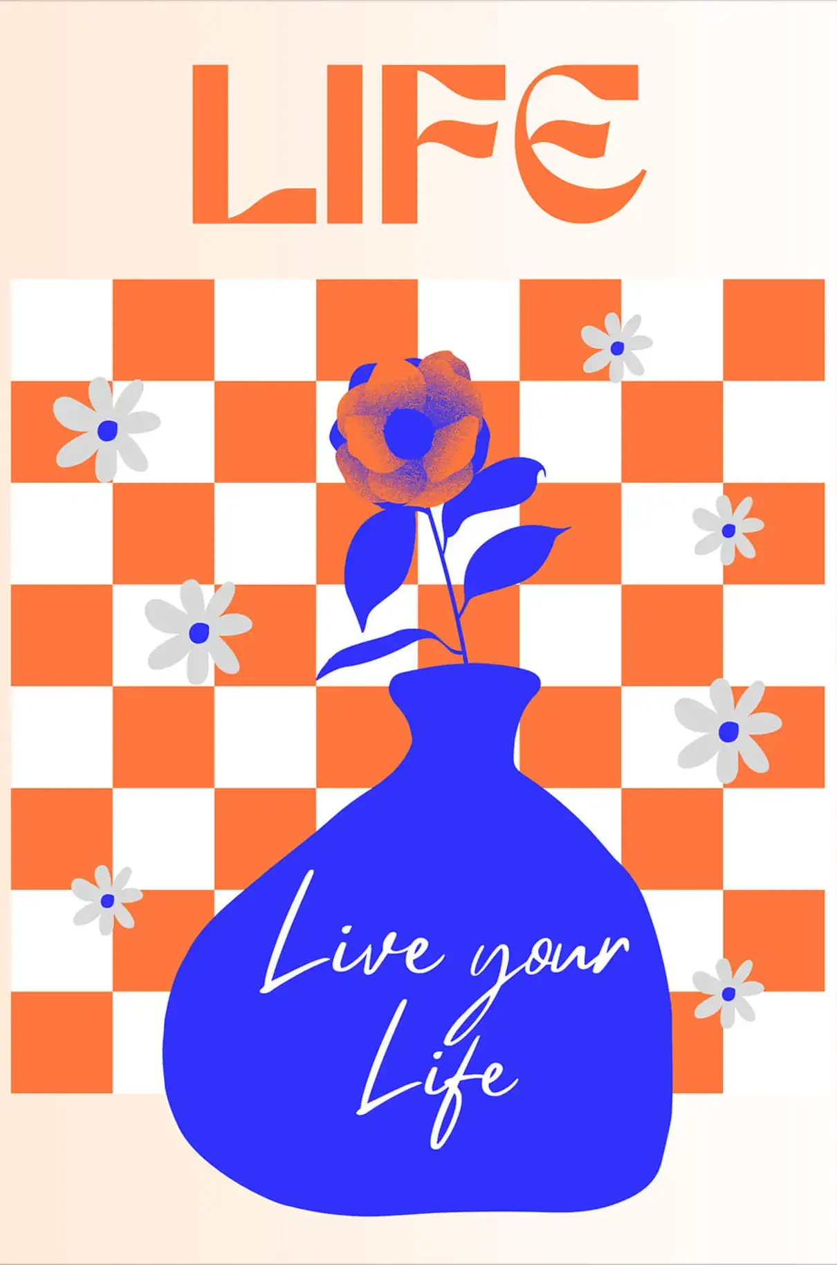 A lively orange checkered backdrop hosts a vivid blue vase, cradling a beautifully rendered rose that seems to burst with life. “Live your Life,” scripted on the vase, acts as a daily reminder to embrace every moment with zeal. Ideal for those who seek a touch of inspiration in their daily surroundings, this piece is a beacon of positivity, encouraging viewers to lead a life filled with passion and purpose.