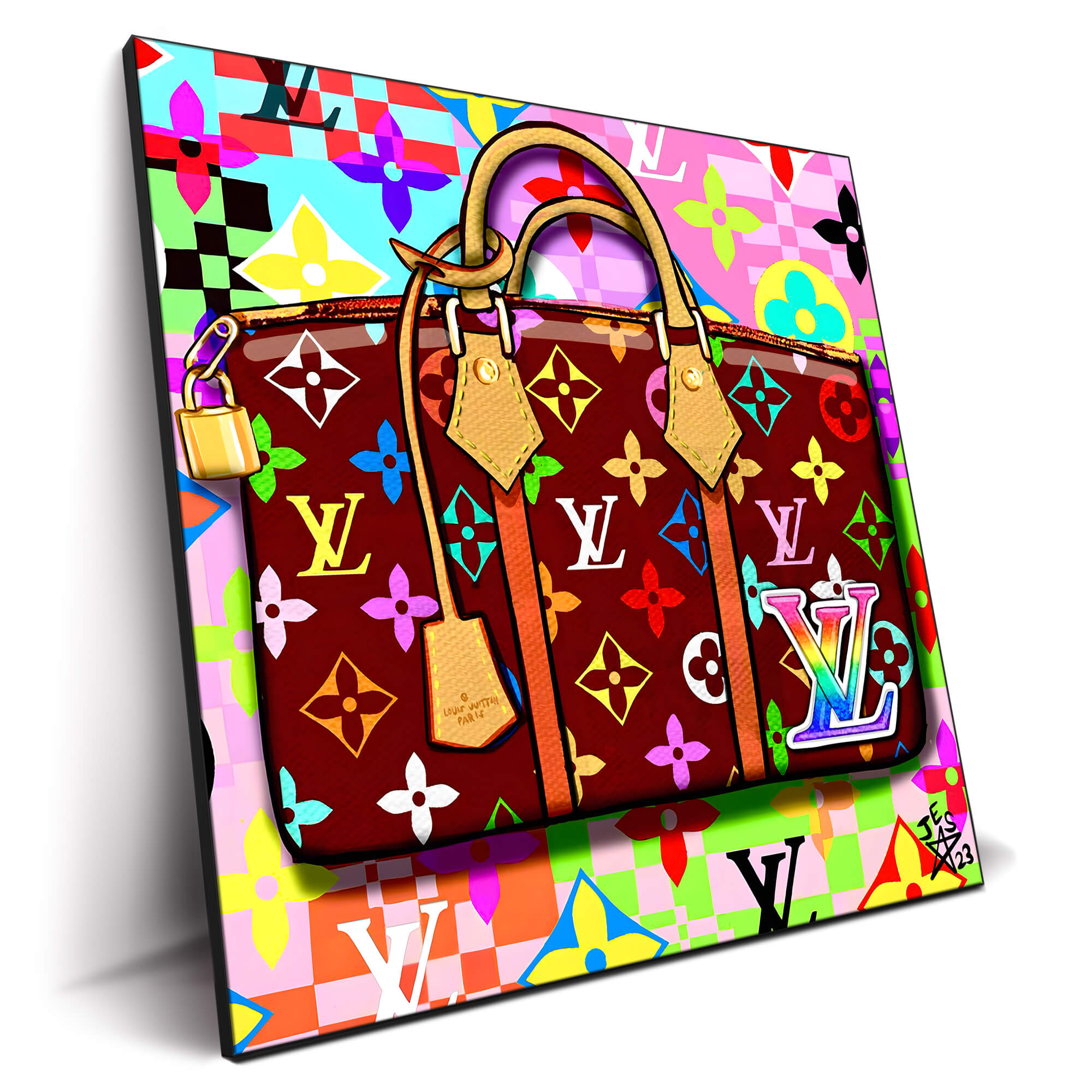 Louis Vuitton handbag with the recognizable brown and gold monogram pattern is featured. The bag has tan leather handles and a tag, with a padlock on one side. It is set against a patterned background with colorful floral shapes and various abstract designs. The image is rich in color and showcases the bag as a standout piece.