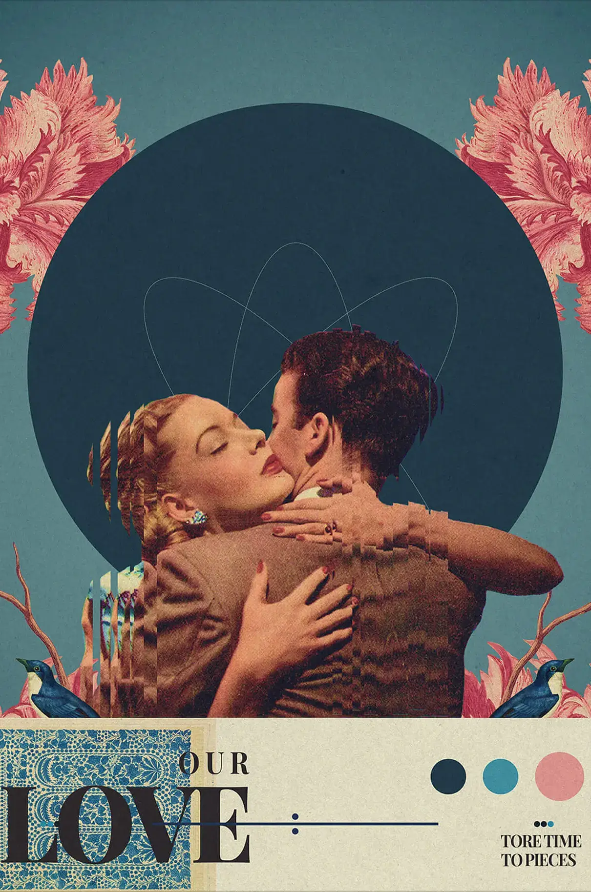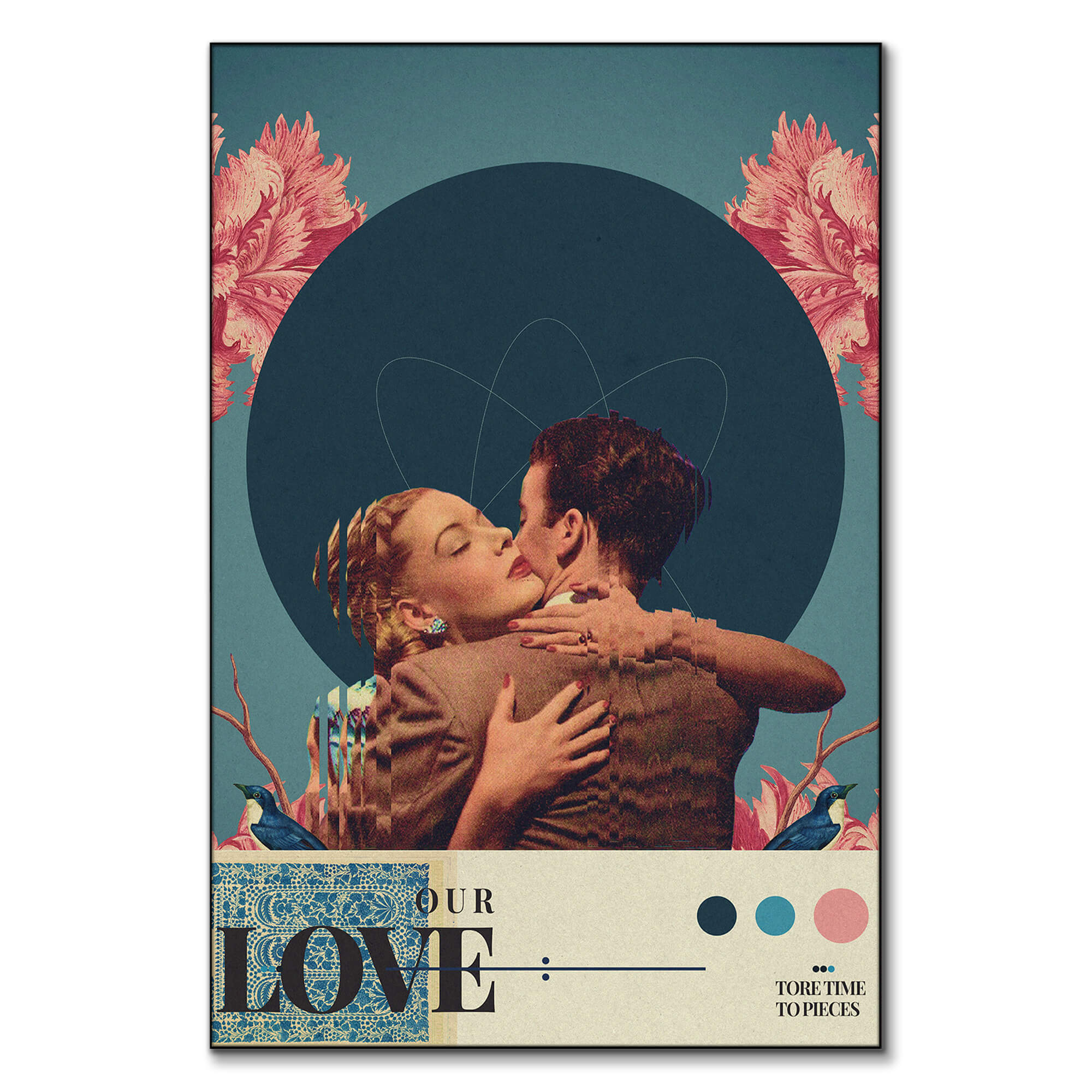 This romantic vintage collage captures the nostalgia of mid-century love through bold color and layered symbolism. A couple embraces against a deep teal background, framed by soft pink florals and atomic-inspired geometry. The textures and typography add retro charm while keeping the composition sleek and modern.
