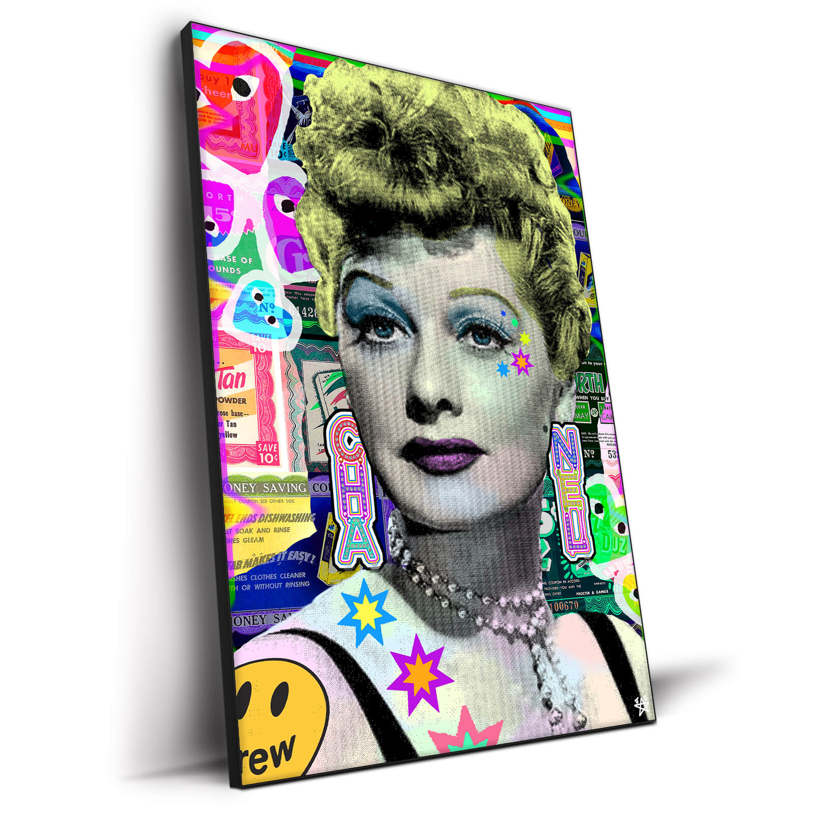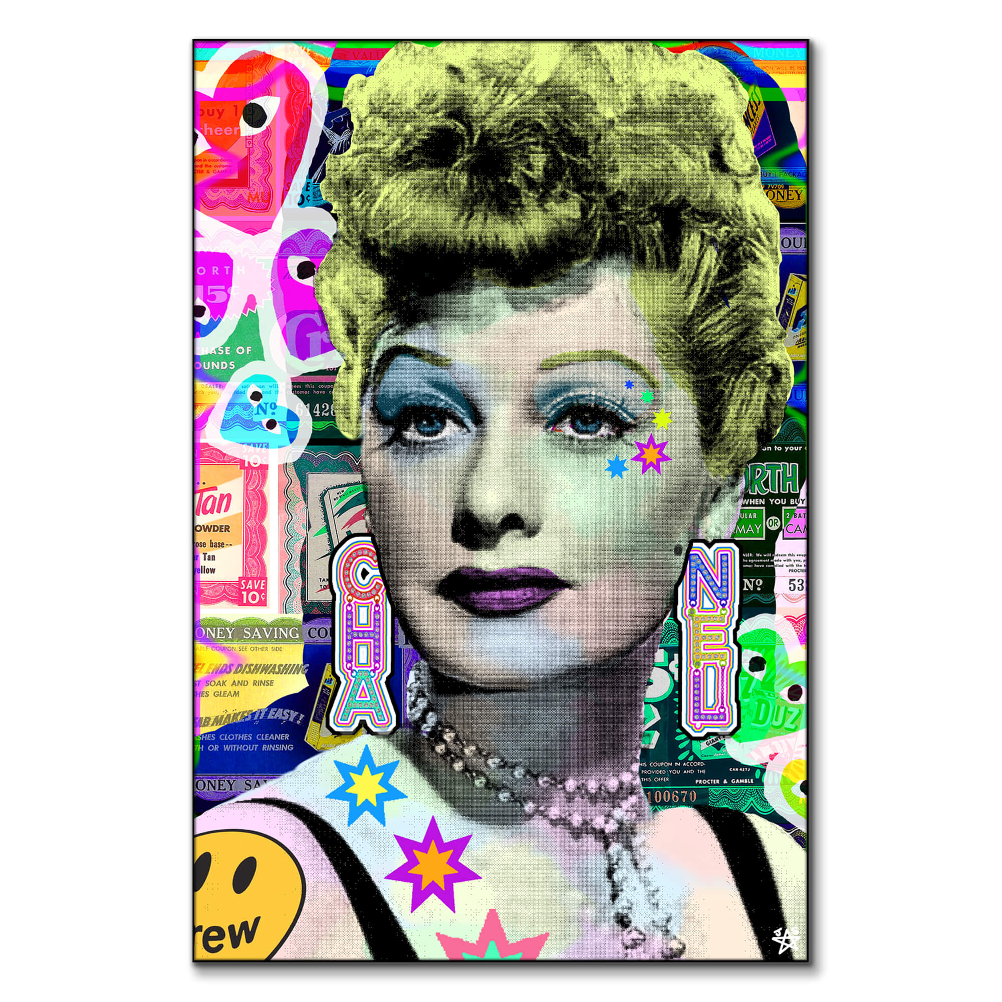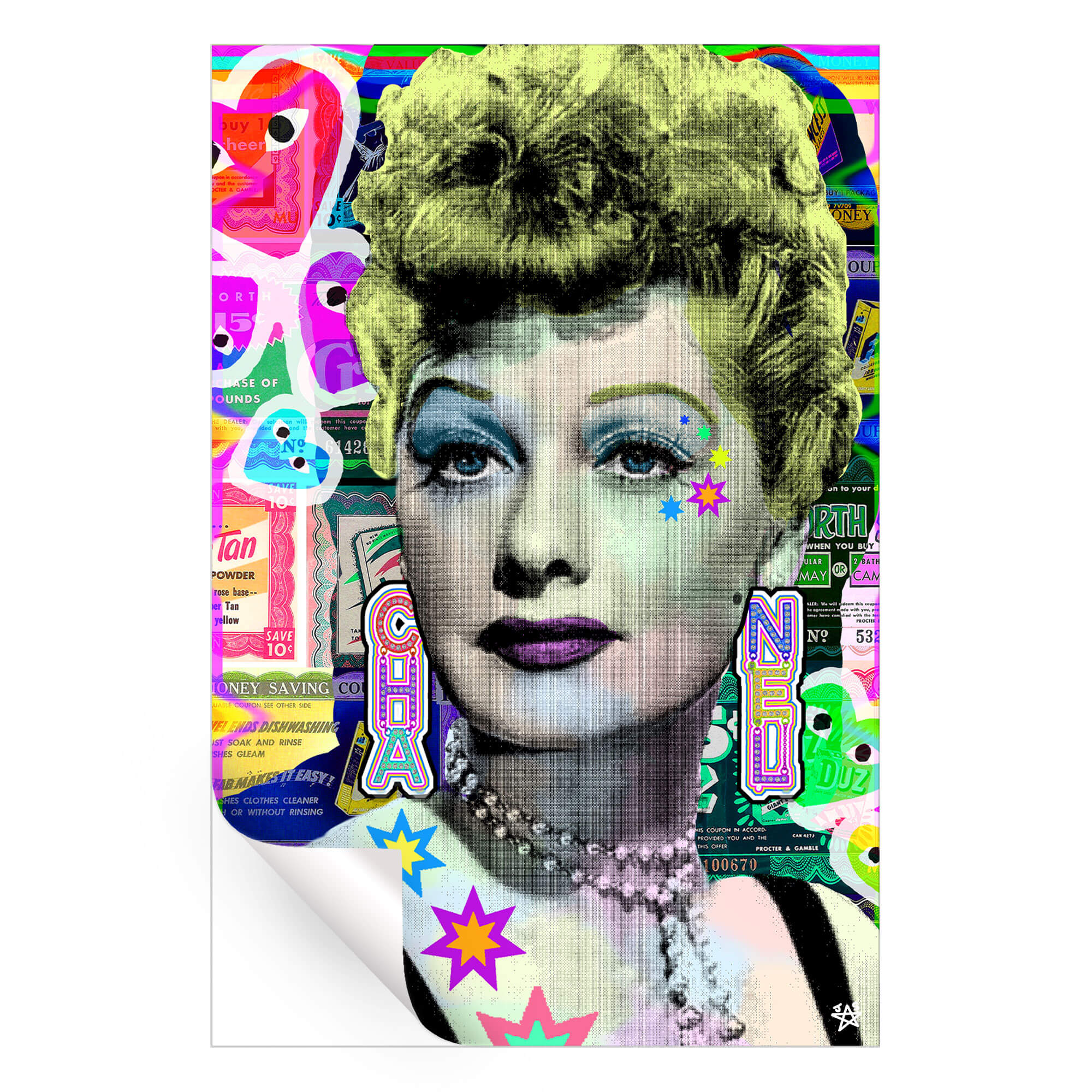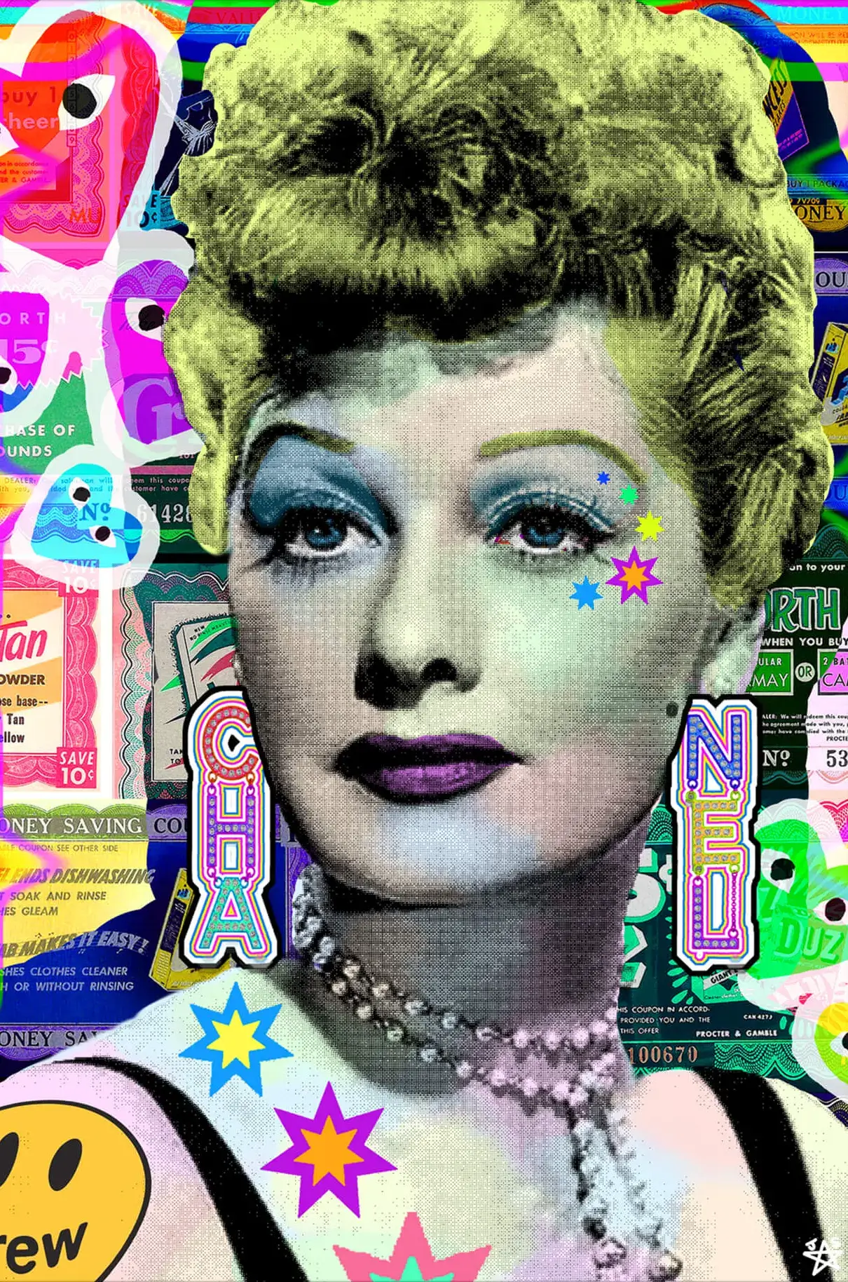 A black and white image of a Lucille Ball with her vintage hairstyle and makeup is superimposed over a collage of colorful advertisements and icons. Her lips and eye makeup are highlighted in purple. Stars and other shapes in neon colors are added around her face for a modern twist. The juxtaposition creates a contrast between classic and contemporary graphic styles.