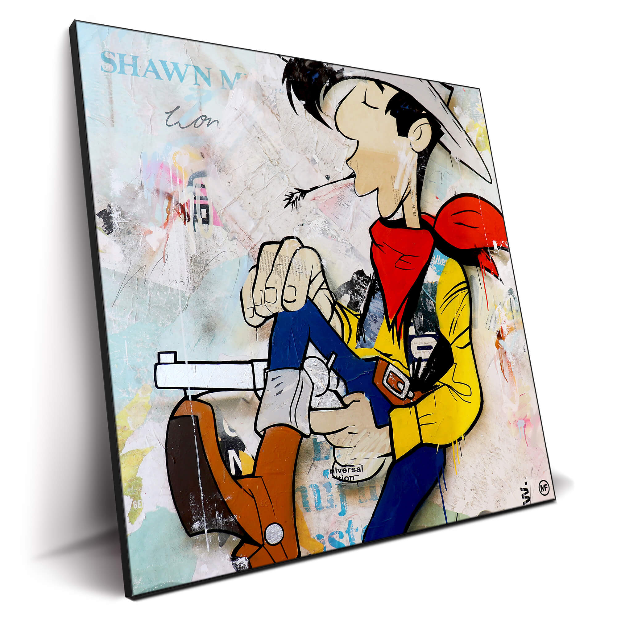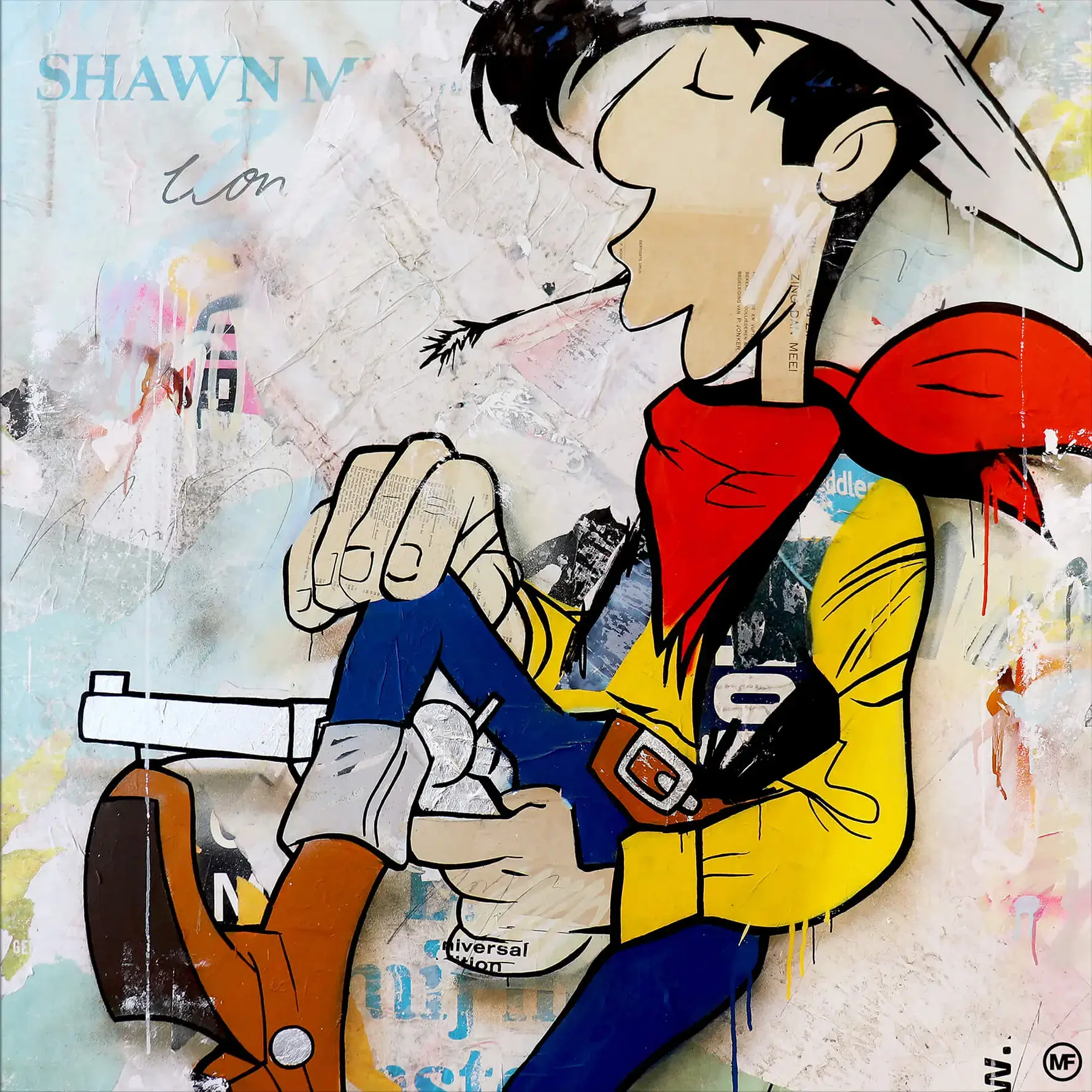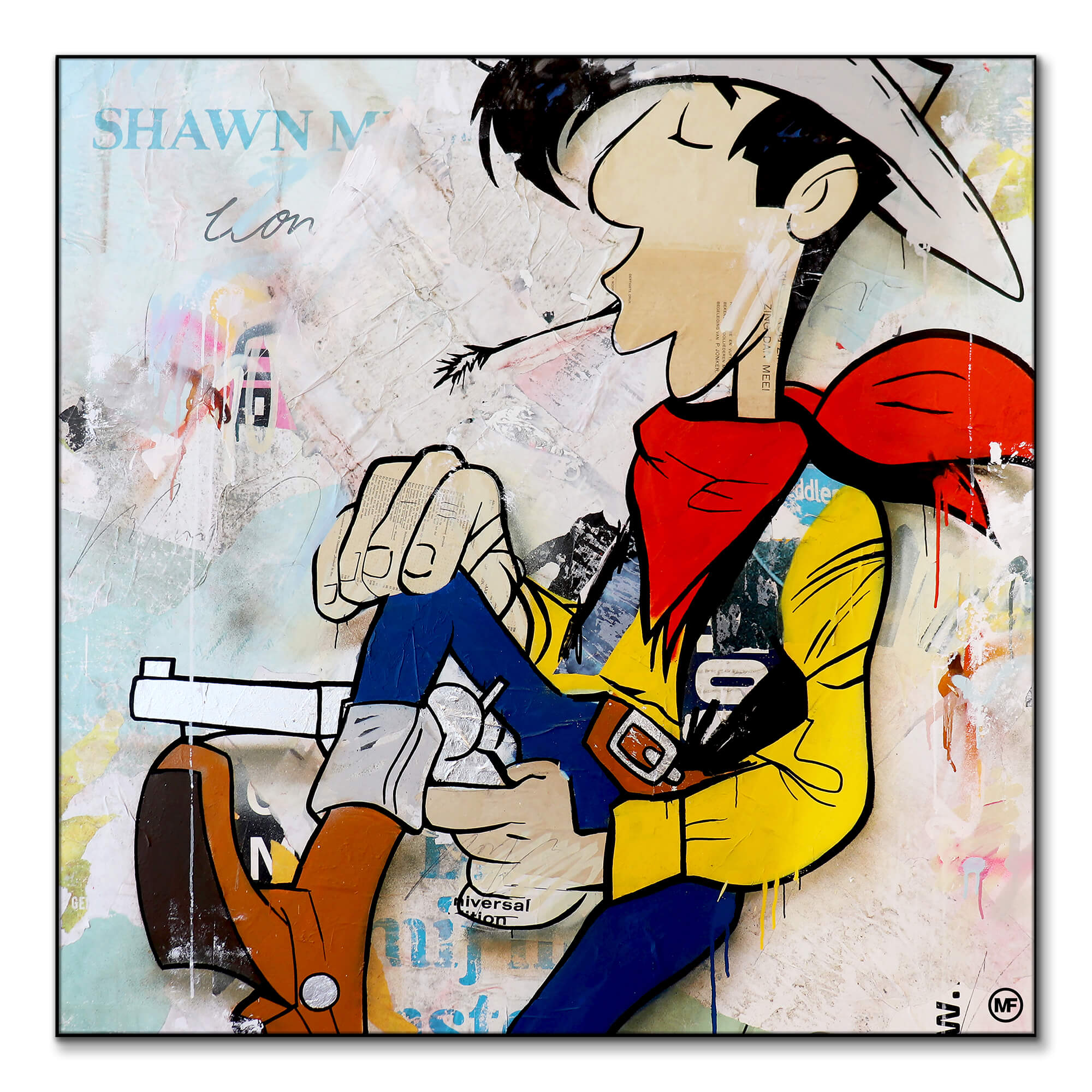 A cartoon cowboy, depicted in a playful style, captures the spirit of the Wild West with a modern twist. The bold colors and whimsical details make this piece a fun addition to any décor.