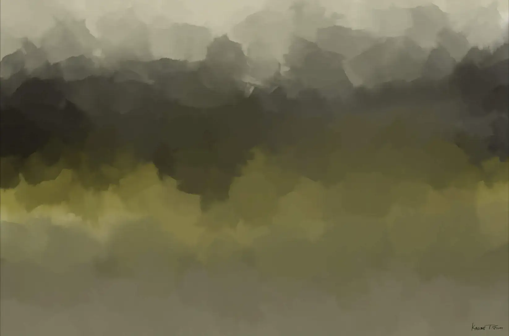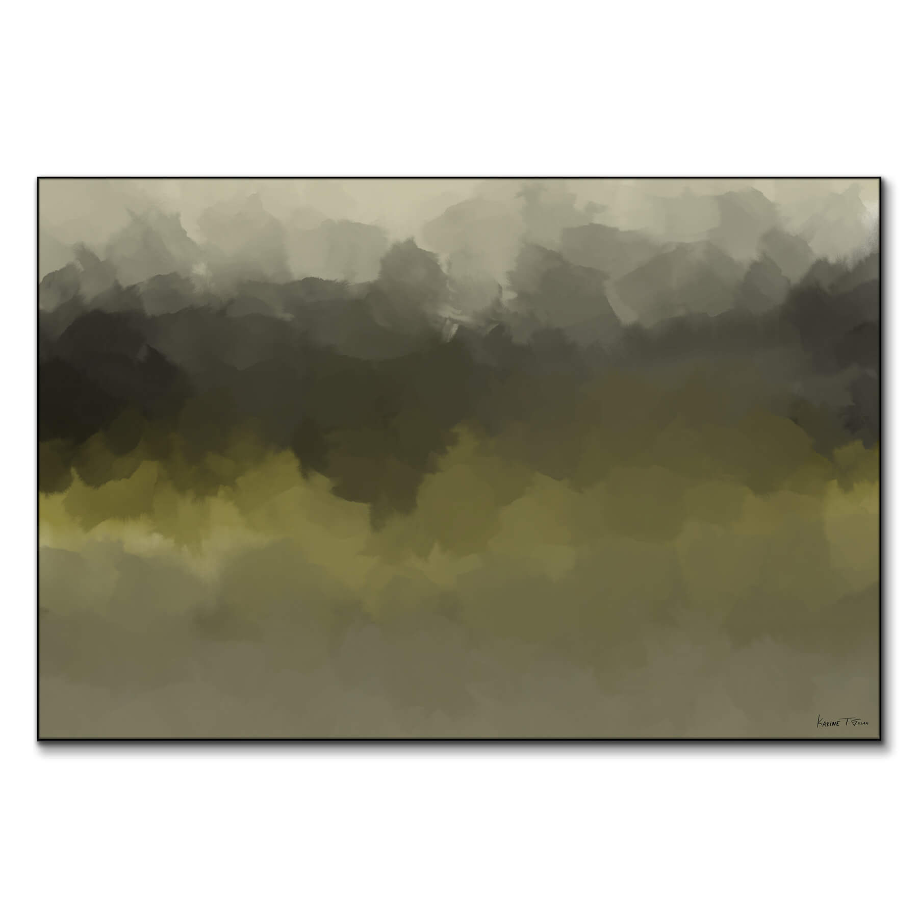 Swathes of green and earthy tones blend together in a tranquil dance on the canvas, evoking a landscape bathed in the soft light of dawn. Karine Tonial Grimm masterfully layers brushstrokes to create a sense of depth and movement, inviting the viewer to explore the quiet complexity within the painting.