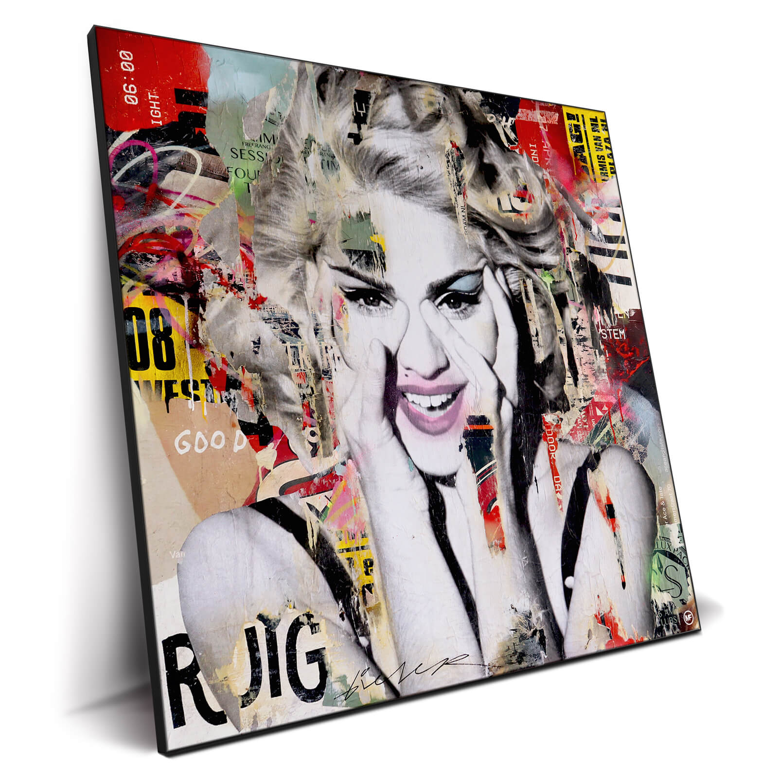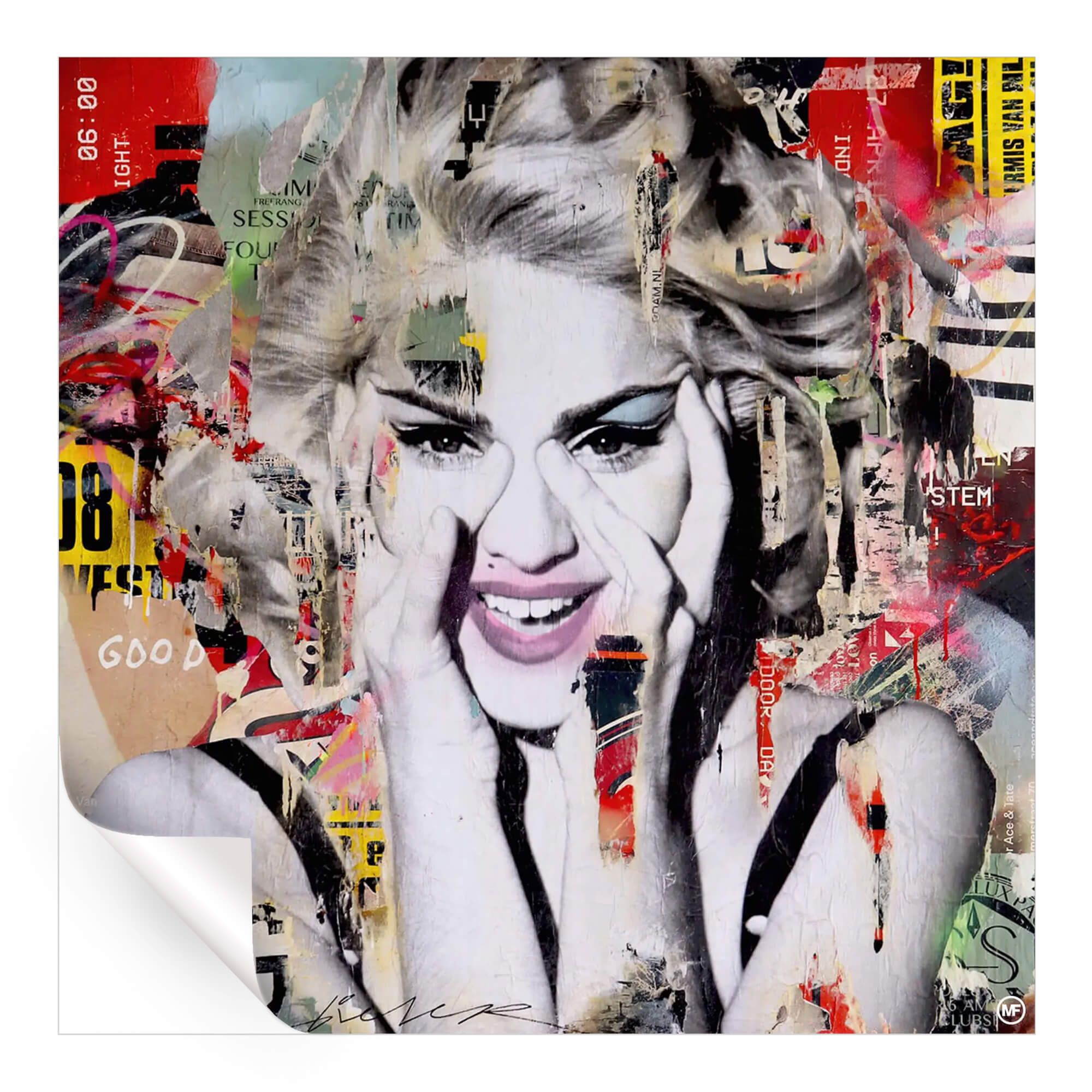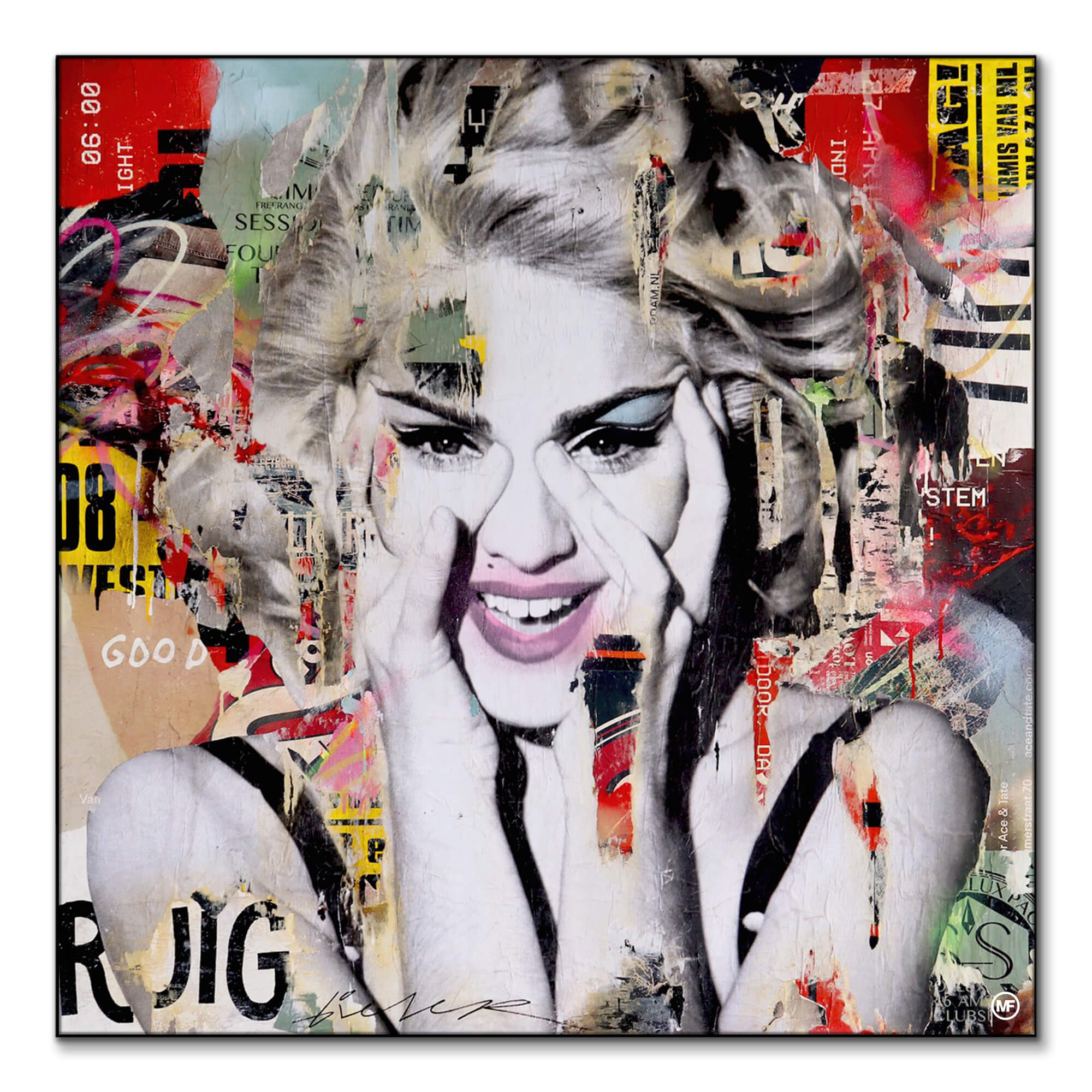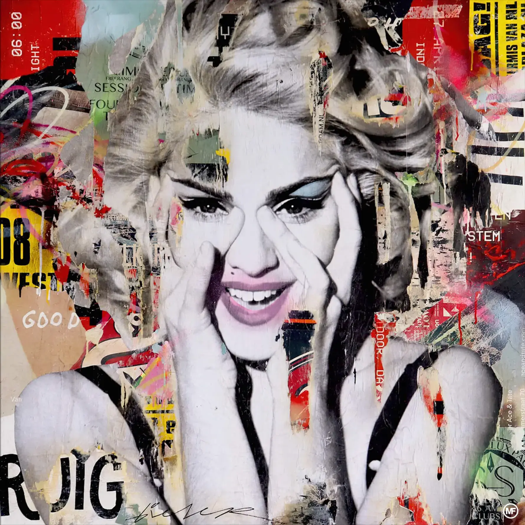 The piece is a symphony of texture and contrast, with layers of newspaper clippings and bold graffiti adding depth and complexity to Madonna’s striking portrait. Her signature confidence and style are on full display, set against a backdrop that captures the vibrant chaos of the era she dominated.