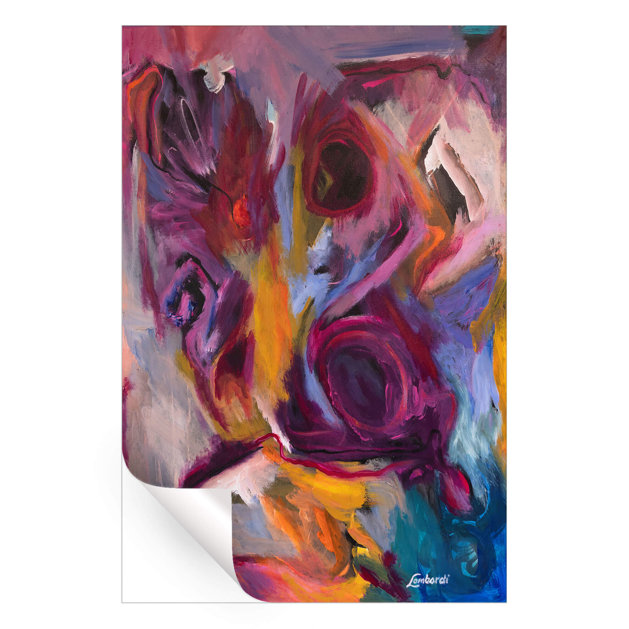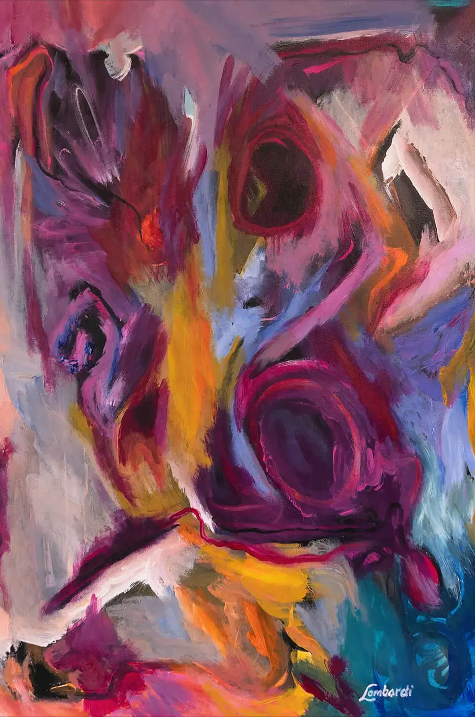 Dramatic shades of magenta and purple swirl together in this abstract artwork by Bob Lombardi, evoking a sense of depth and mystery. Bold strokes of orange and yellow add a fiery contrast, cutting through the cooler tones with warmth and energy.
