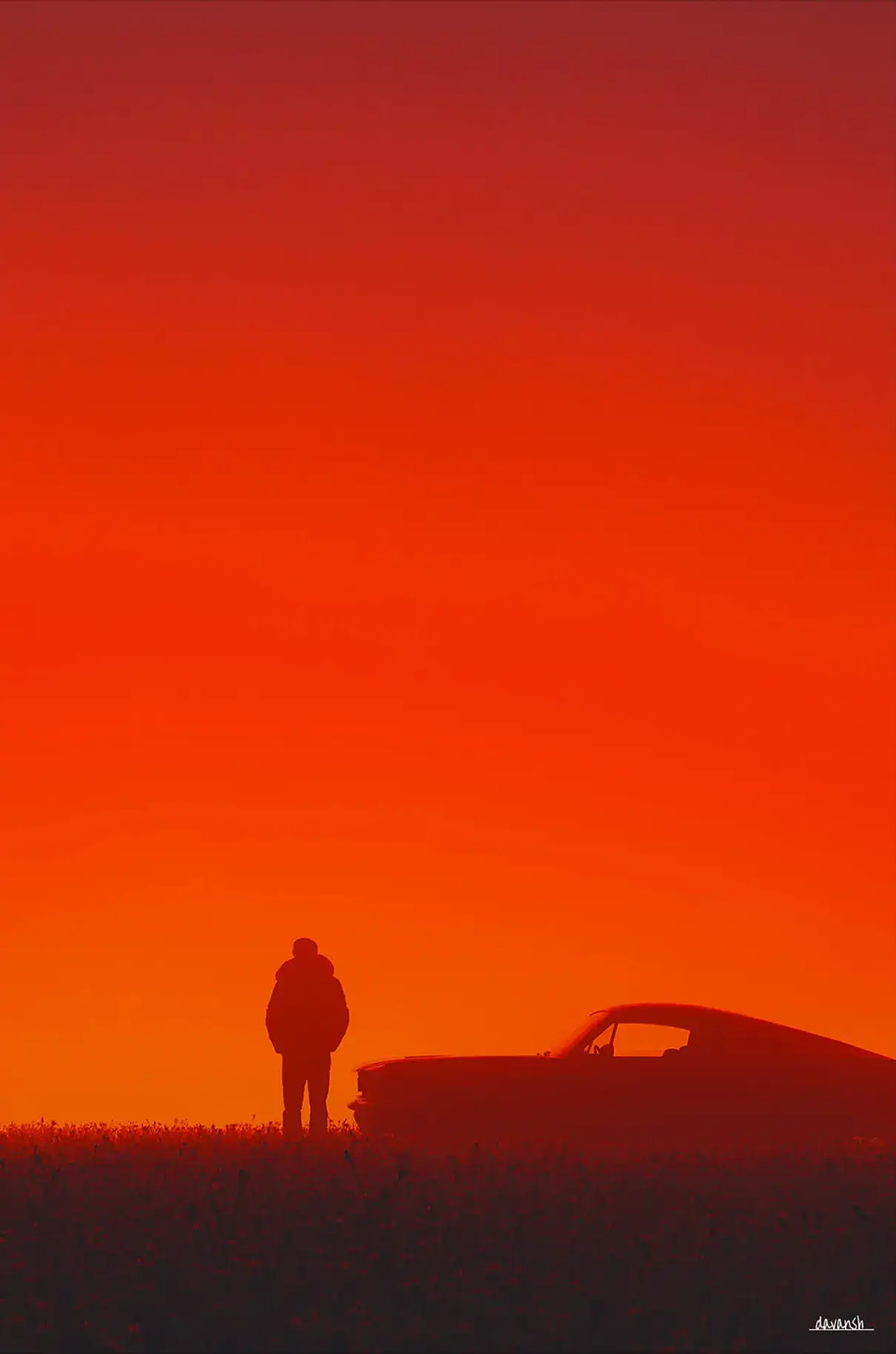 In this dramatic artwork, a solitary figure stands next to a vintage car, gazing into a breathtaking sunset that fills the sky with rich oranges and reds. The contrast of the dark silhouette against the vibrant sky creates a sense of nostalgia and introspection. This piece invites viewers to reflect on their journey while appreciating the beauty of quiet moments.