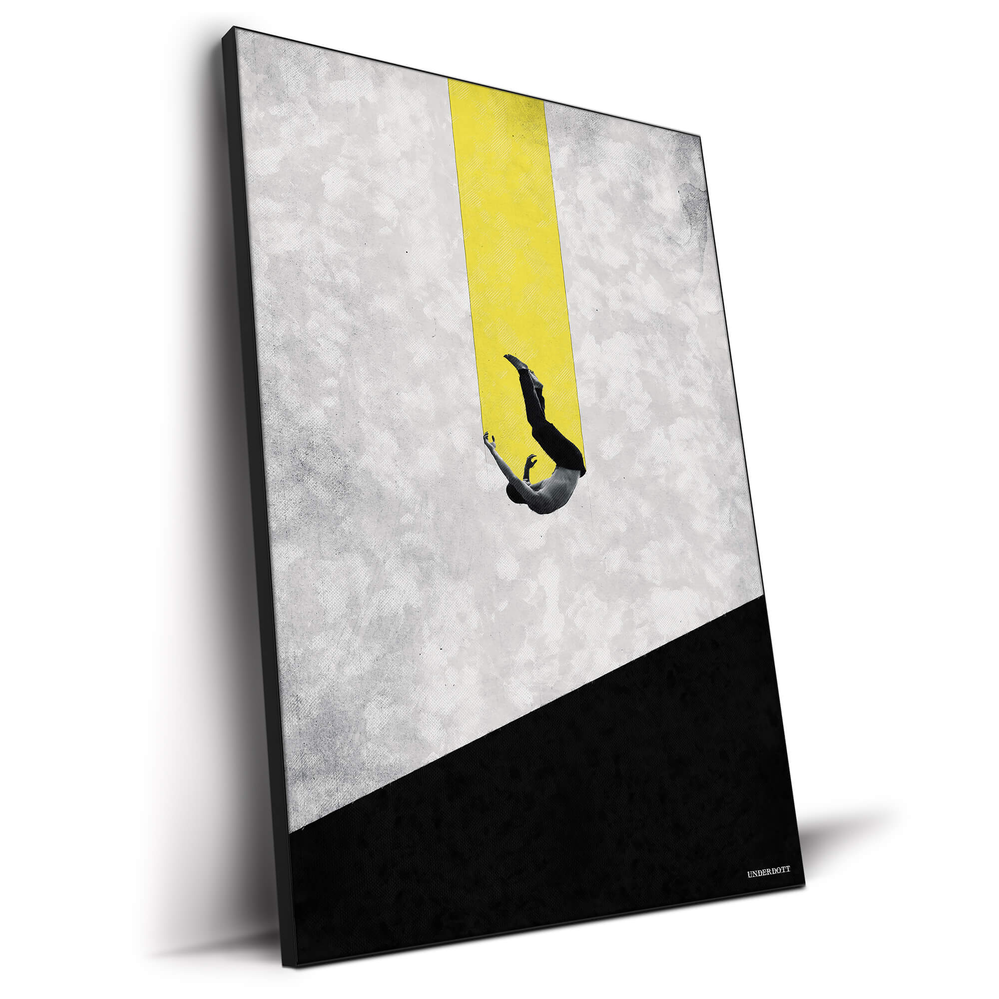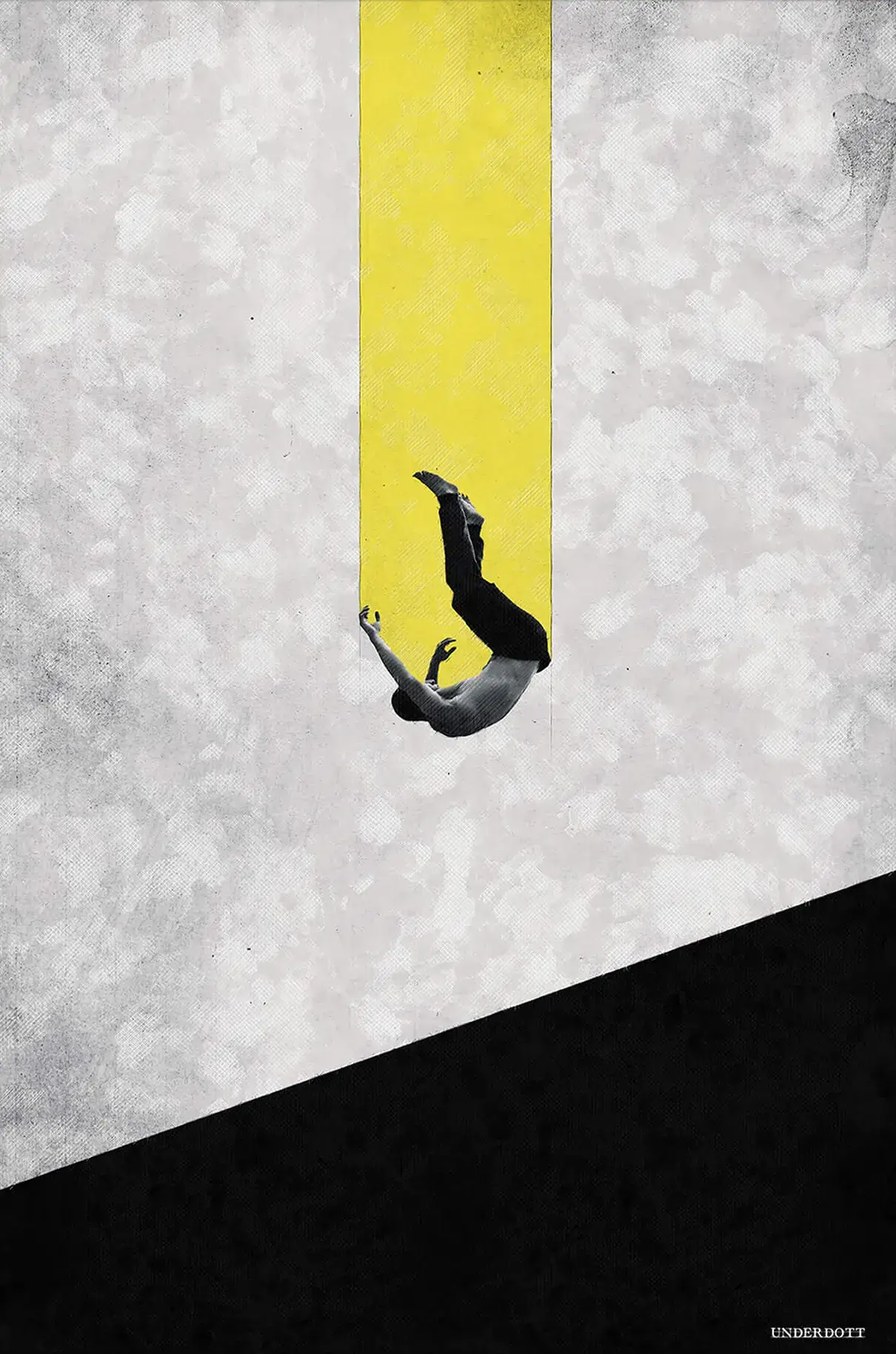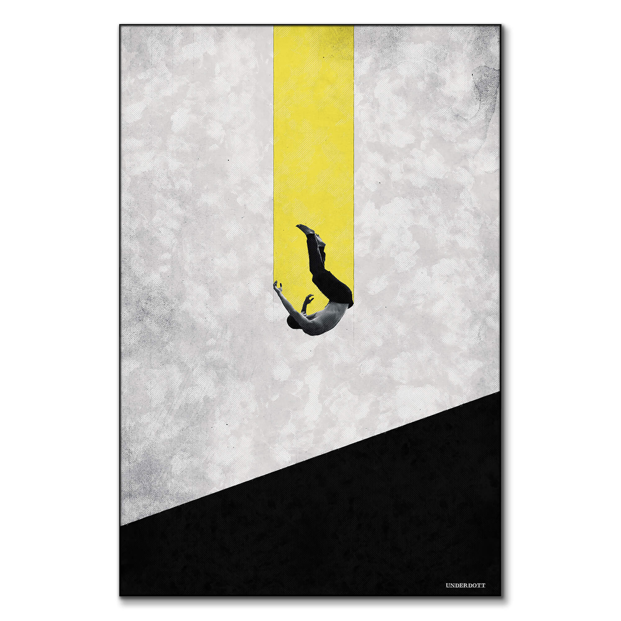 Soft cloudy texture fills the background, almost like concrete catching gentle light. In the middle, a bright vertical stripe of yellow drops from the top of the print, the only warm color in the scene. Inside it, a figure leans backward as if falling or floating, arms stretched as they try to catch balance. The person is shown in simple black and white, which makes the yellow stripe feel even stronger and more intense.