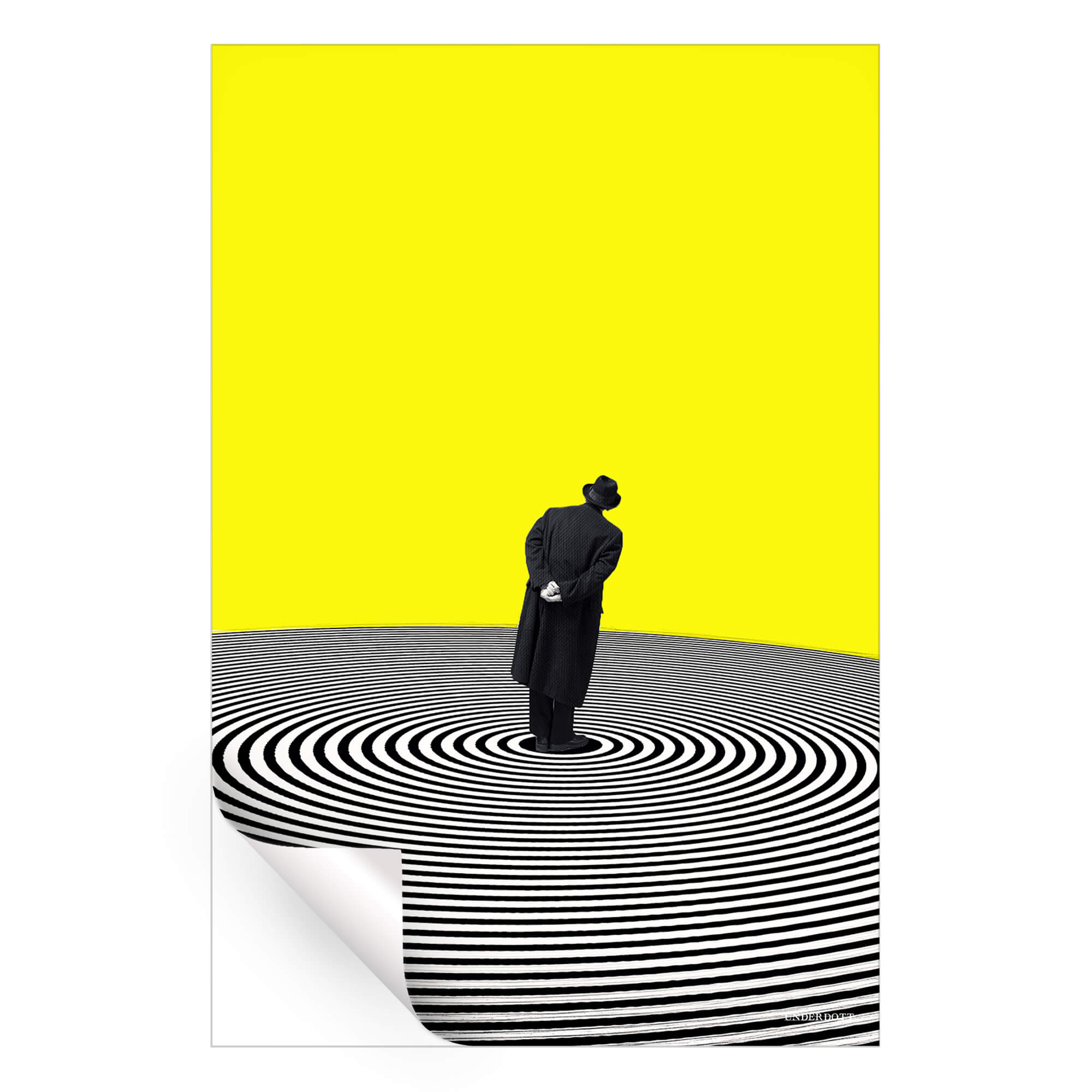 A field of vivid yellow occupies the top two-thirds of the composition, flat and unbroken like an endless sky. Below the horizon line, perfectly spaced black and white rings ripple outward, forming a bold geometric vortex. At the exact center stands a solitary figure in a dark overcoat and bowler hat, hands clasped behind his back, body tilted in quiet curiosity. The simplified silhouette pops against the high-contrast pattern, turning ordinary posture into silent storytelling. Light seems to press down from the neon plane above, while the optical ground appears to pull inward, creating a push-and-pull tension that feels oddly calming. Each concentric stripe is razor sharp on the ArtFab fabric, exaggerating depth and drawing the viewer’s gaze to the center. Subtle texture within the rings hints at motion, yet the stillness of the observer keeps the scene balanced. Minimal palette, maximum intrigue.